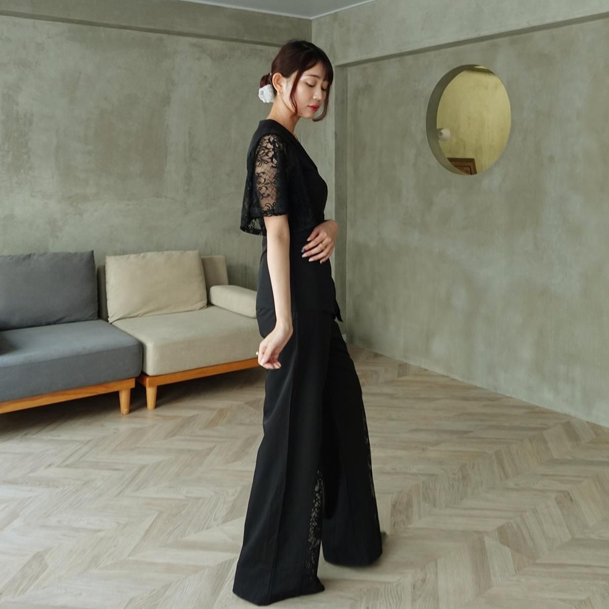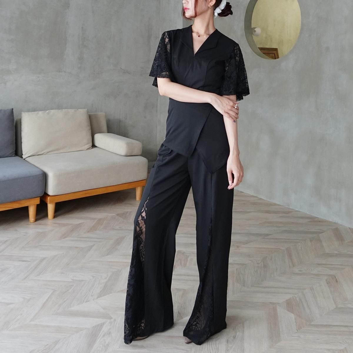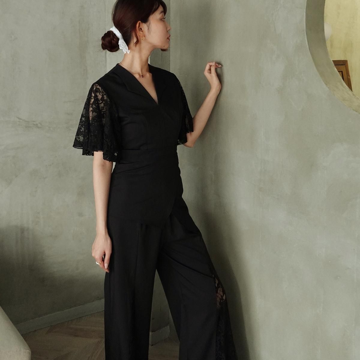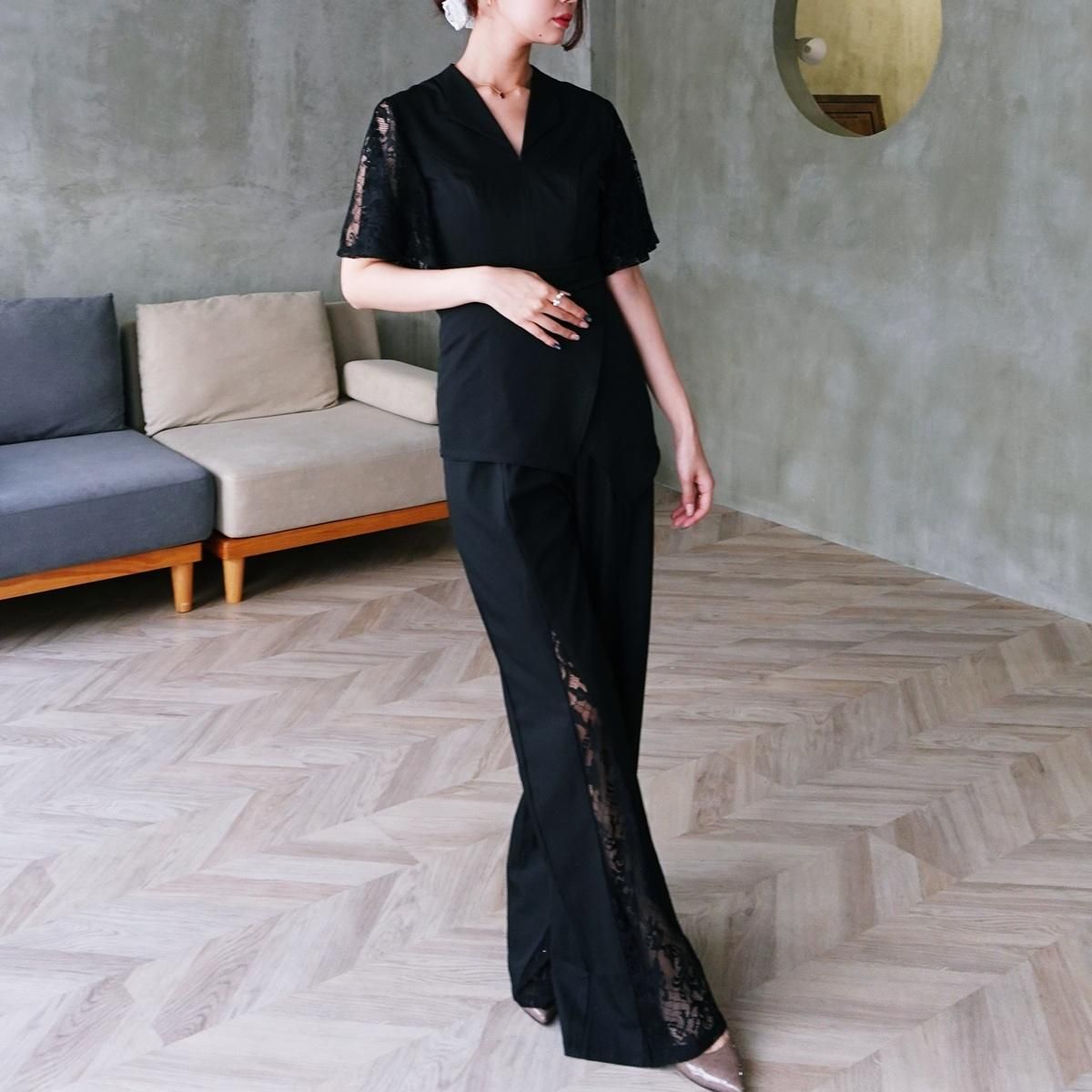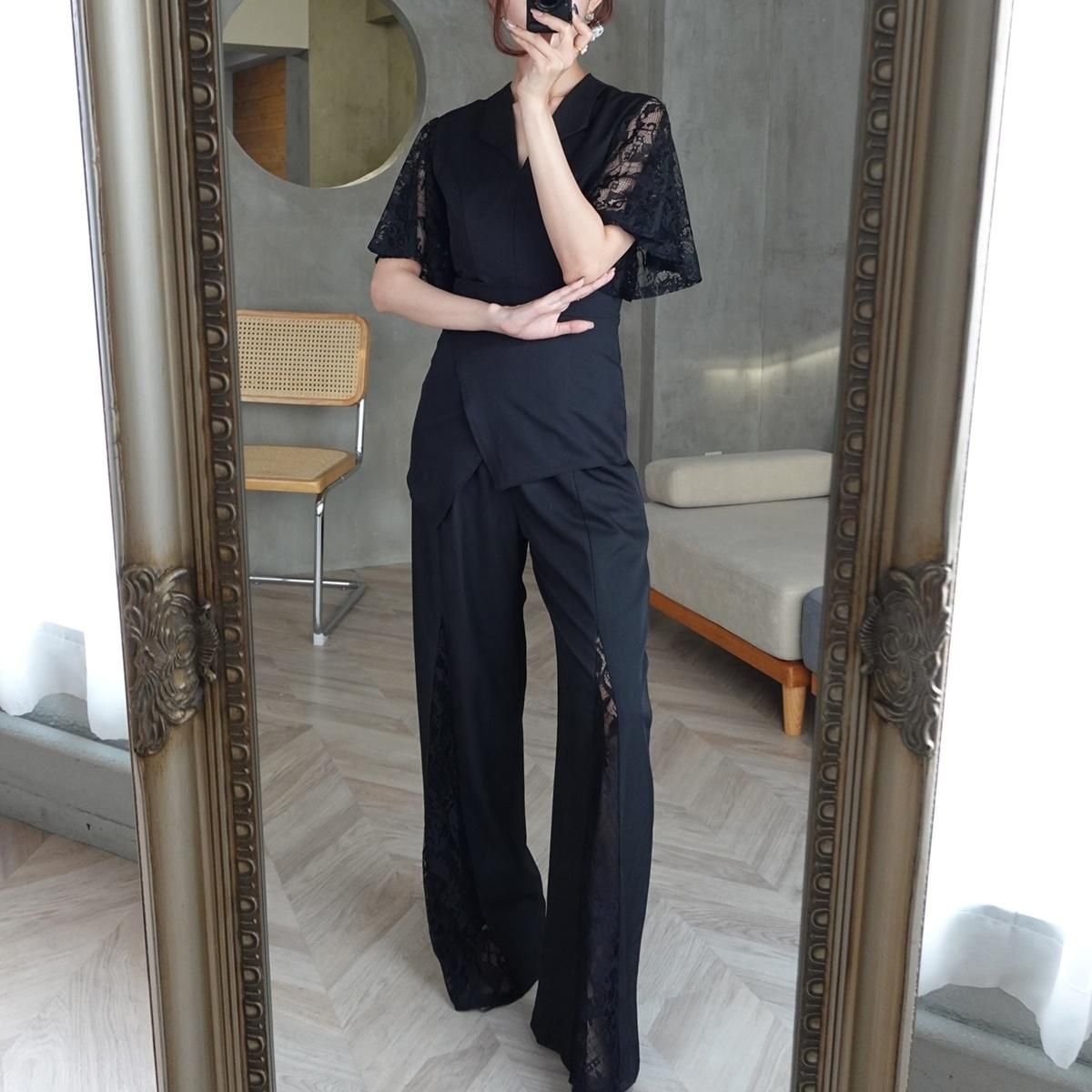 ワイドパンツ×花柄レースが足を長く、きれいに見せてくれます。