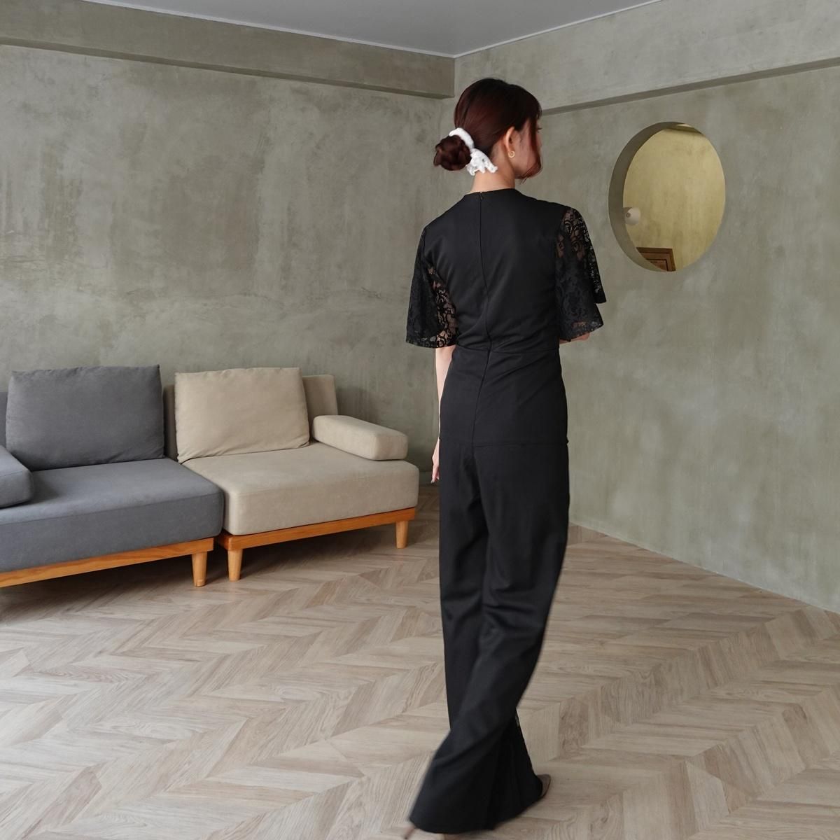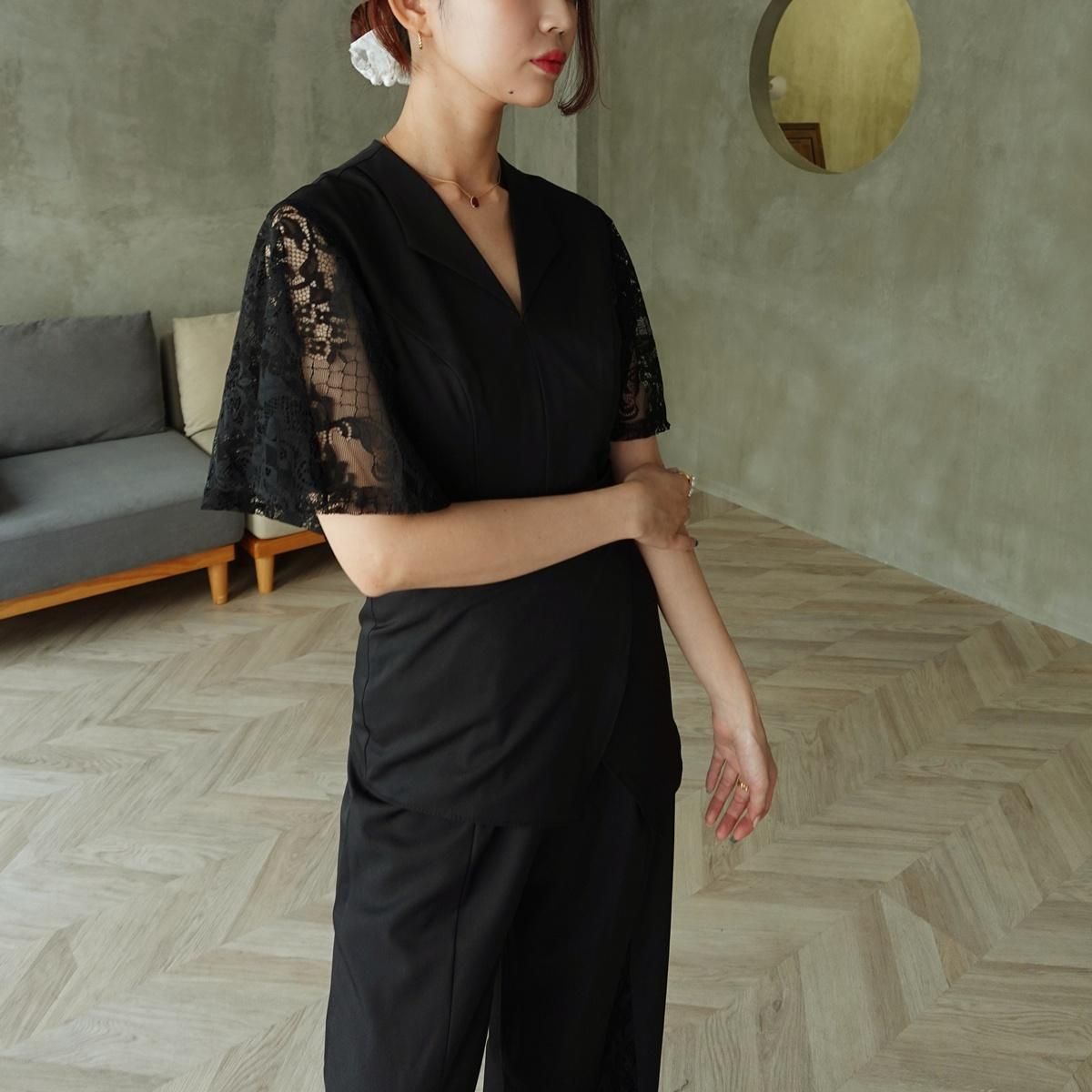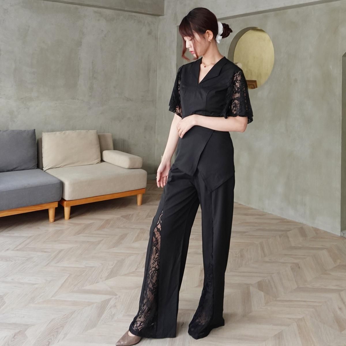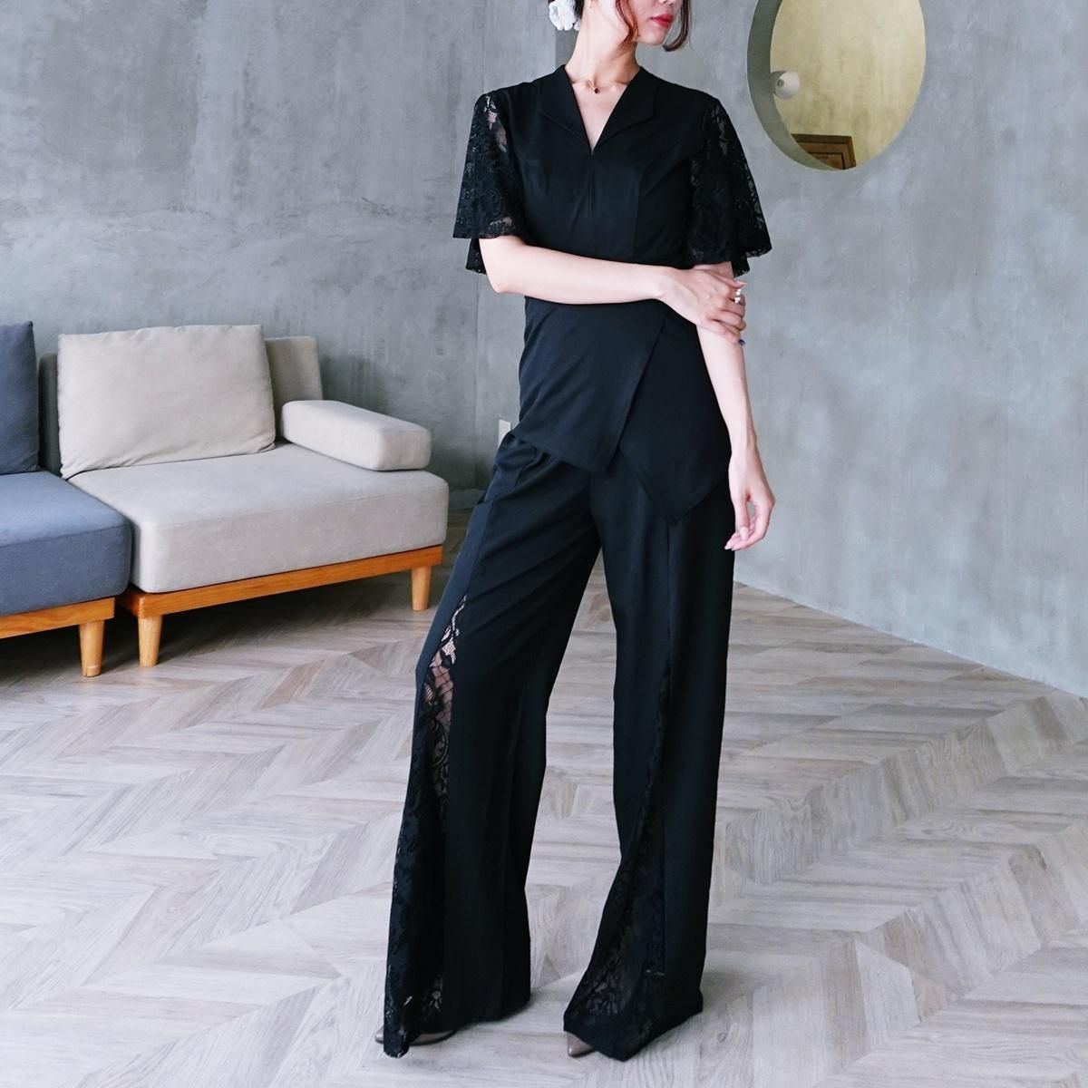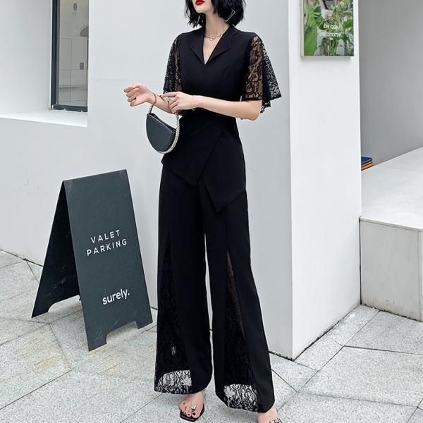 ワイドパンツ×花柄レースが足を長く、きれいに見せてくれます。