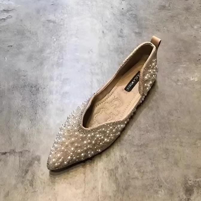 散りばめられたパールが、どの角度から見てもかわいいフラットパンプス。