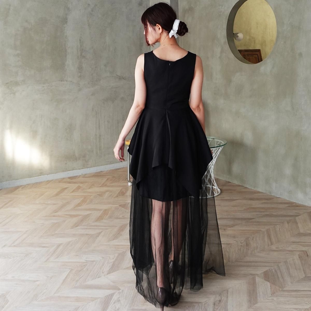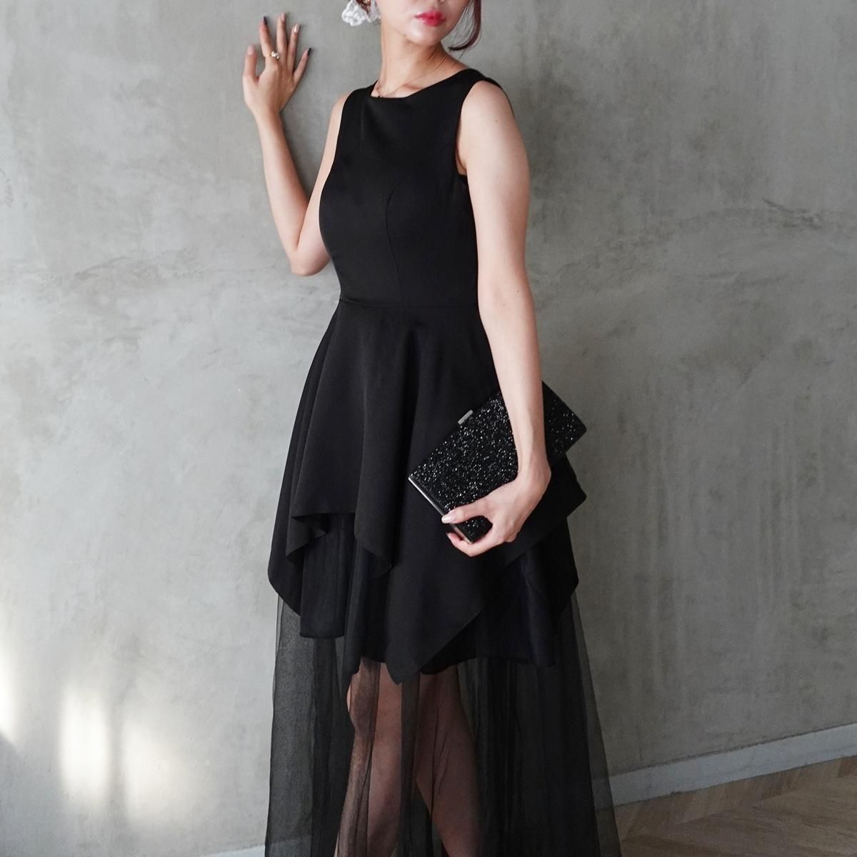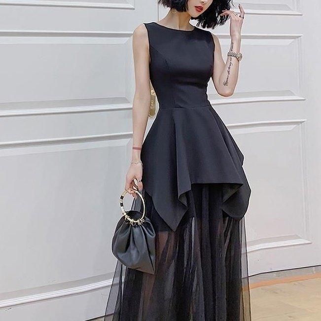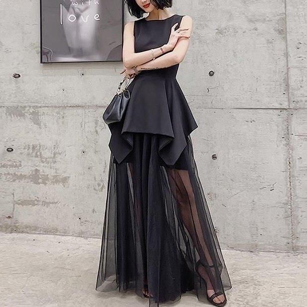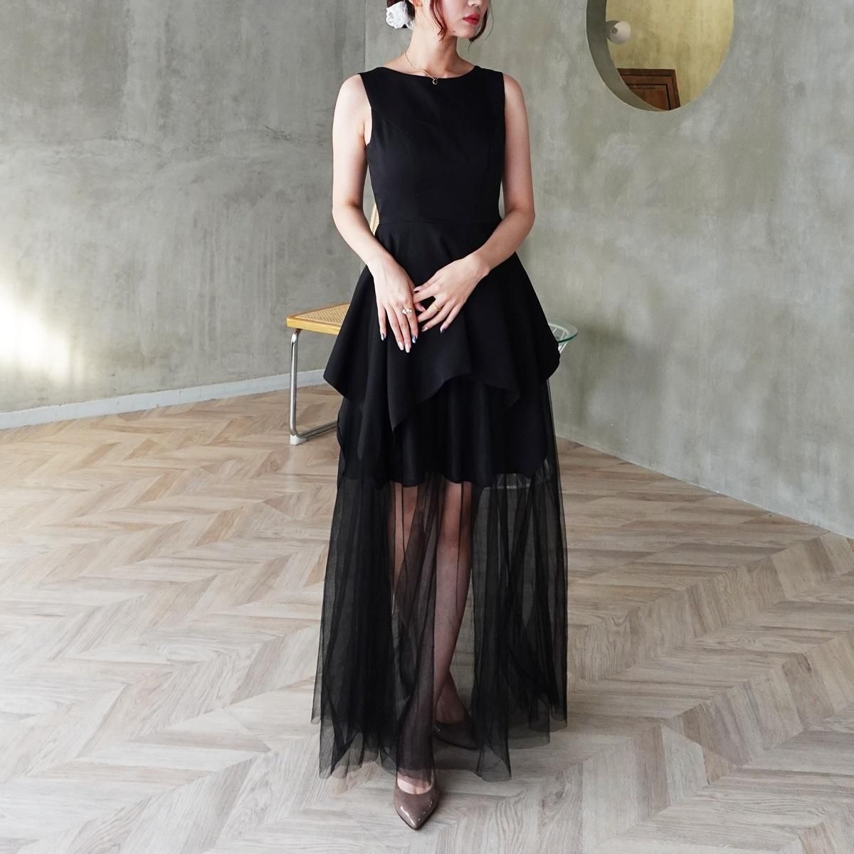 ドレス ペプラム 切り替え シアー Aライン クルーネック ノースリーブ ロングドレス ハイウェスト エレガント シック 二次会 パーティー お呼ばれ