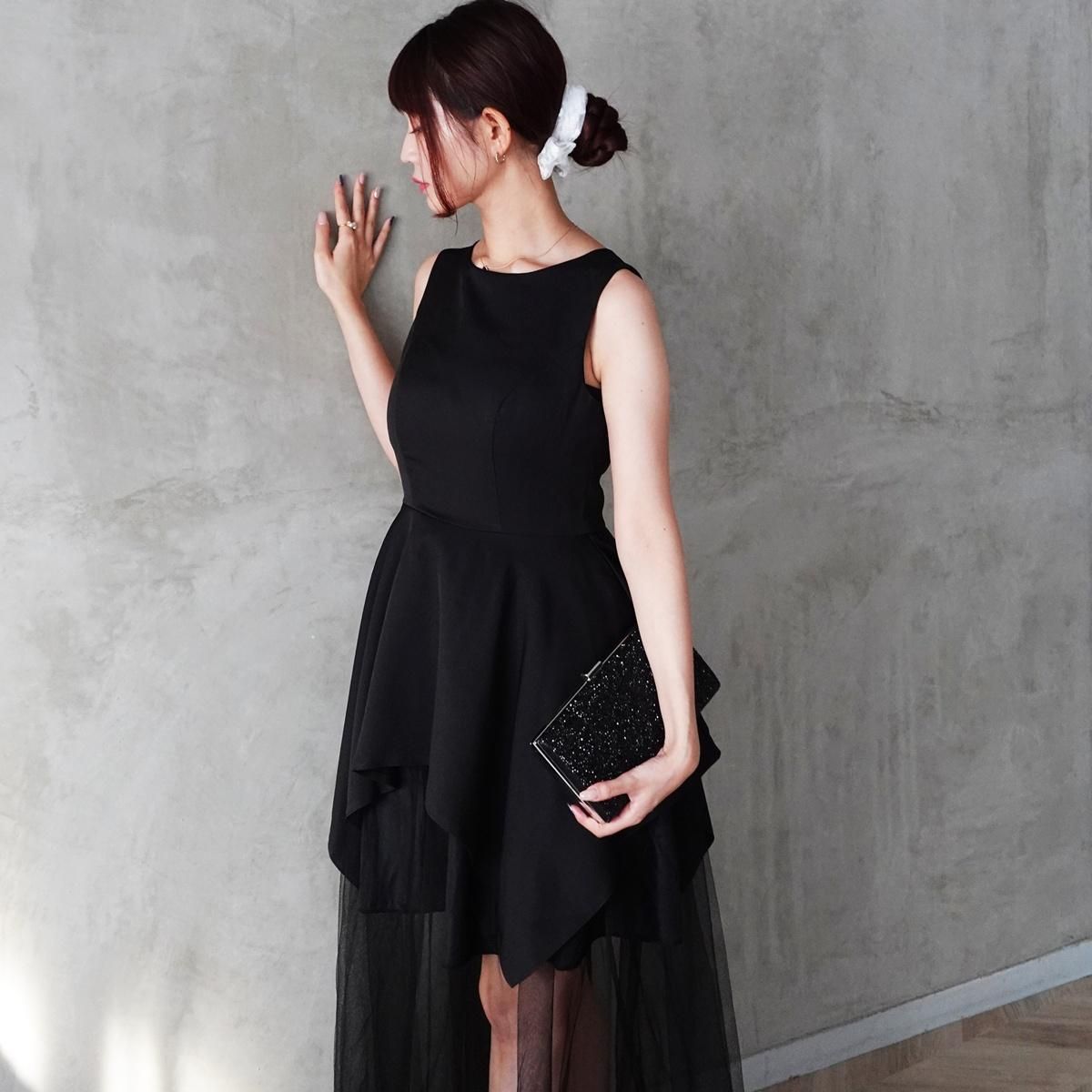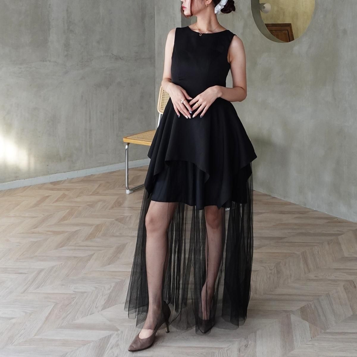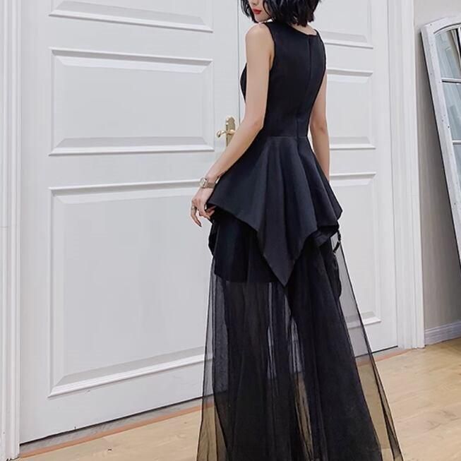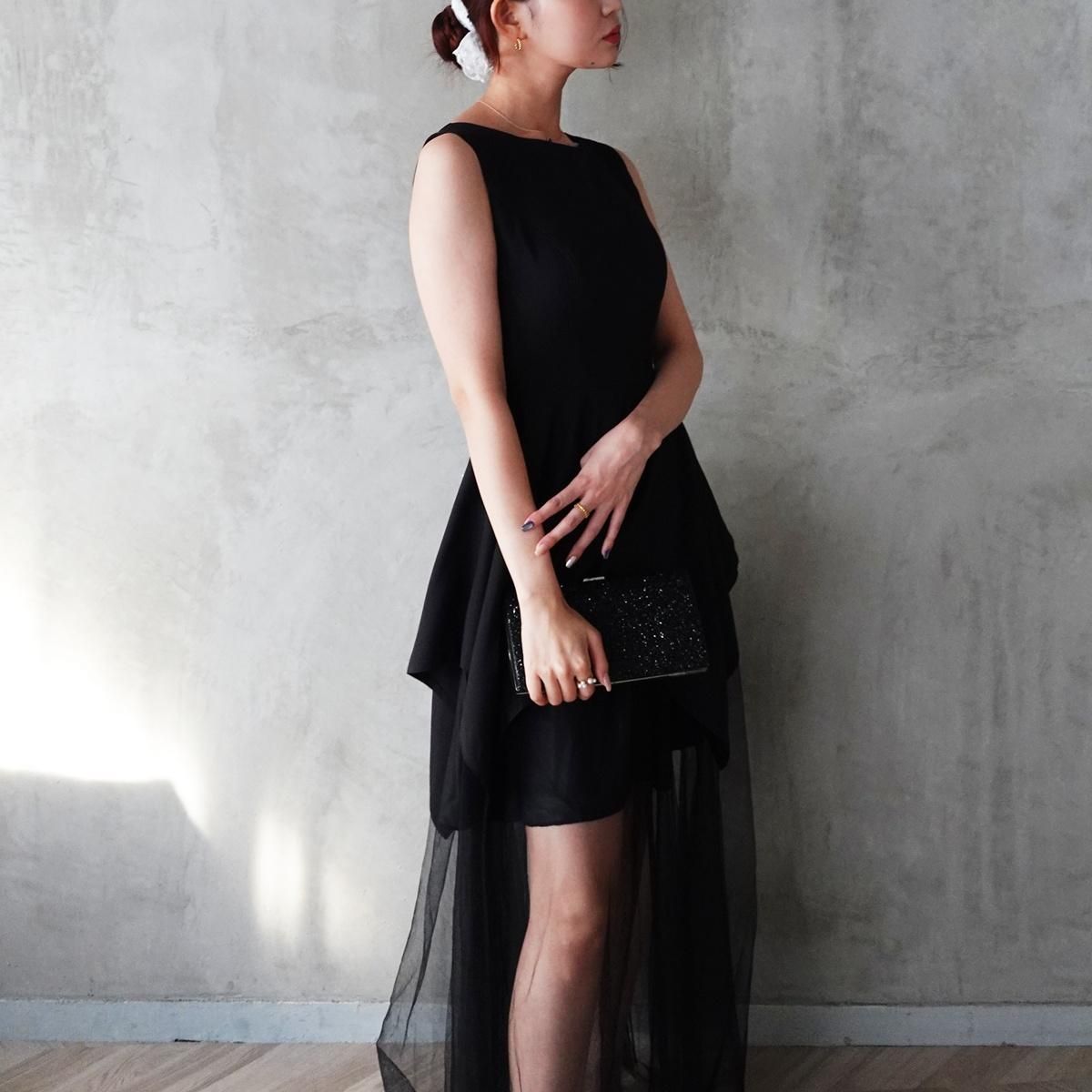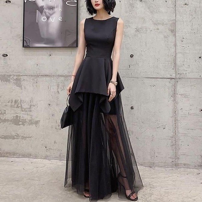 ドレス ペプラム 切り替え シアー Aライン クルーネック ノースリーブ ロングドレス ハイウェスト エレガント シック 二次会 パーティー お呼ばれ