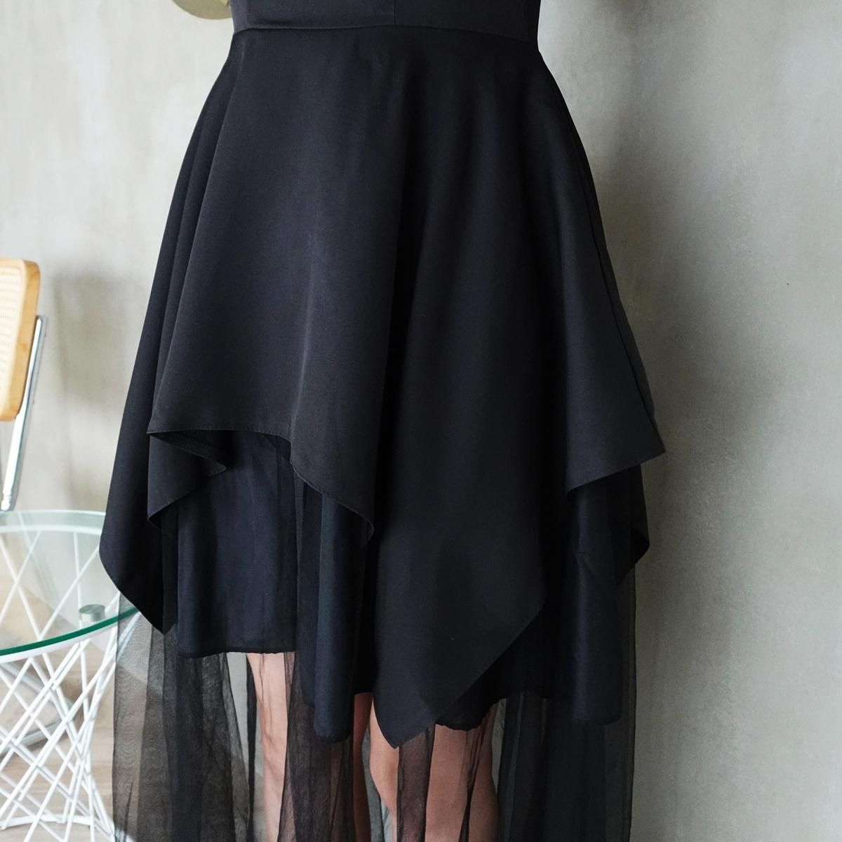 トップはすっきり、スカートにボリュームがあり、華やかに見えます。