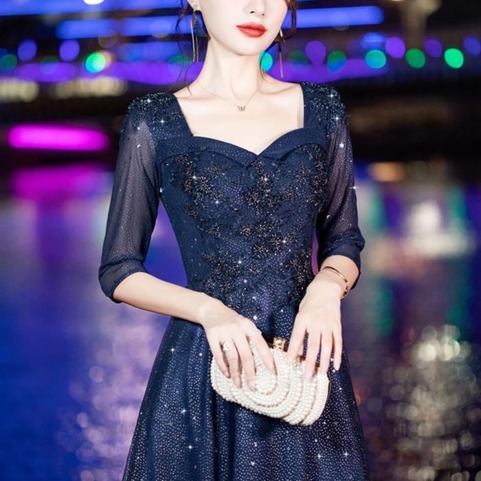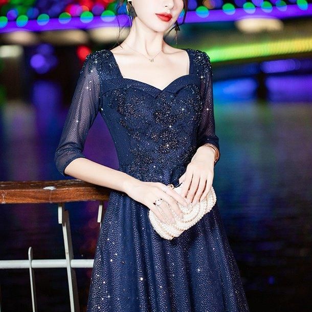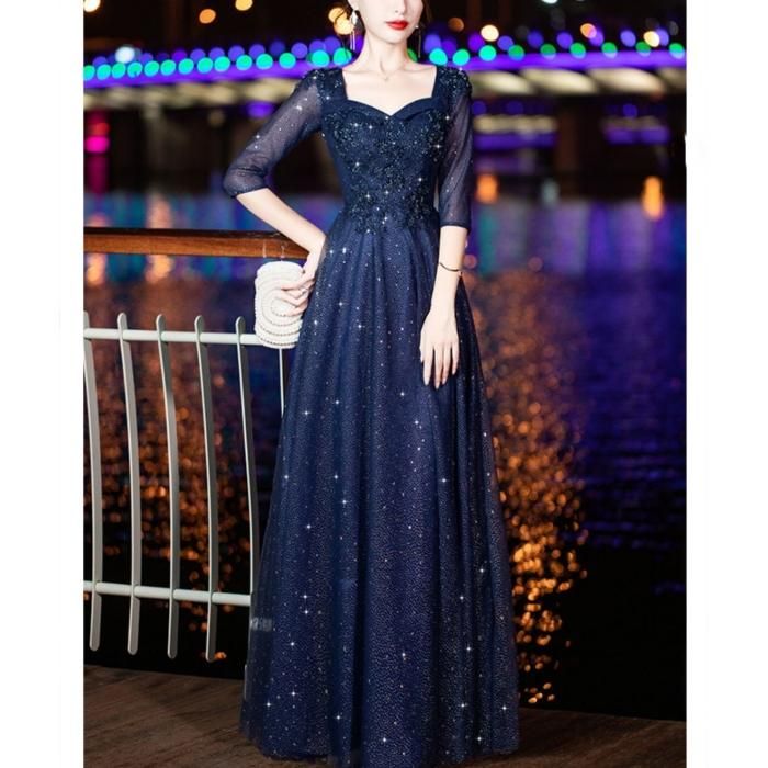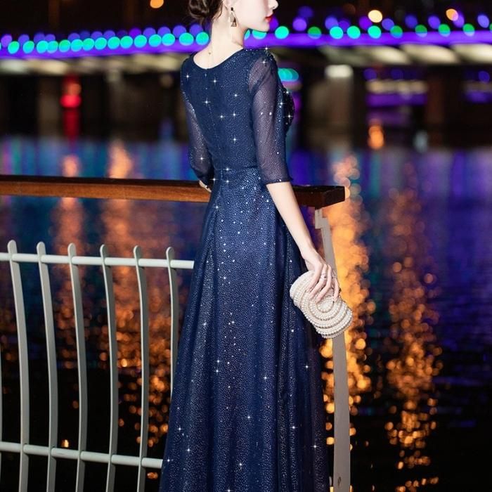 夜空のような深いブルーにスパンコールがおしゃれなAラインロングドレス。