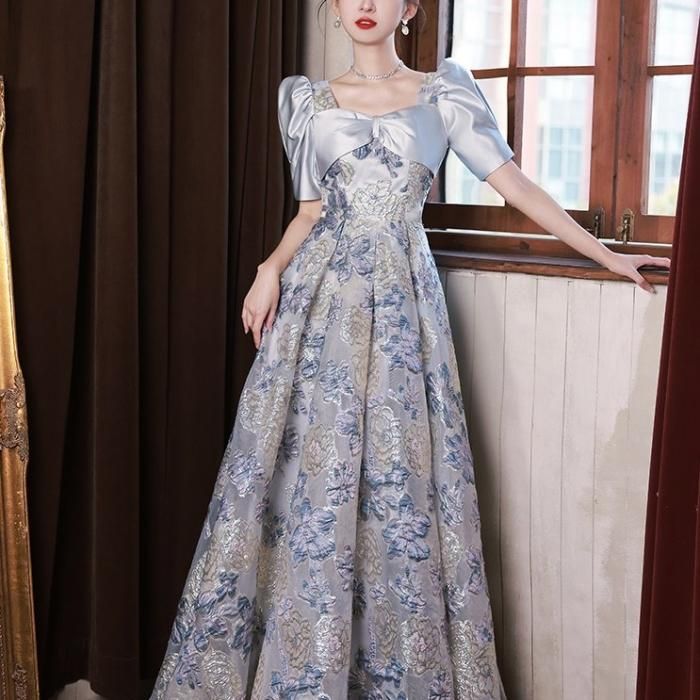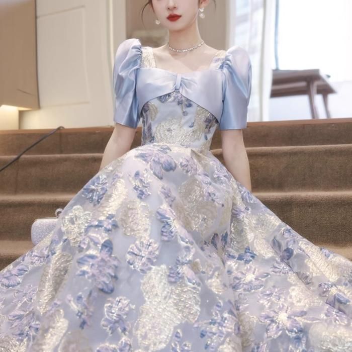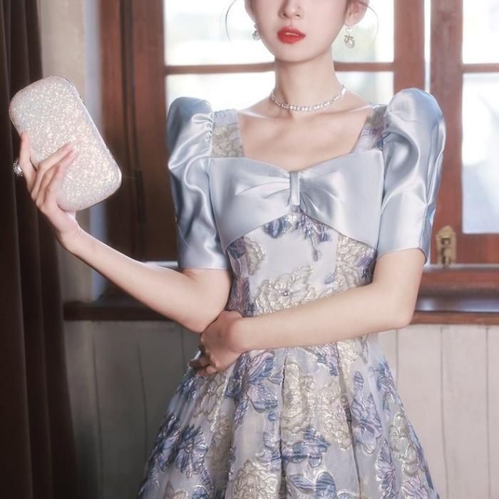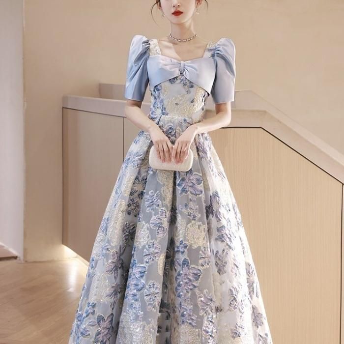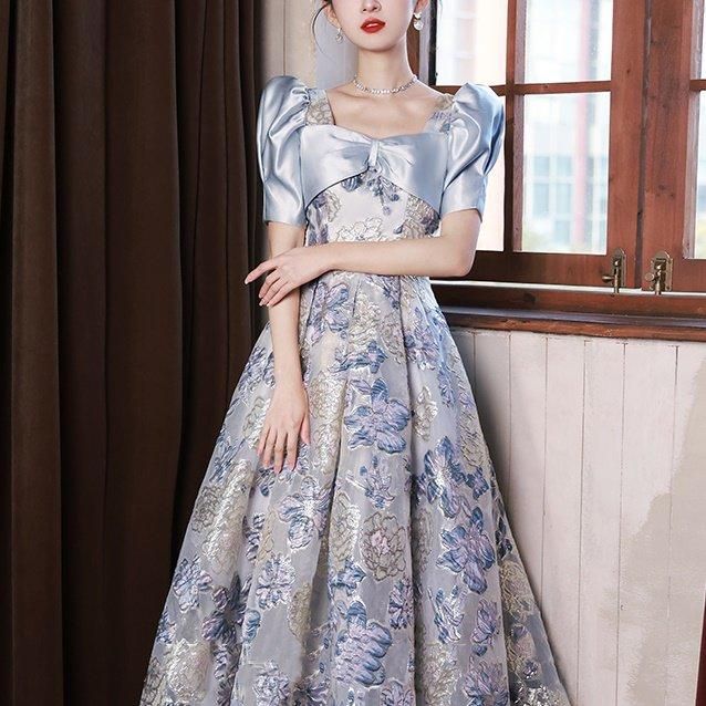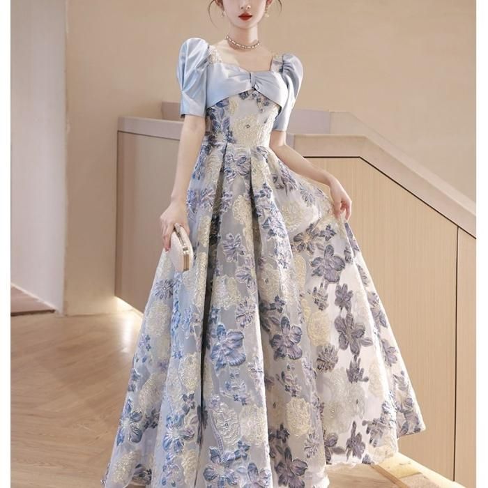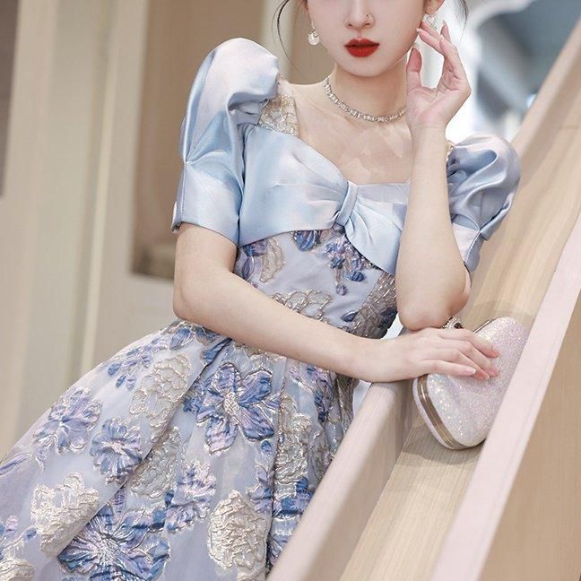 淡い色合いと生地の光沢感で爽やかな華やかさのあるドレスです。