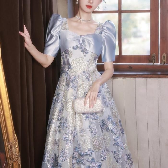 フラワー刺繍がポイントのAラインドレス。