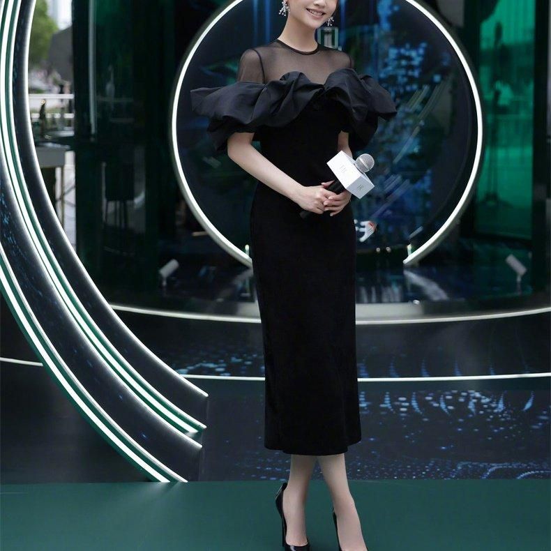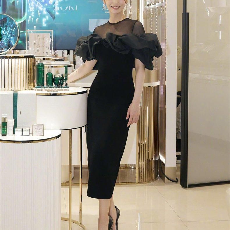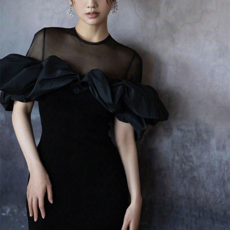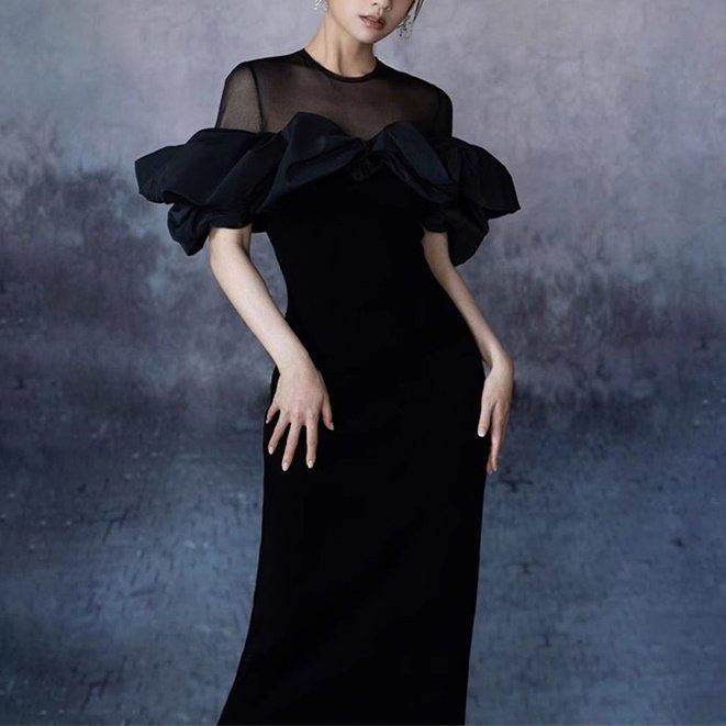 胸元のフリルが華やかなシアーオフショルダードレス。
