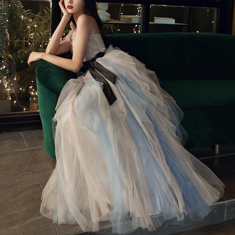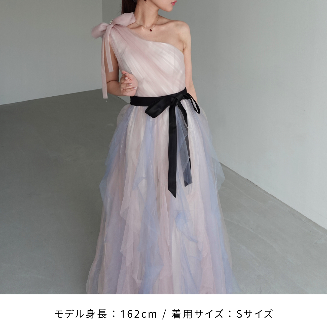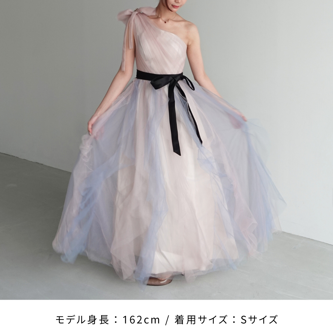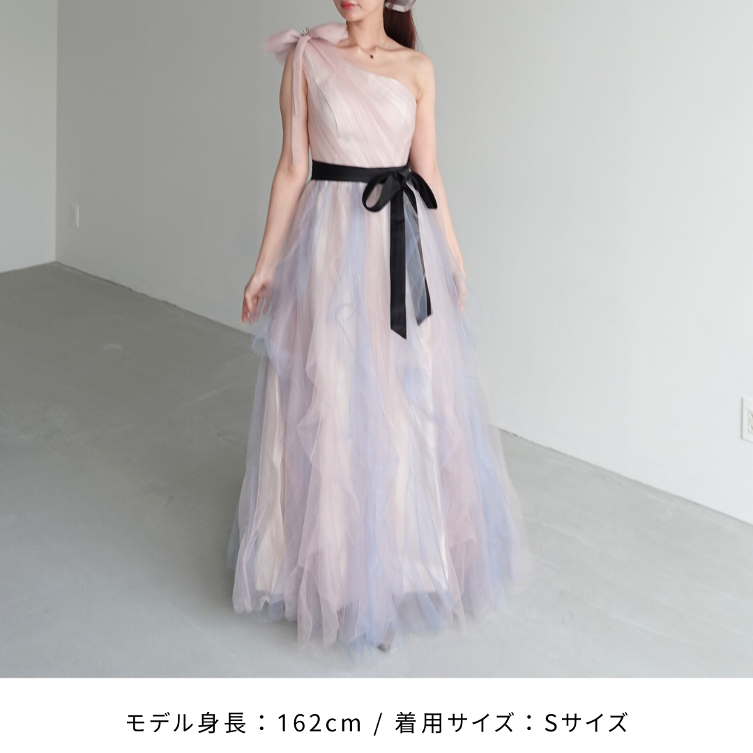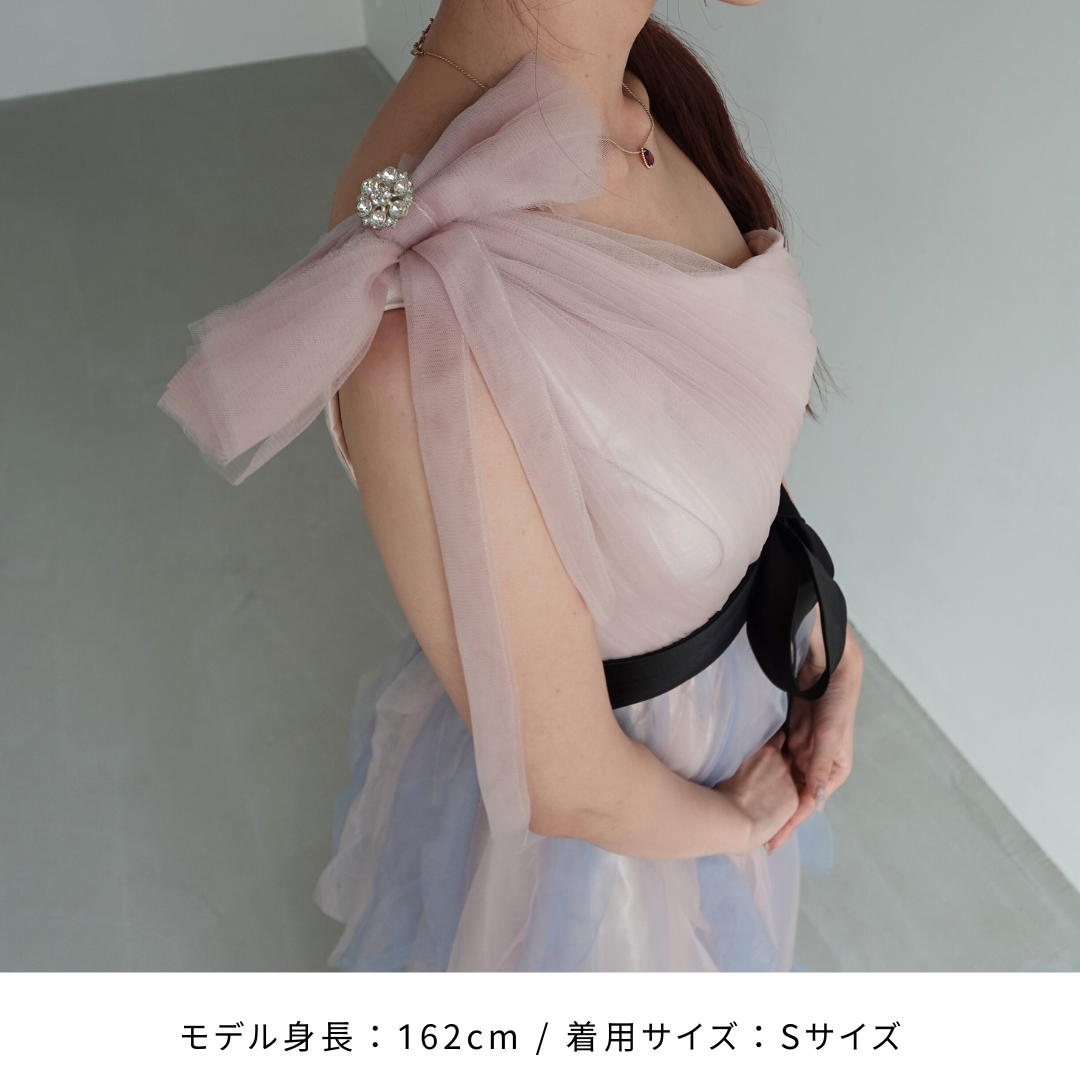 肩のリボンやウェストリボンが華やかで、パーティーにぴったりです。