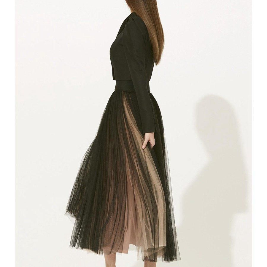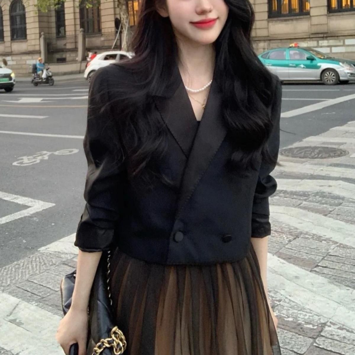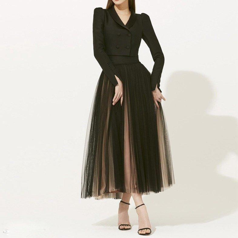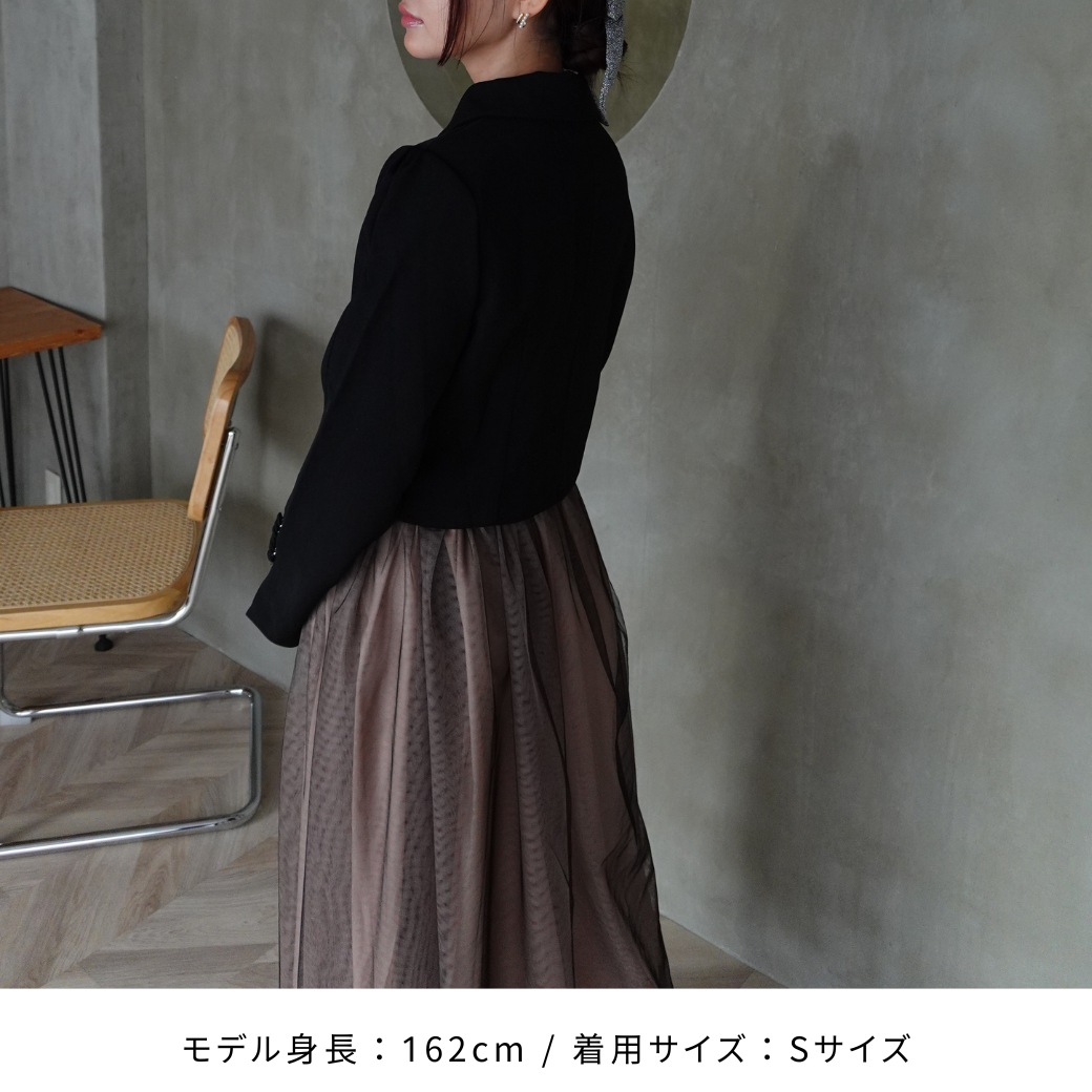 ショート丈ジャケットとチュールスカートのセットアップ。