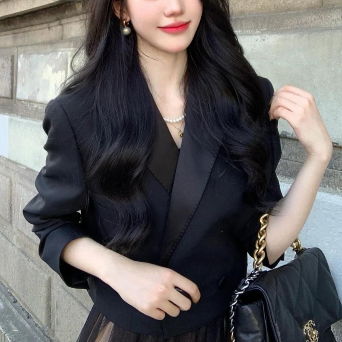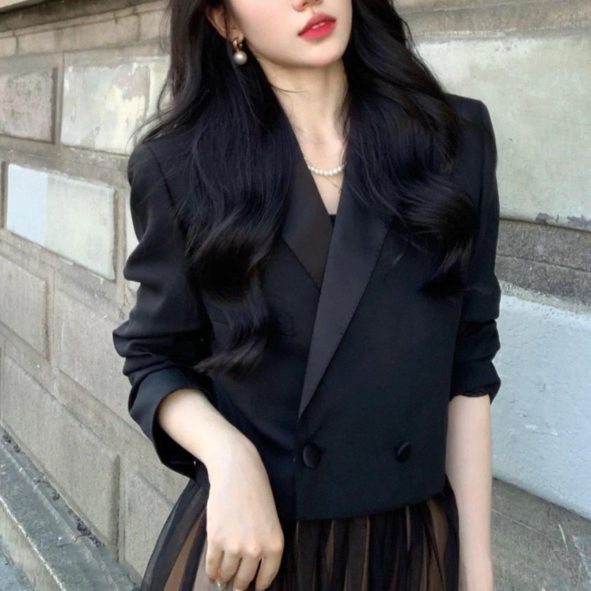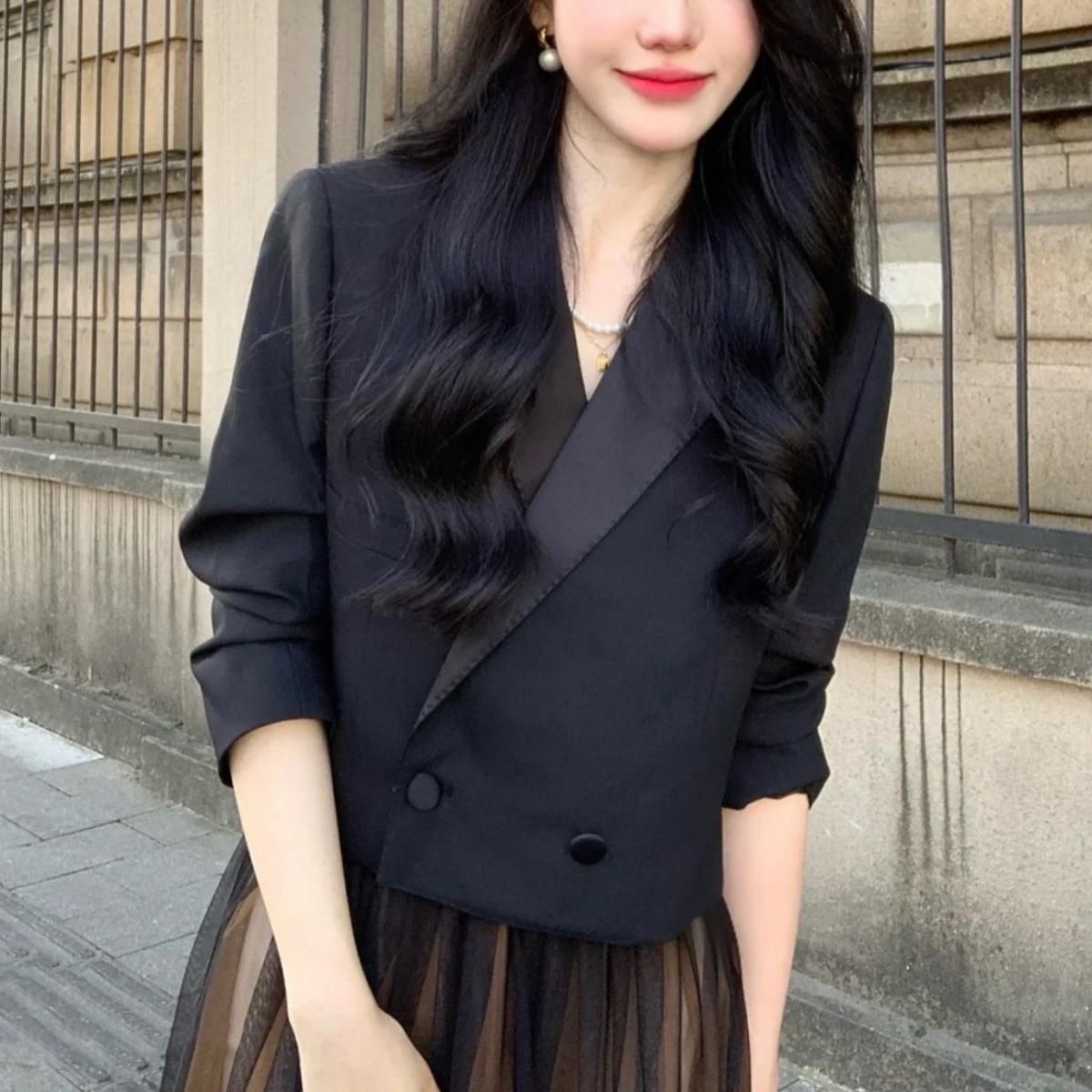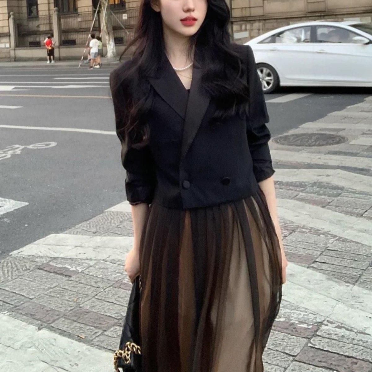 ショート丈ジャケットとチュールスカートのセットアップ。