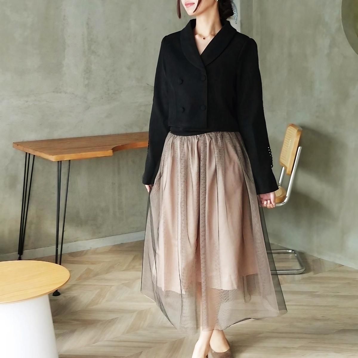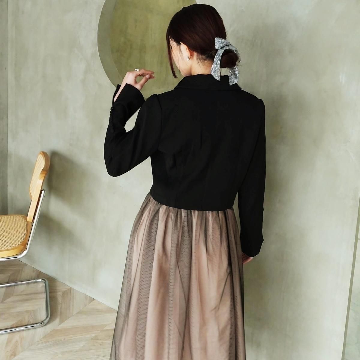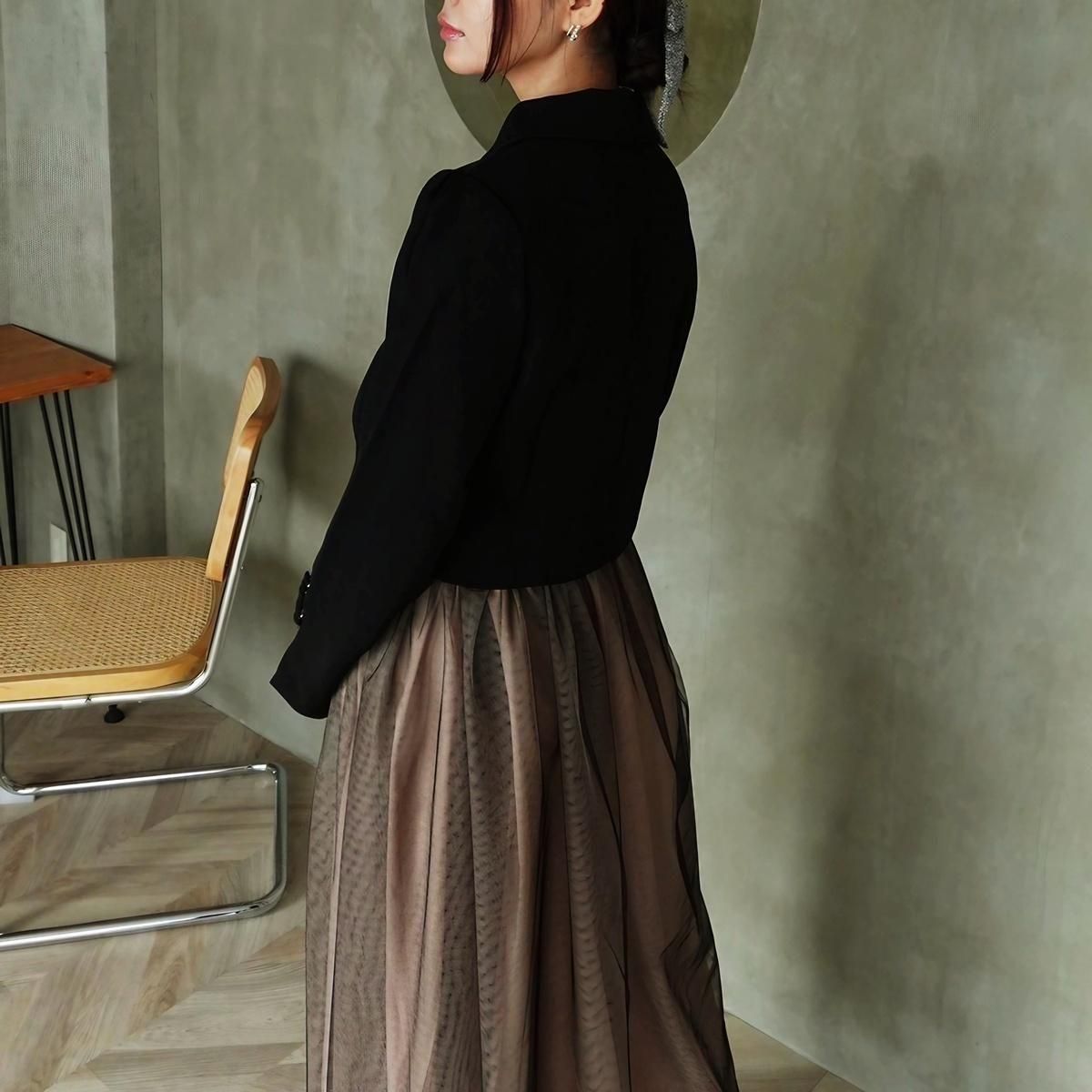 ショート丈ジャケットとチュールスカートのセットアップ。