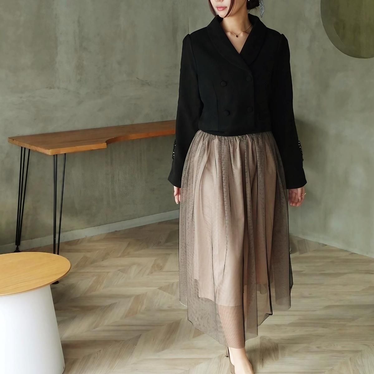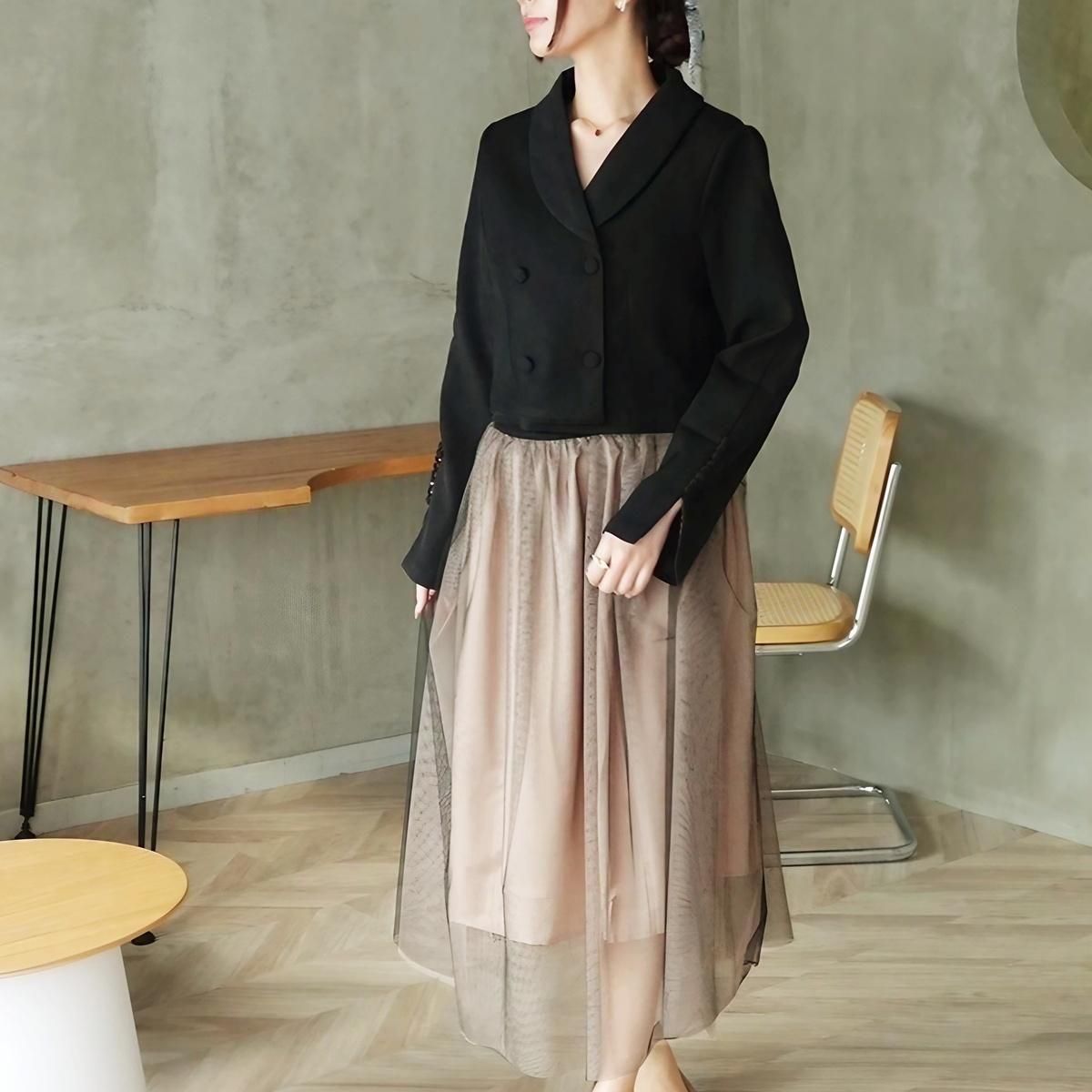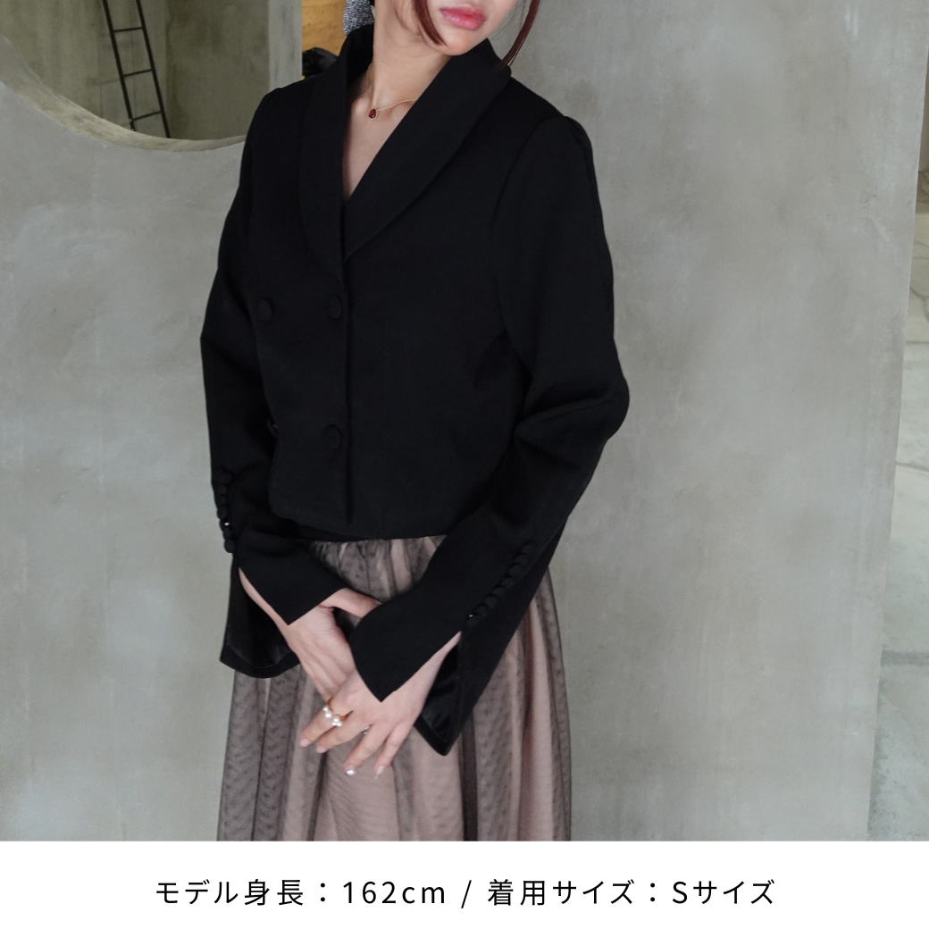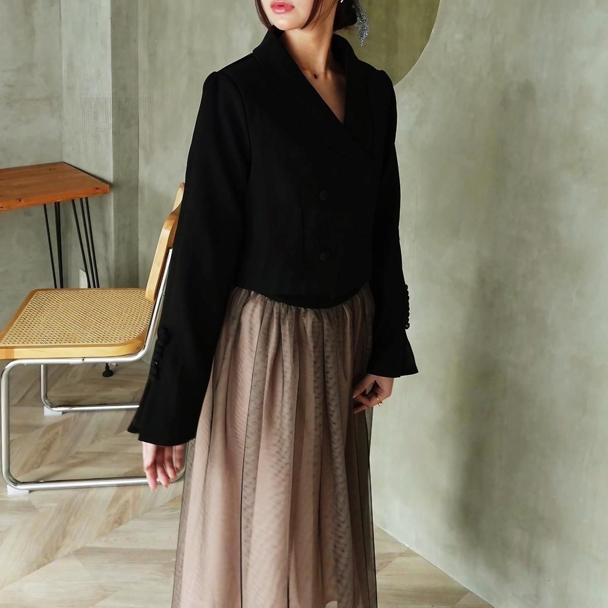 ショート丈ジャケットとチュールスカートのセットアップ。