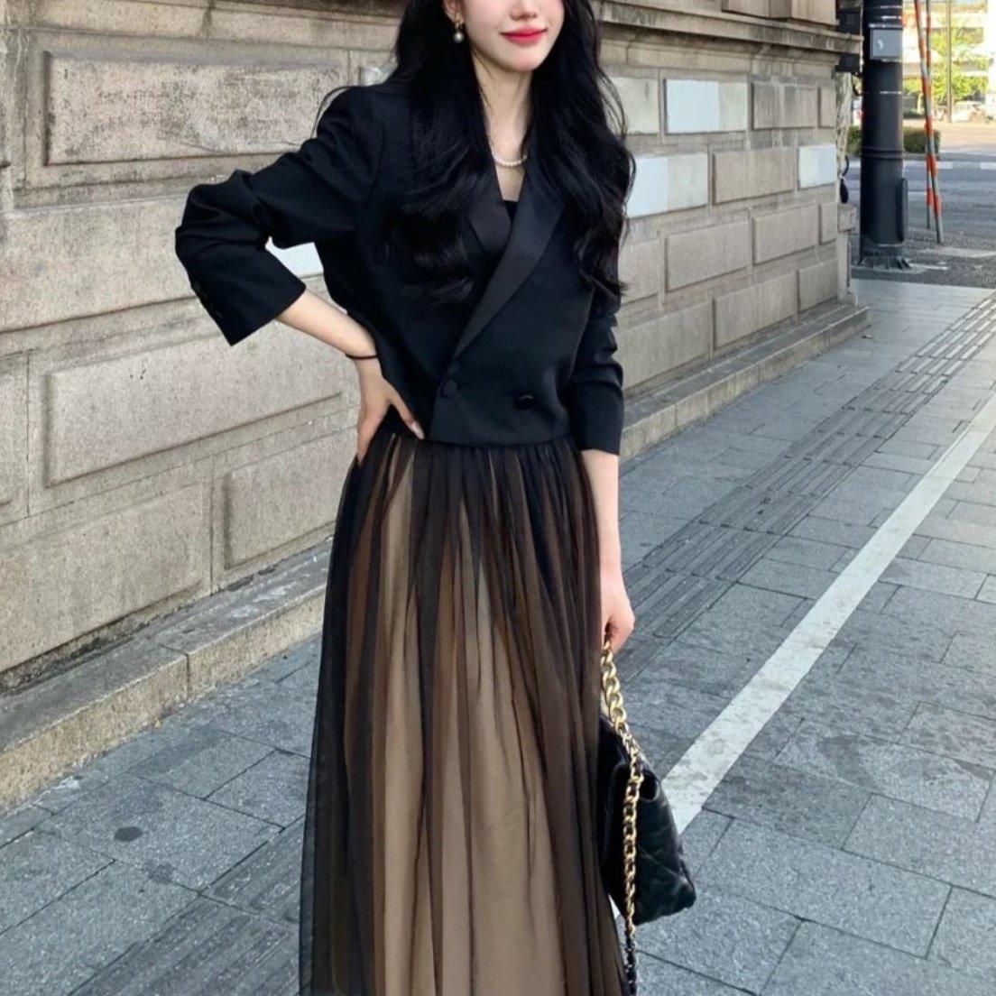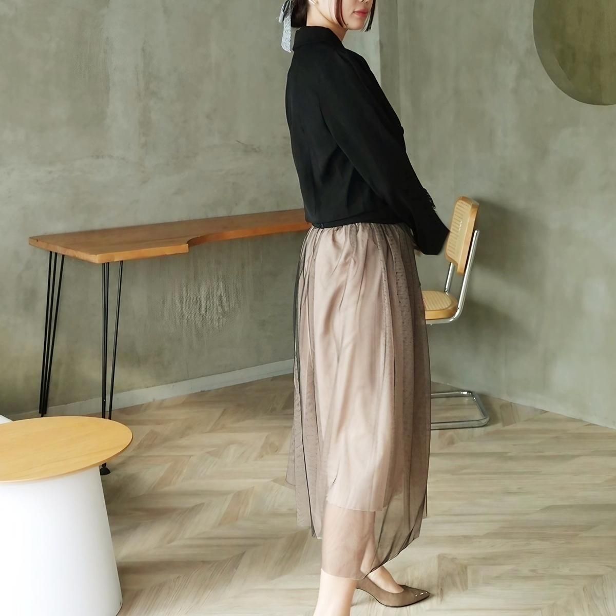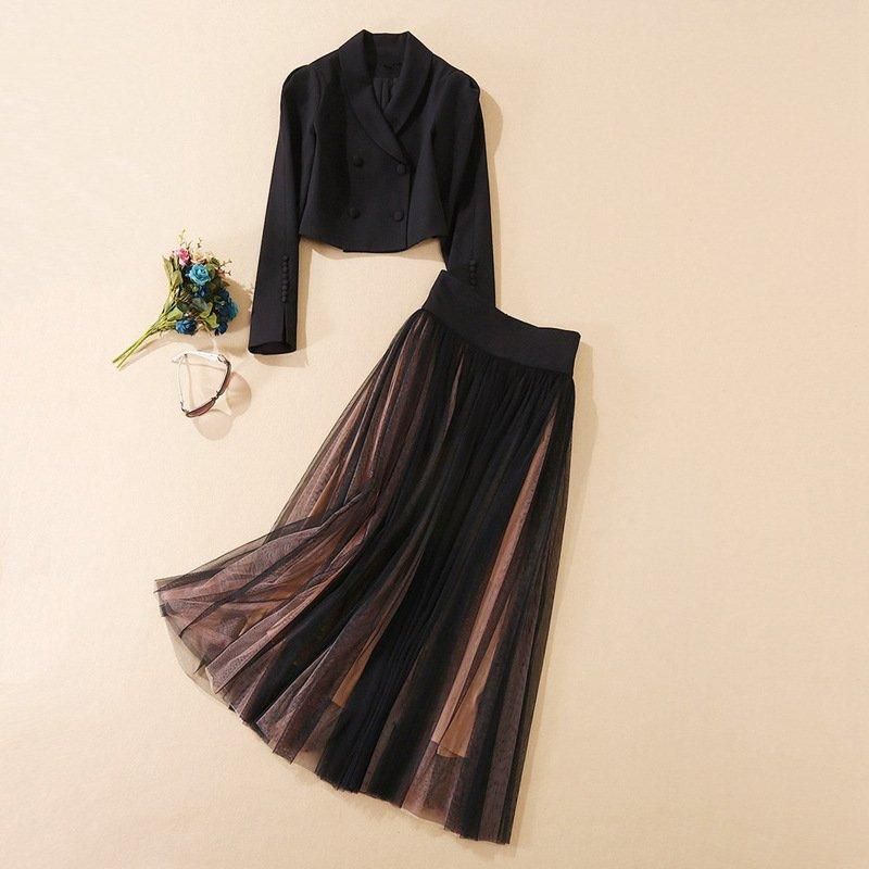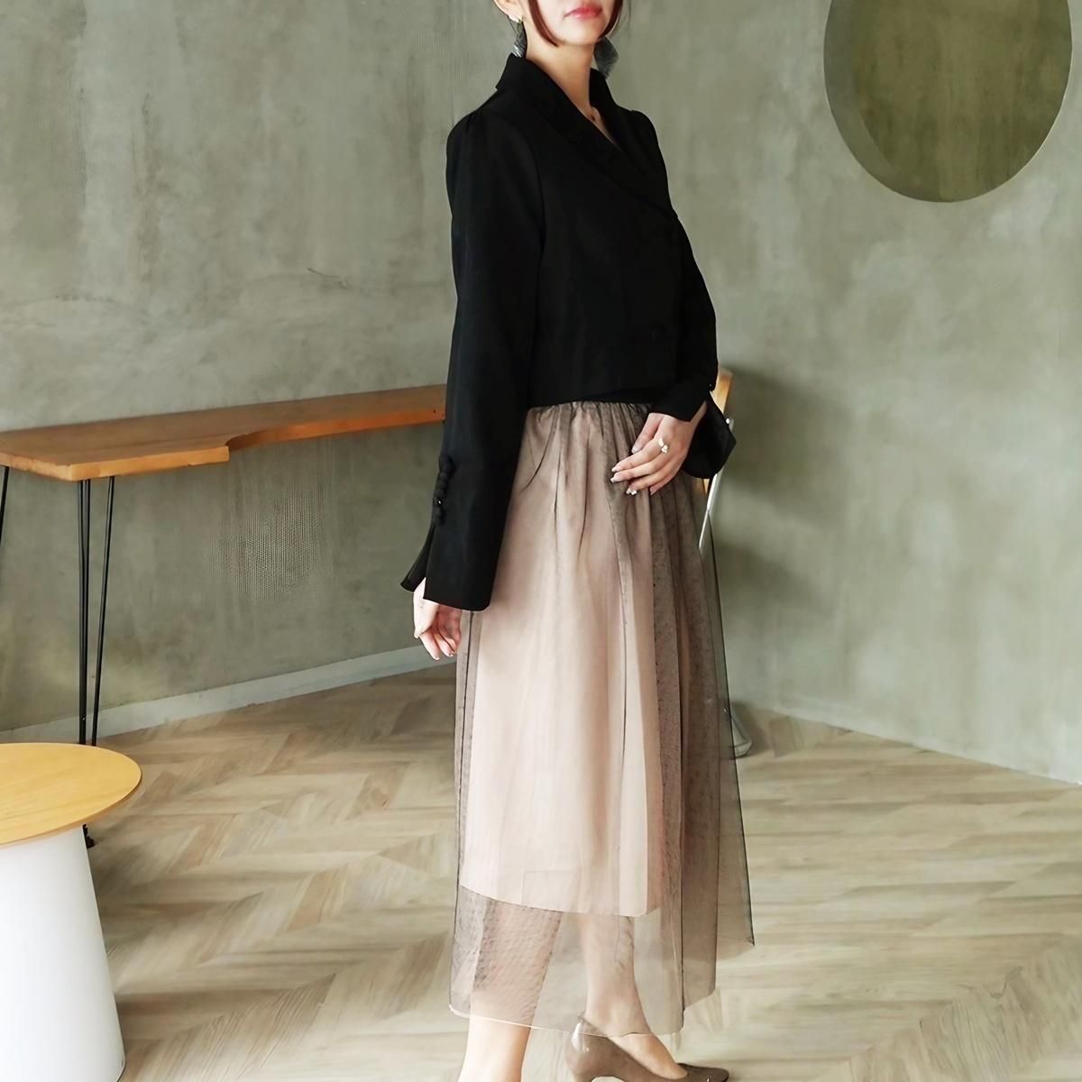ショート丈ジャケットとチュールスカートのセットアップ。