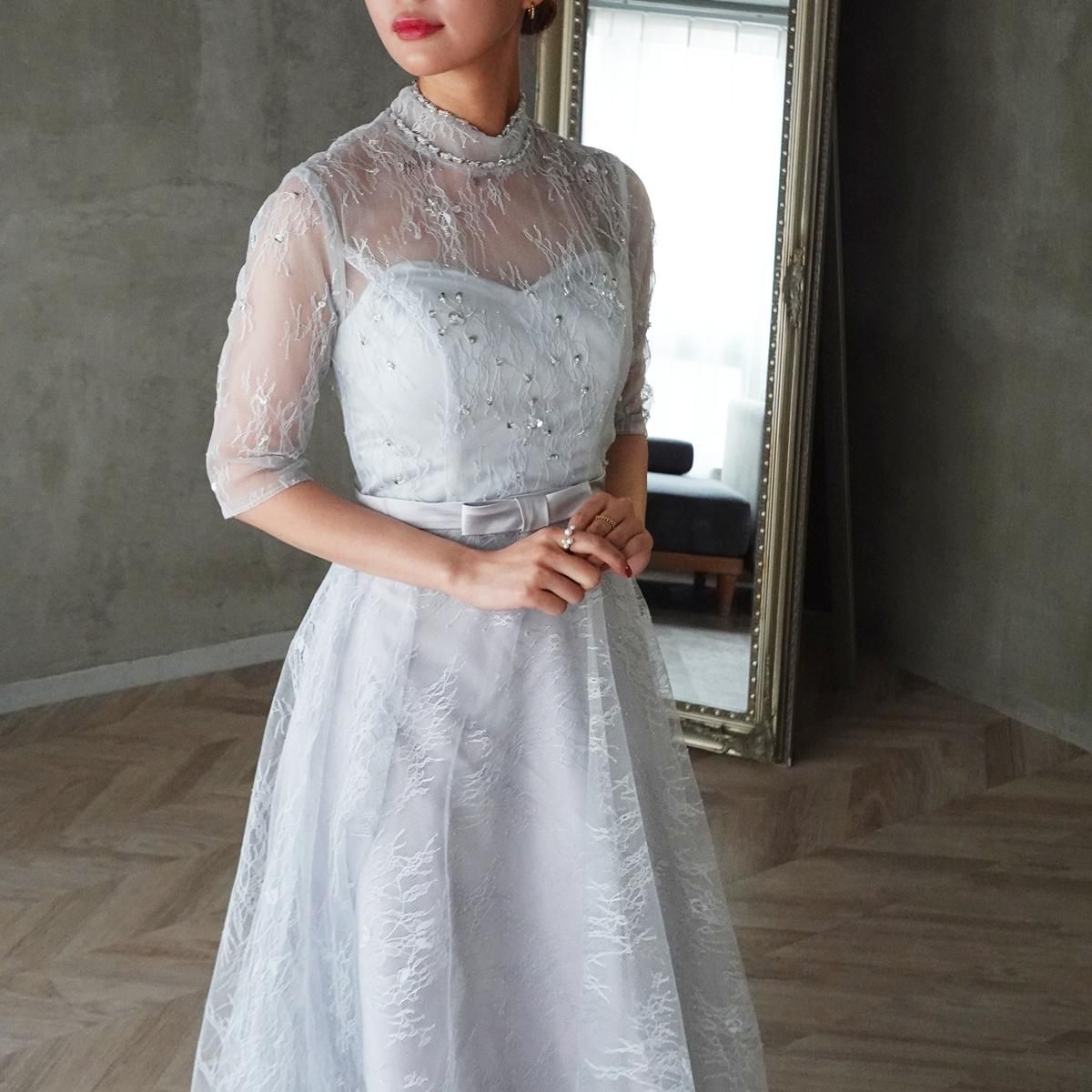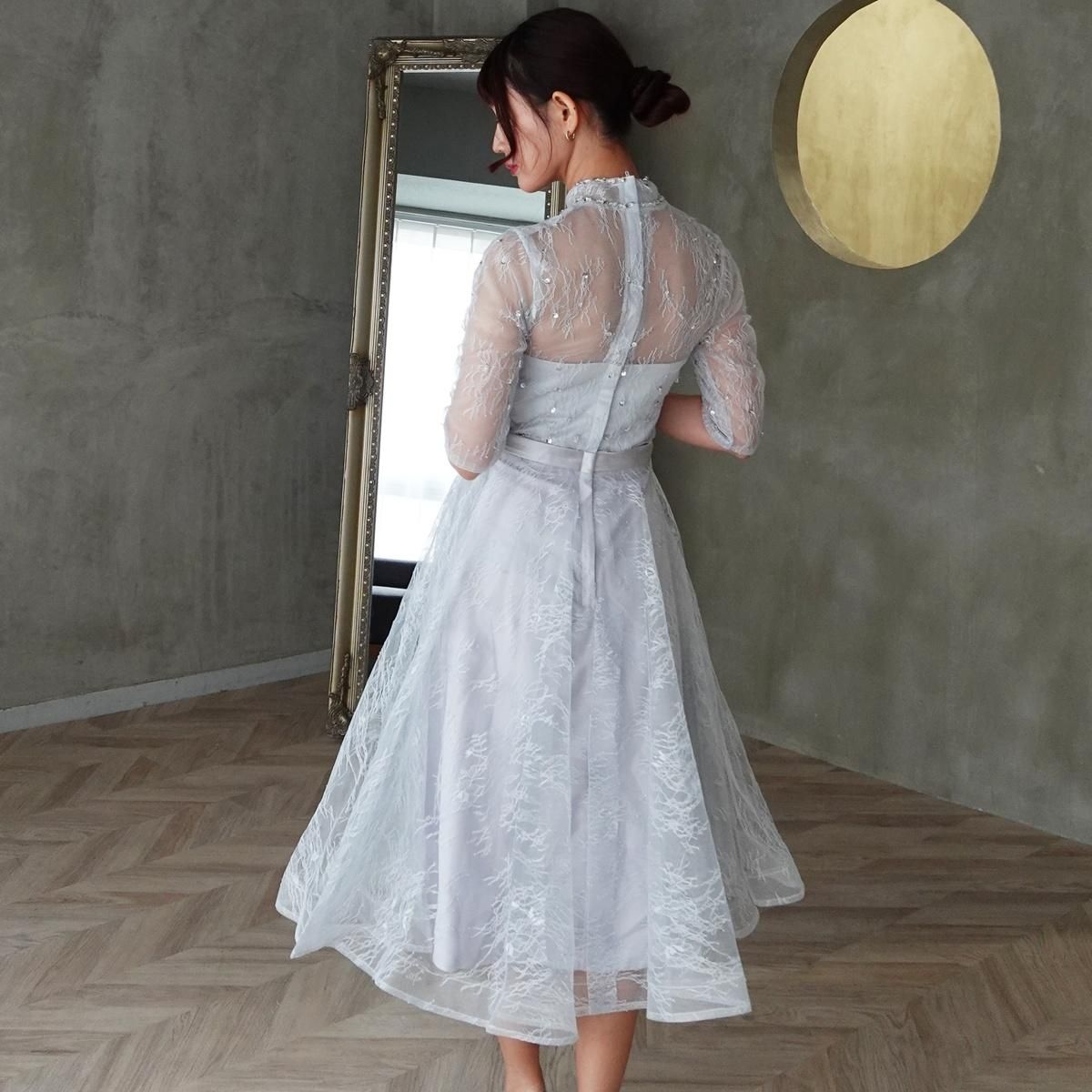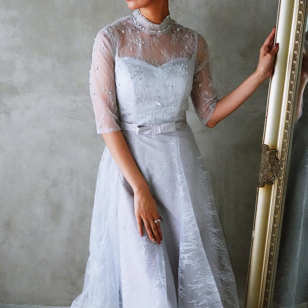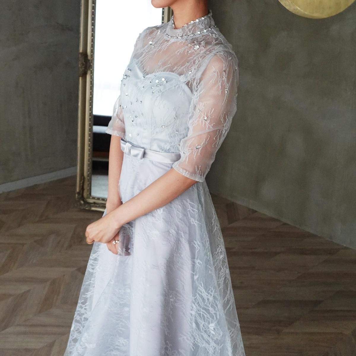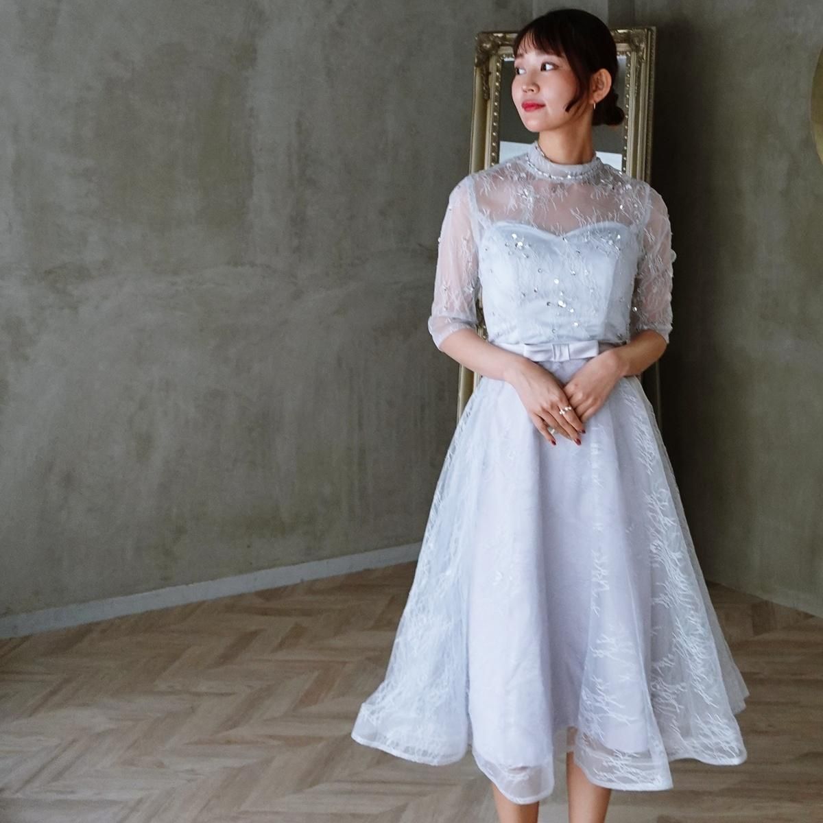 淡い色合いのレースにスパンコールが輝くAラインドレス。