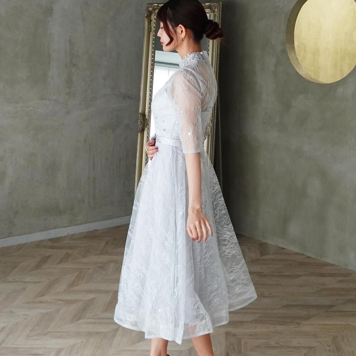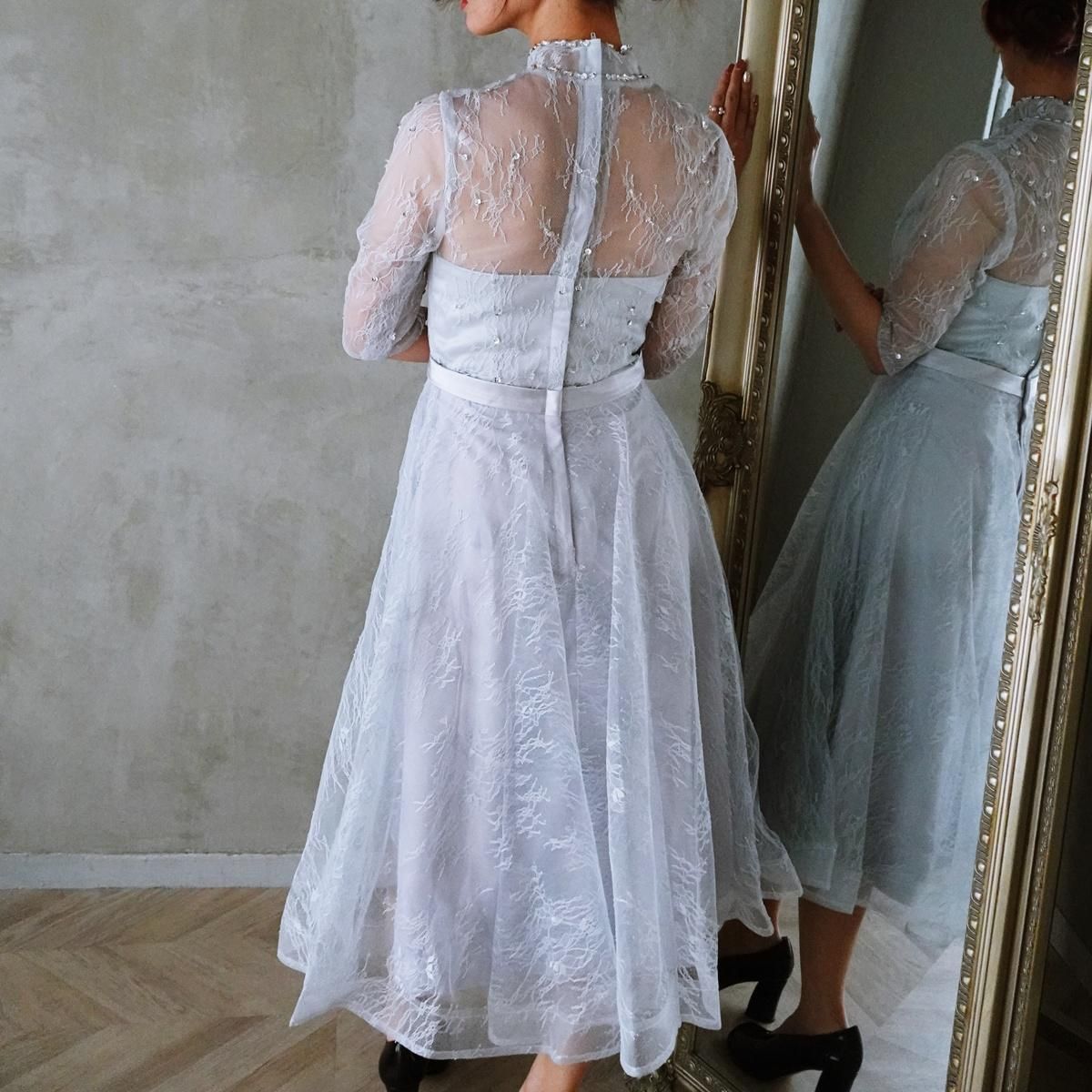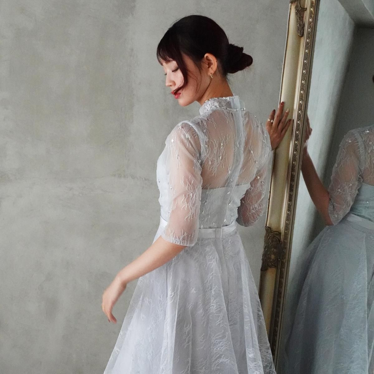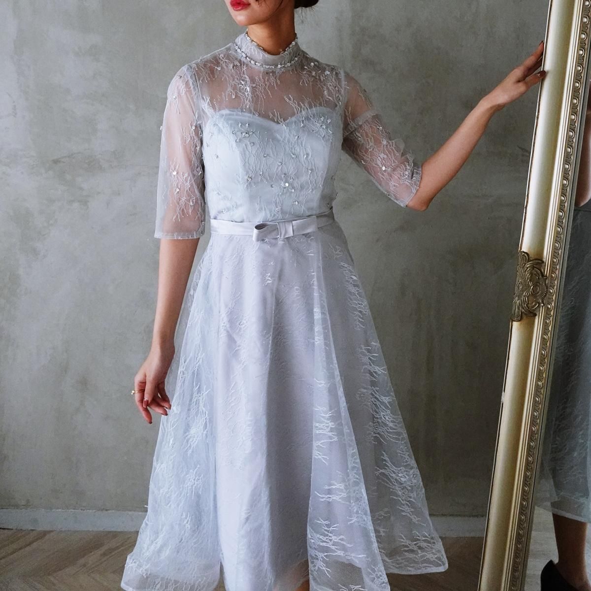 淡い色合いのレースにスパンコールが輝くAラインドレス。