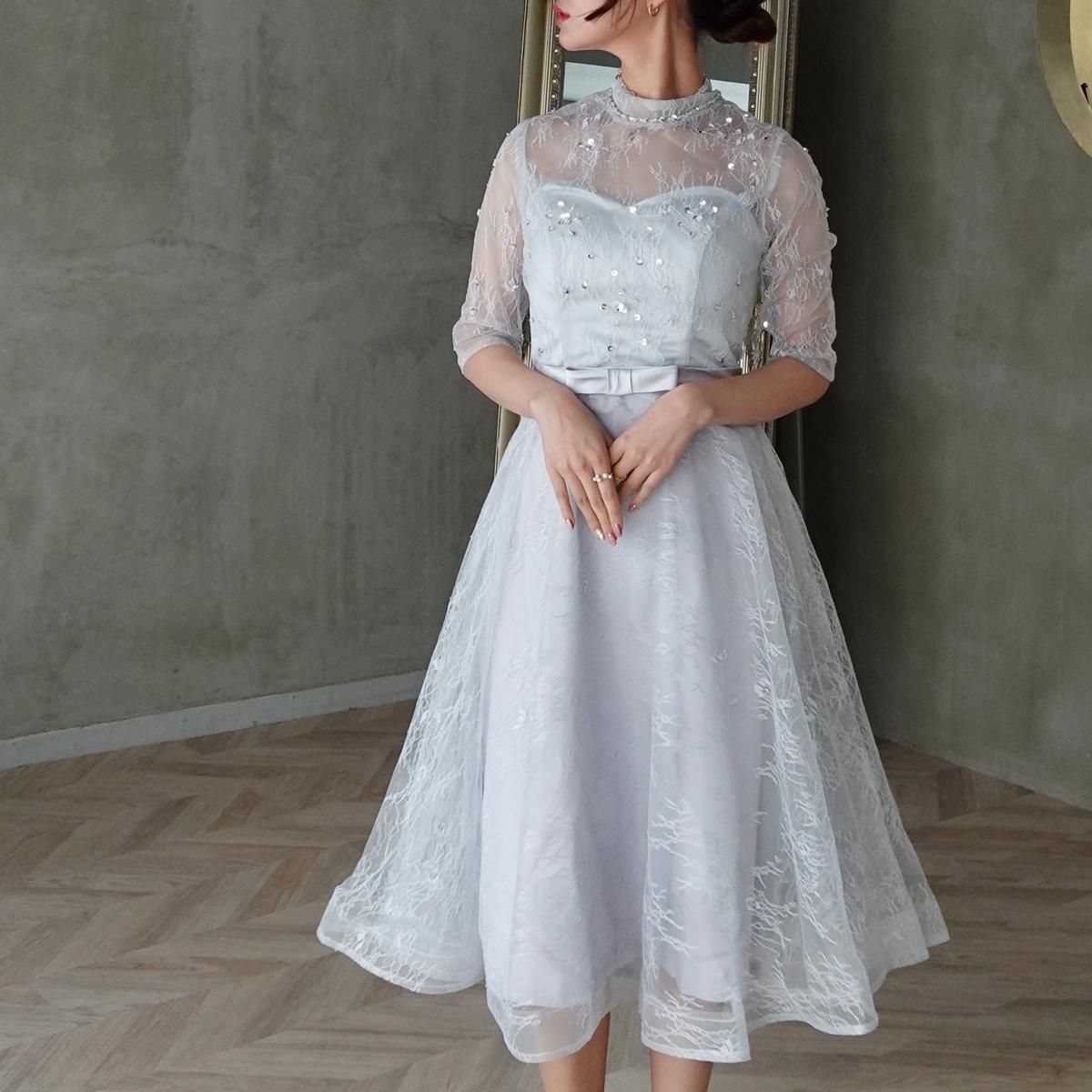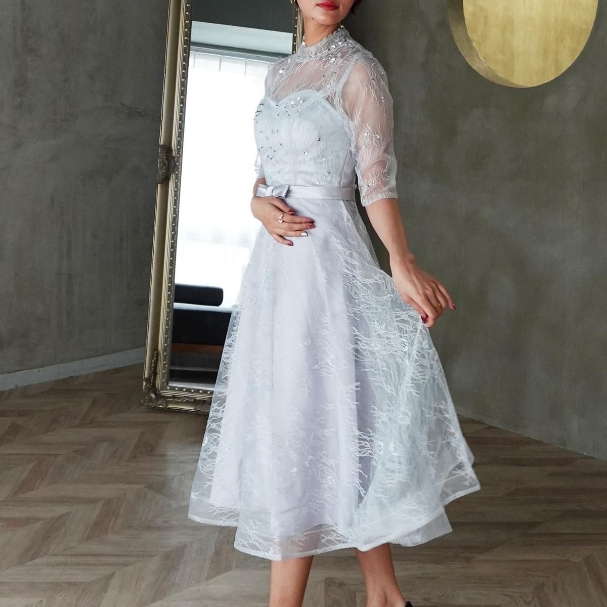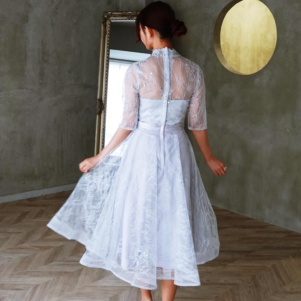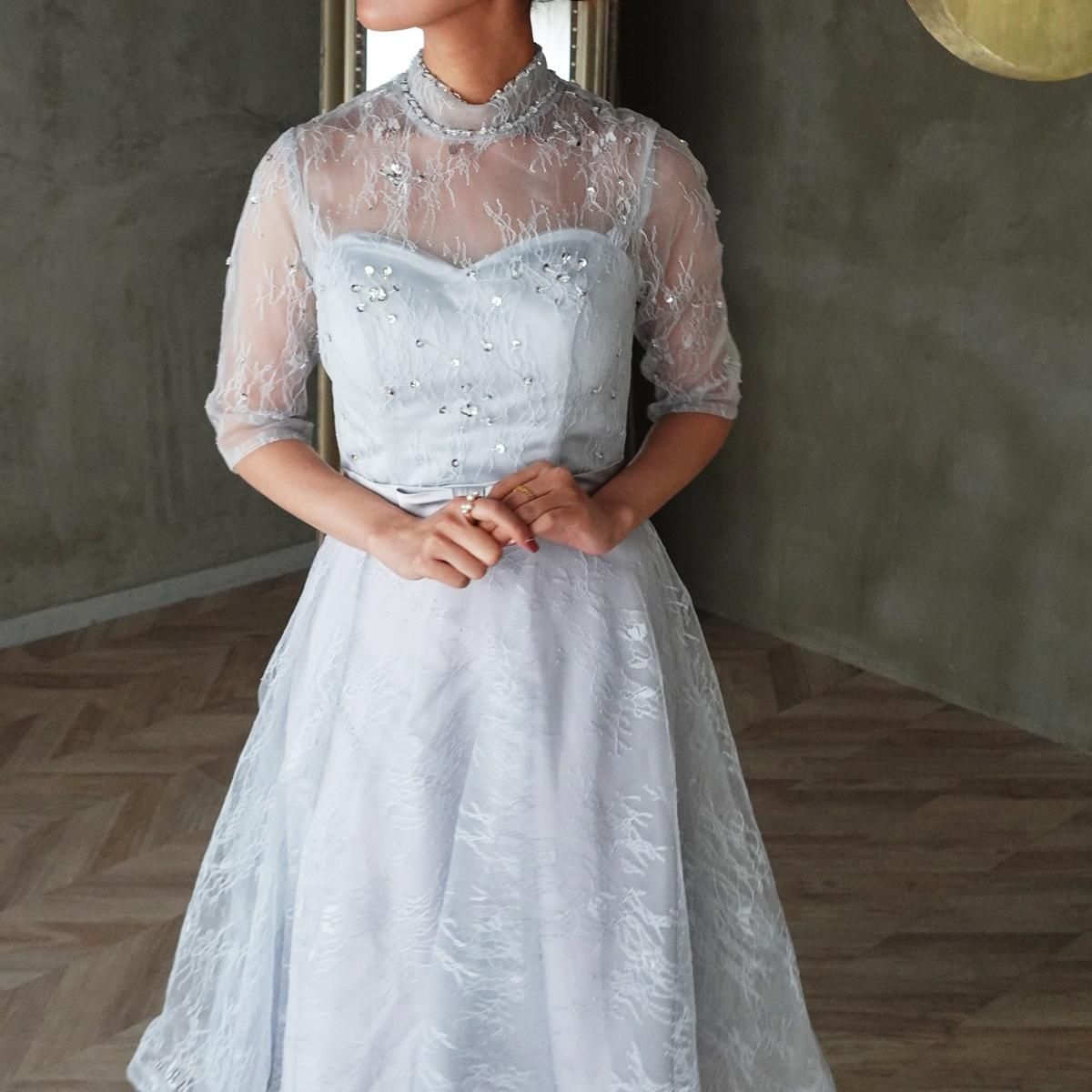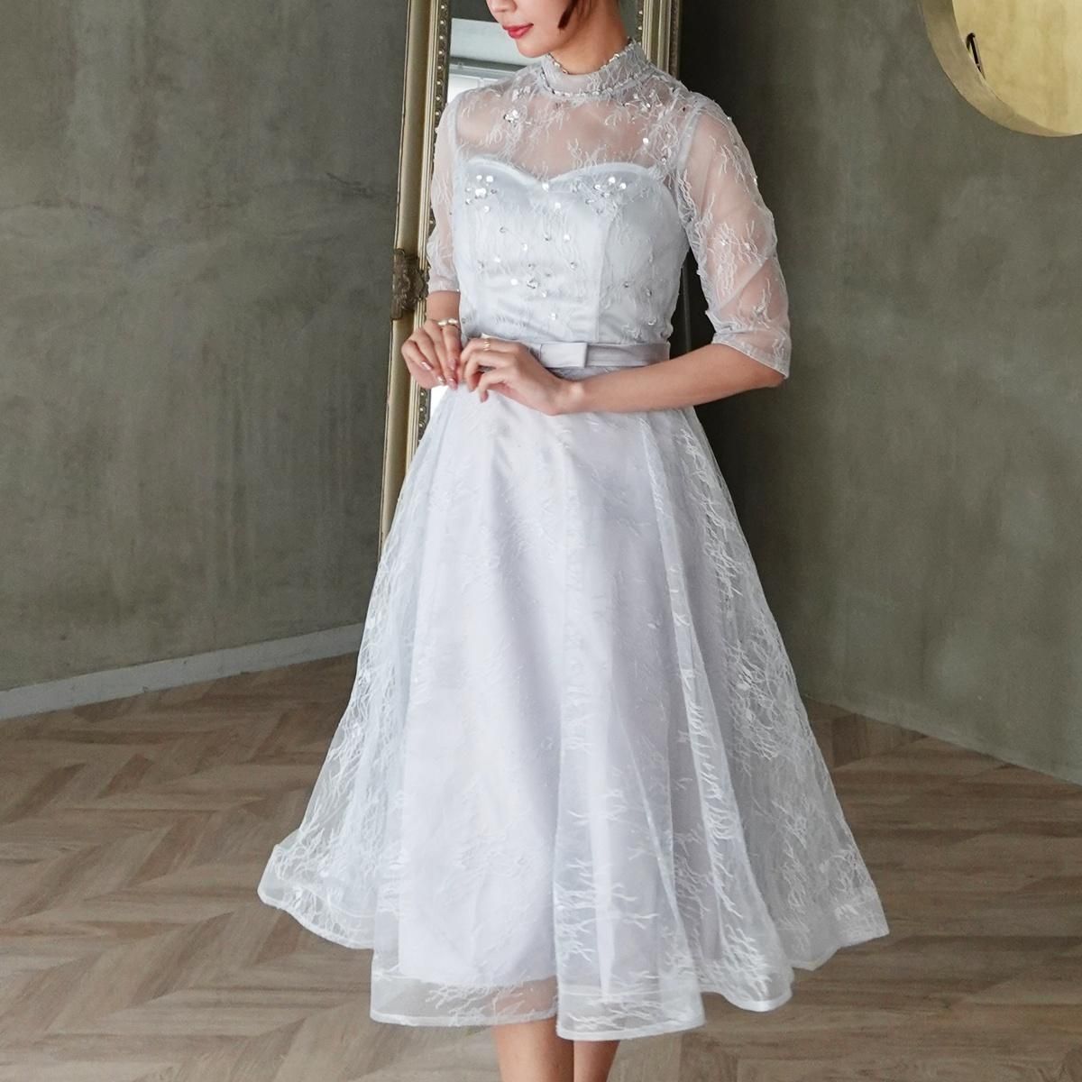 淡い色合いのレースにスパンコールが輝くAラインドレス。