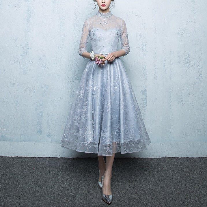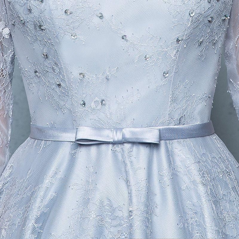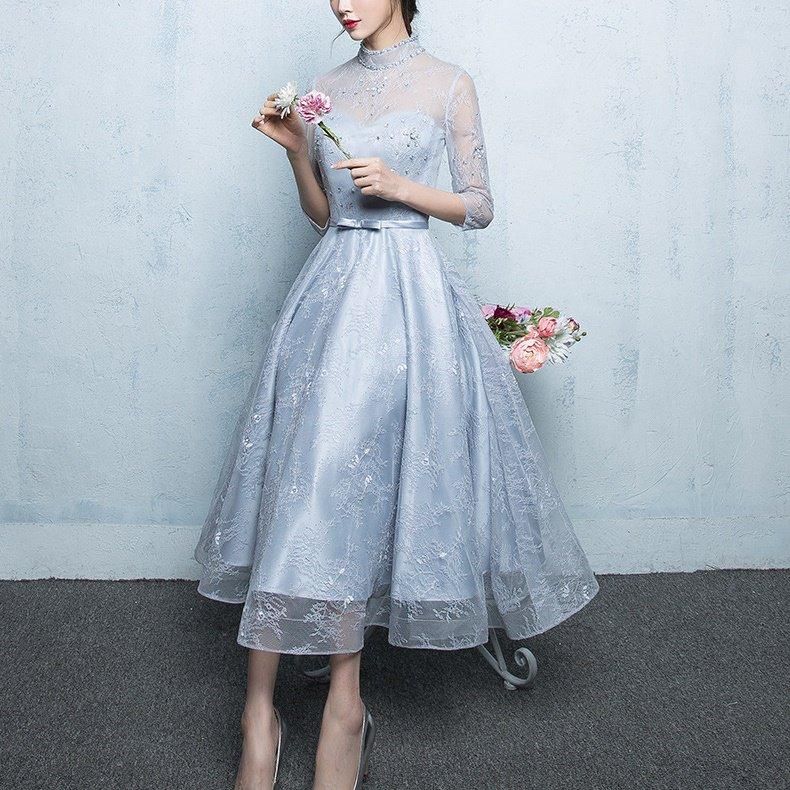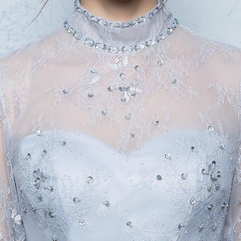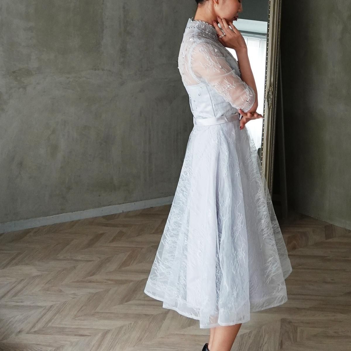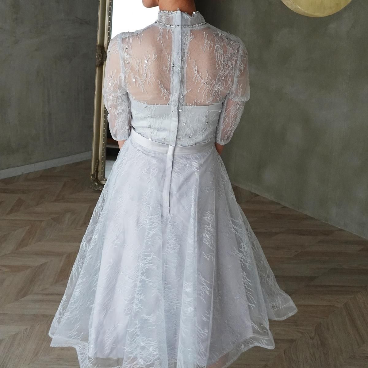 淡い色合いのレースにスパンコールが輝くAラインドレス。