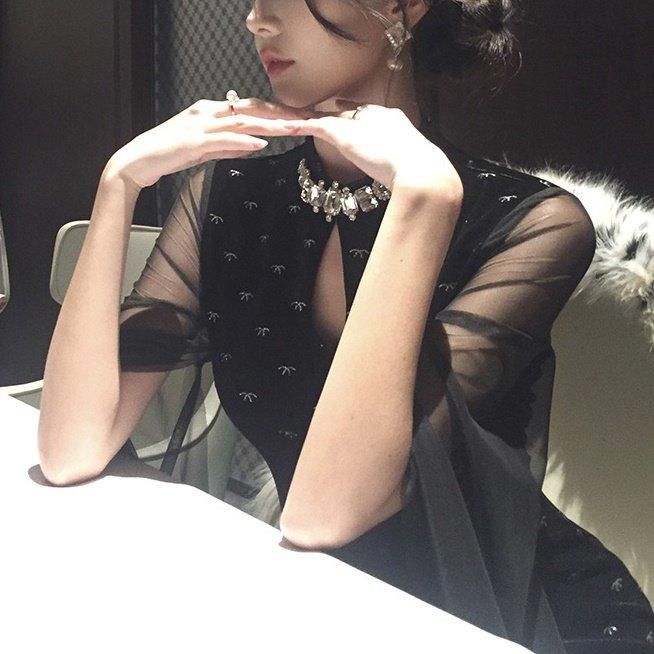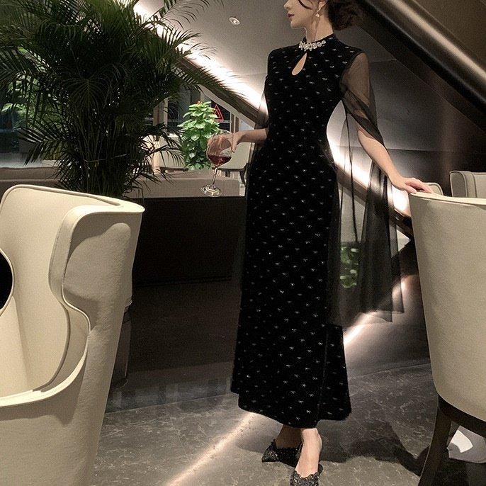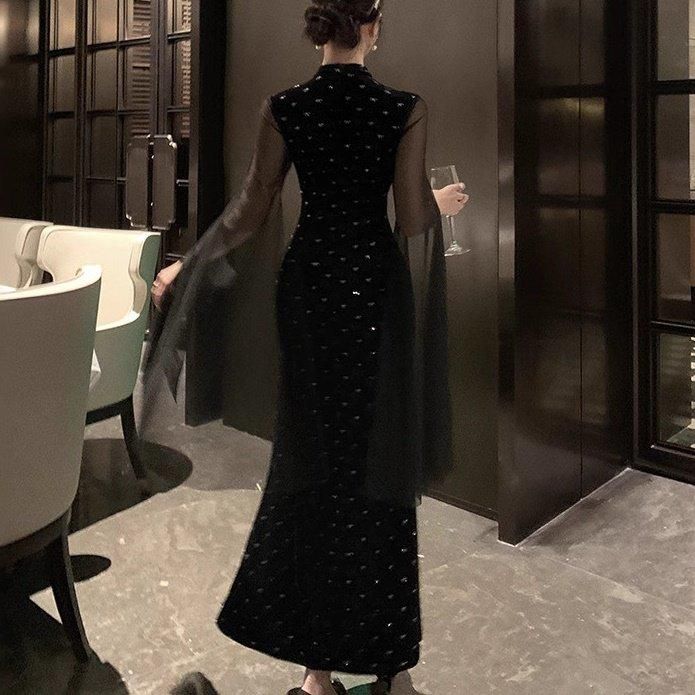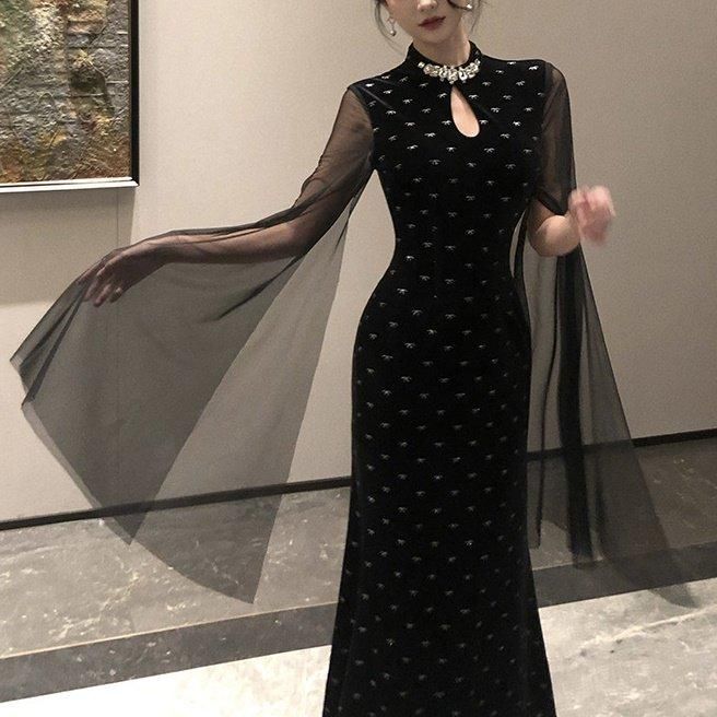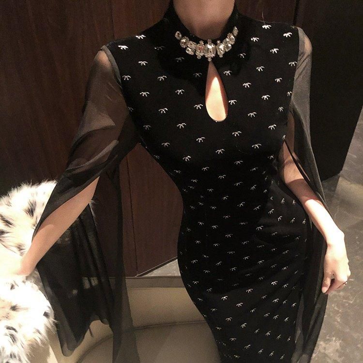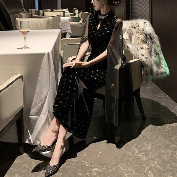シースルースリーブがエレガントな、ベロアタイトドレス。