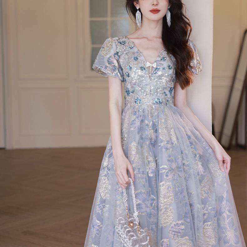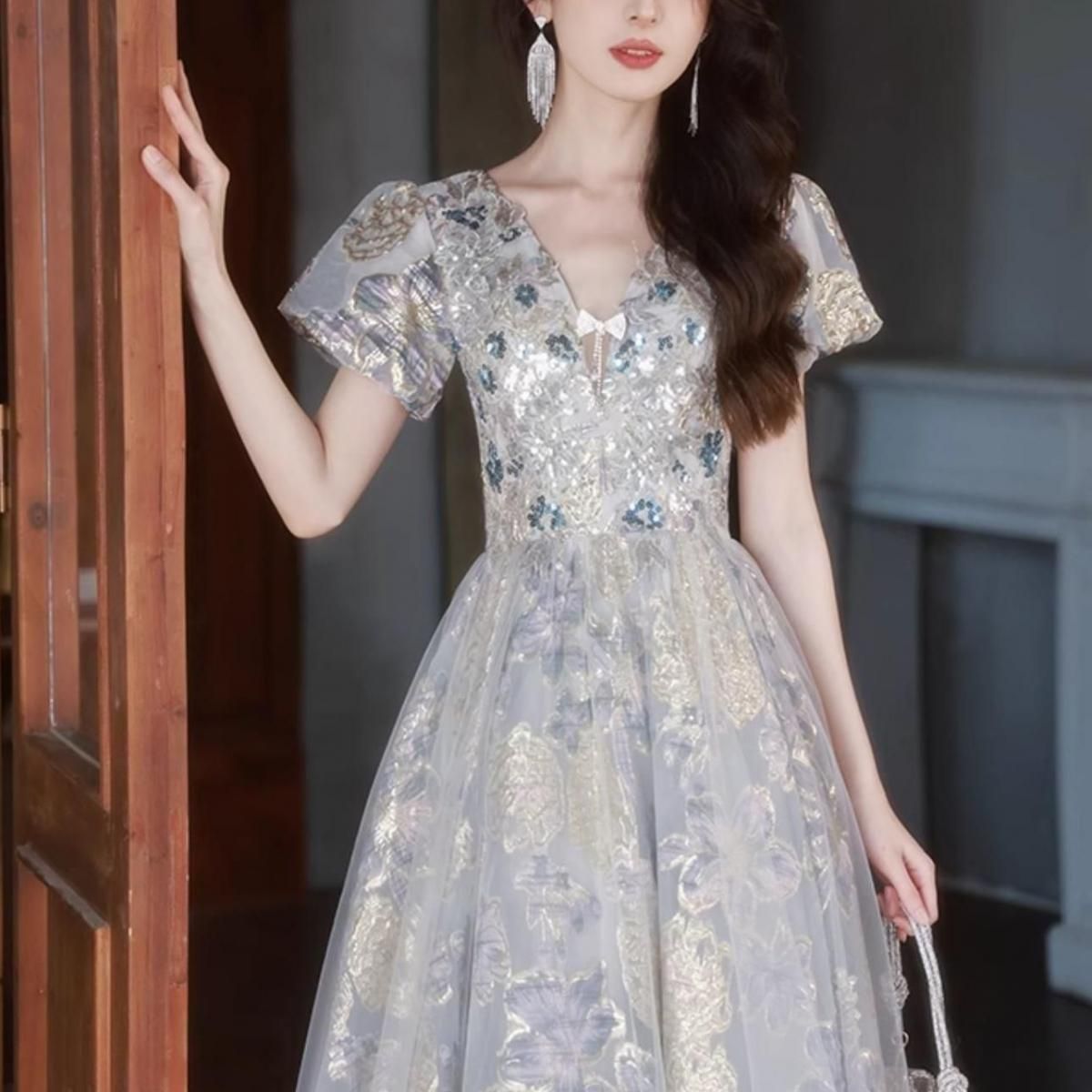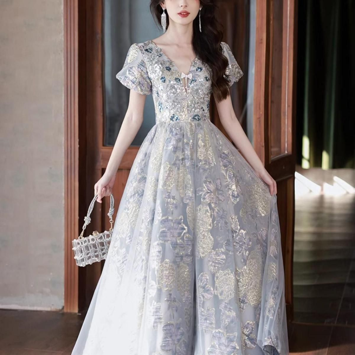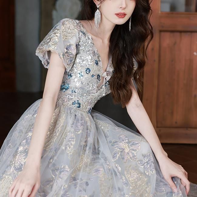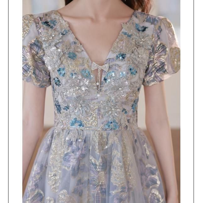 色とりどりの花柄スパンコールがかわいいAラインドレス。