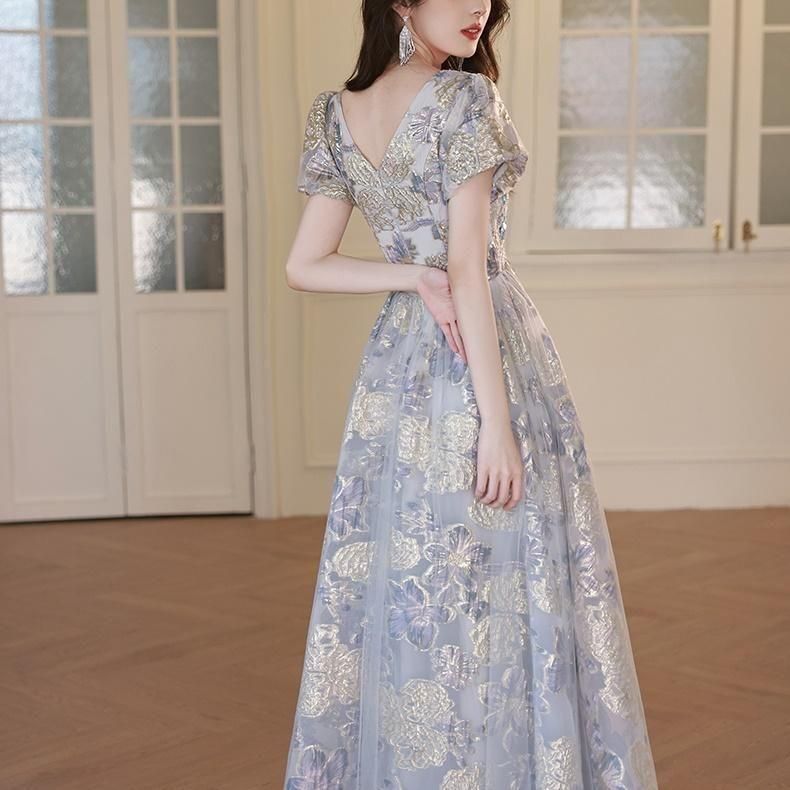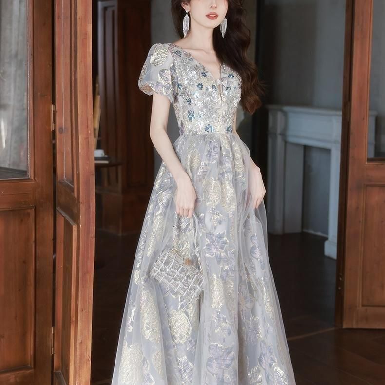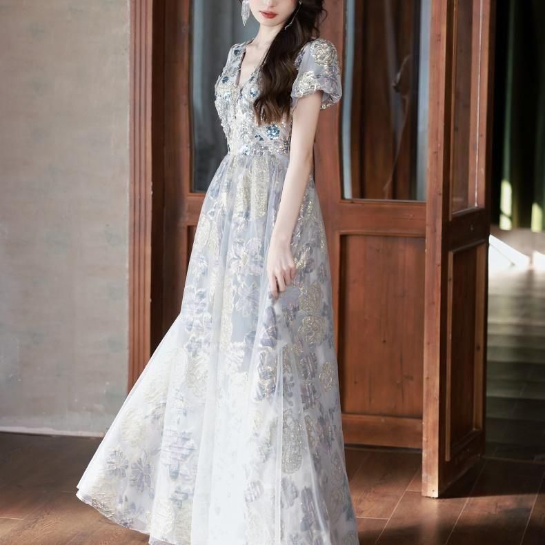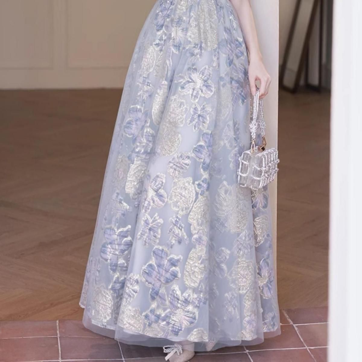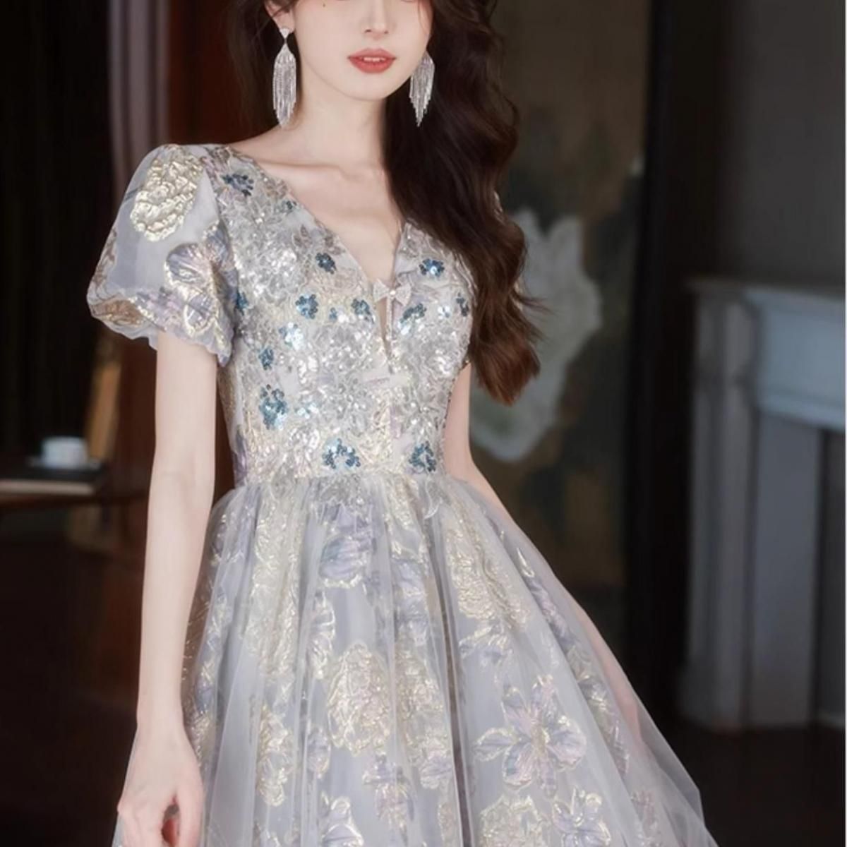 色とりどりの花柄スパンコールがかわいいAラインドレス。