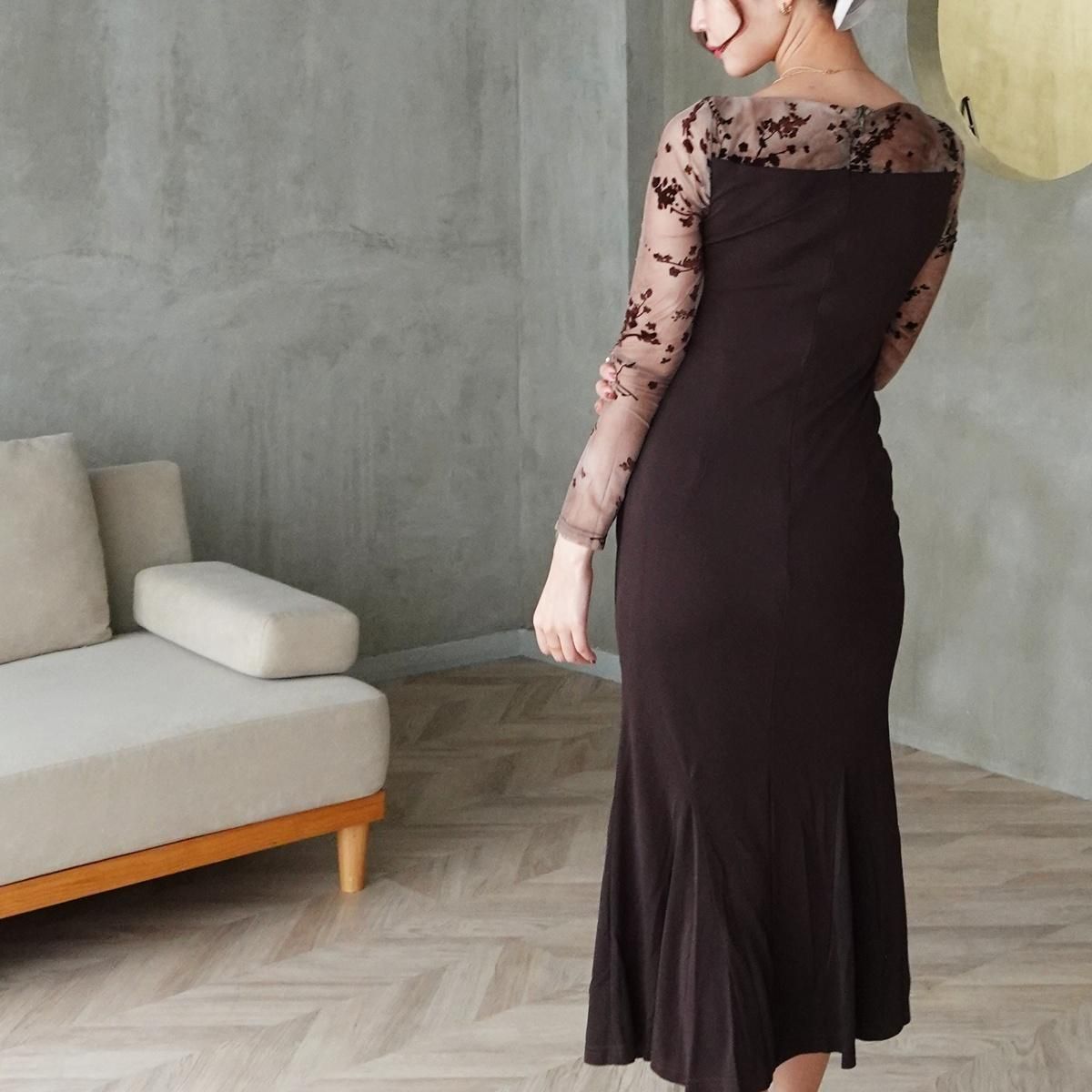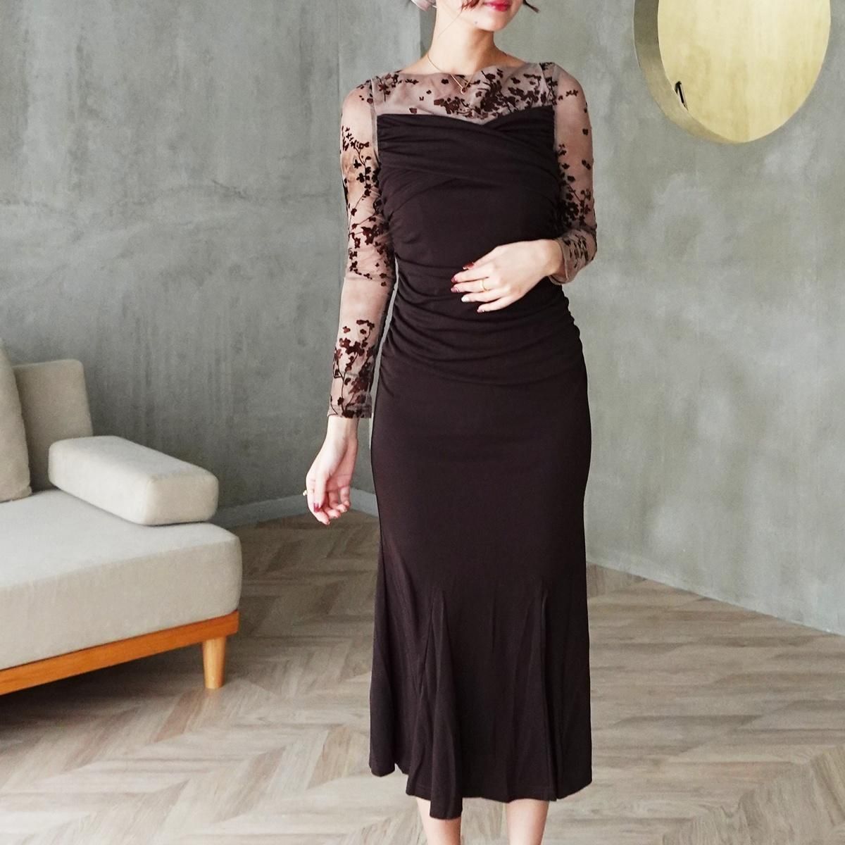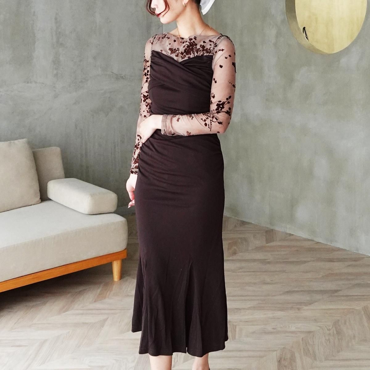 ドレス 花柄 シアースリーブ ドレープ ボートネック Iライン タイト ミモレ丈 大人 シック モダン きれいめ 結婚式 二次会 パーティー お呼ばれ