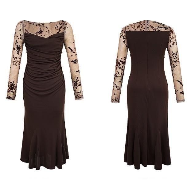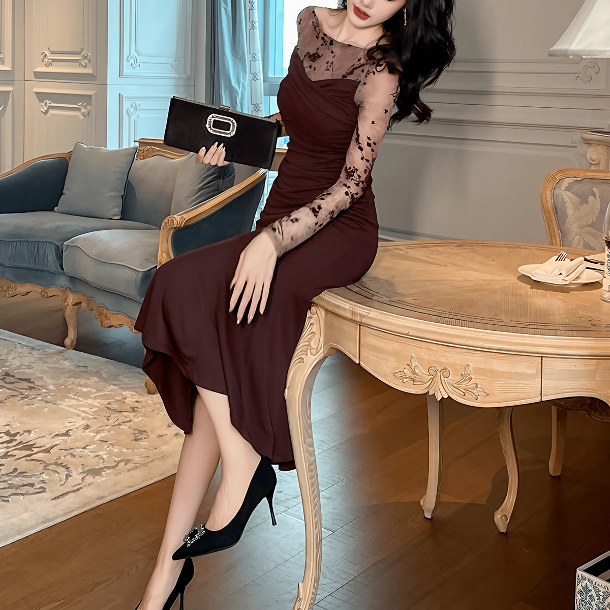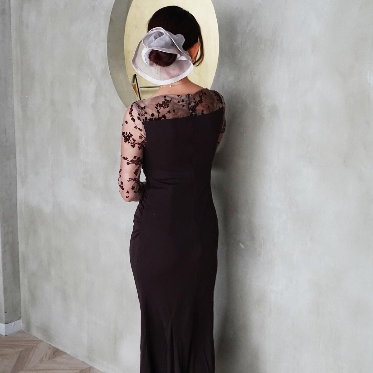 ドレス 花柄 シアースリーブ ドレープ ボートネック Iライン タイト ミモレ丈 大人 シック モダン きれいめ 結婚式 二次会 パーティー お呼ばれ