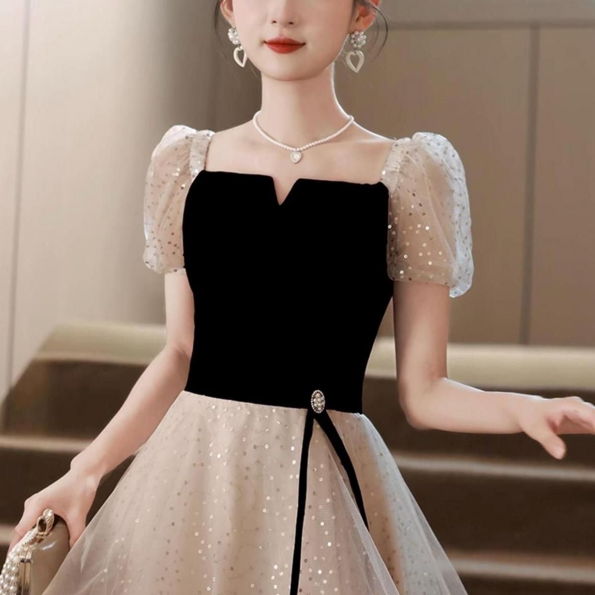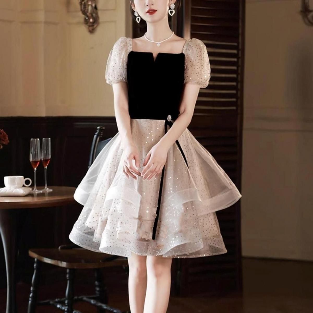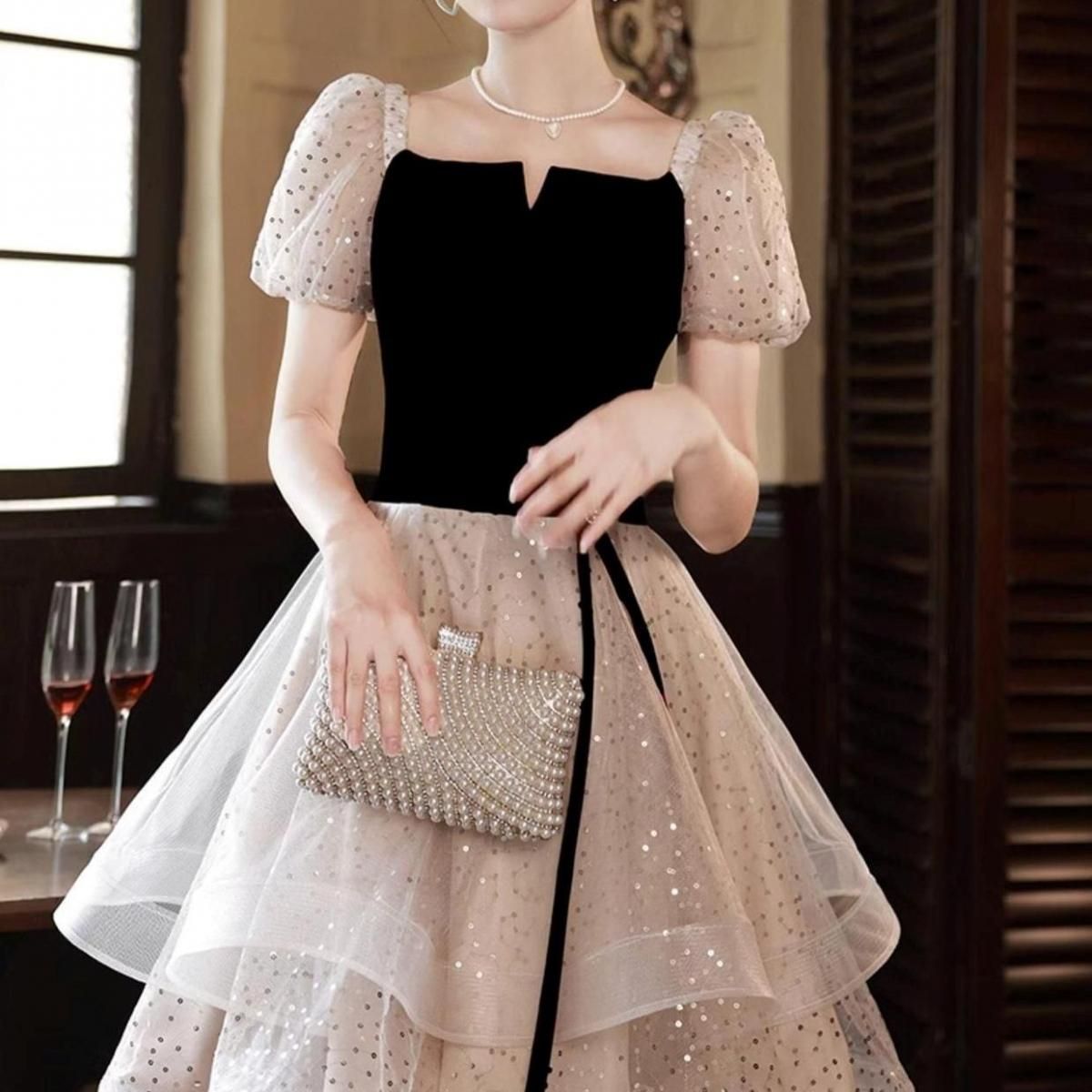 ドレス スパンコール フリル スクエアネック ティアード バイカラー Aライン ショート丈 ミディアム丈 華やか 結婚式 二次会 パーティー お呼ばれ 2種