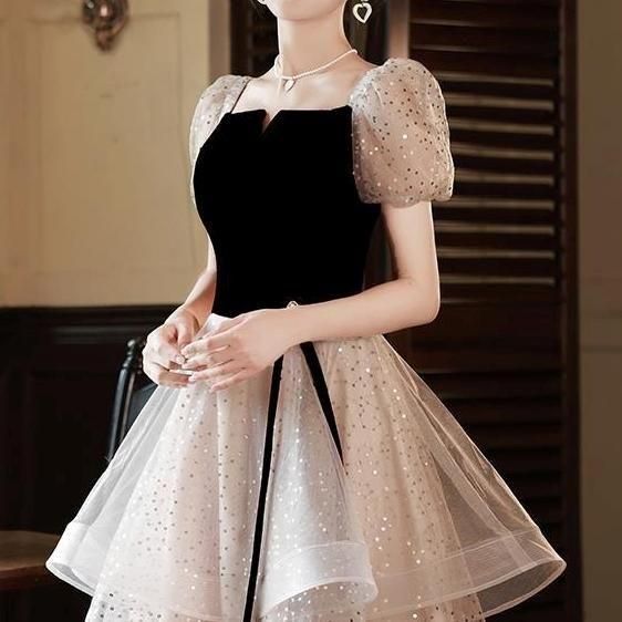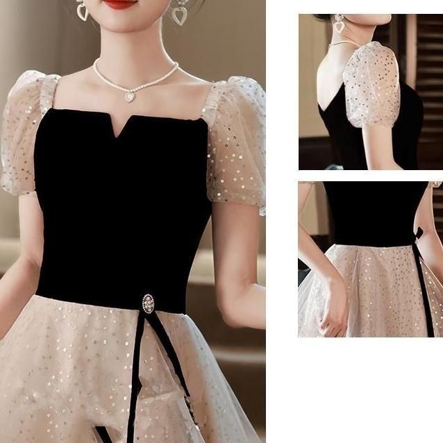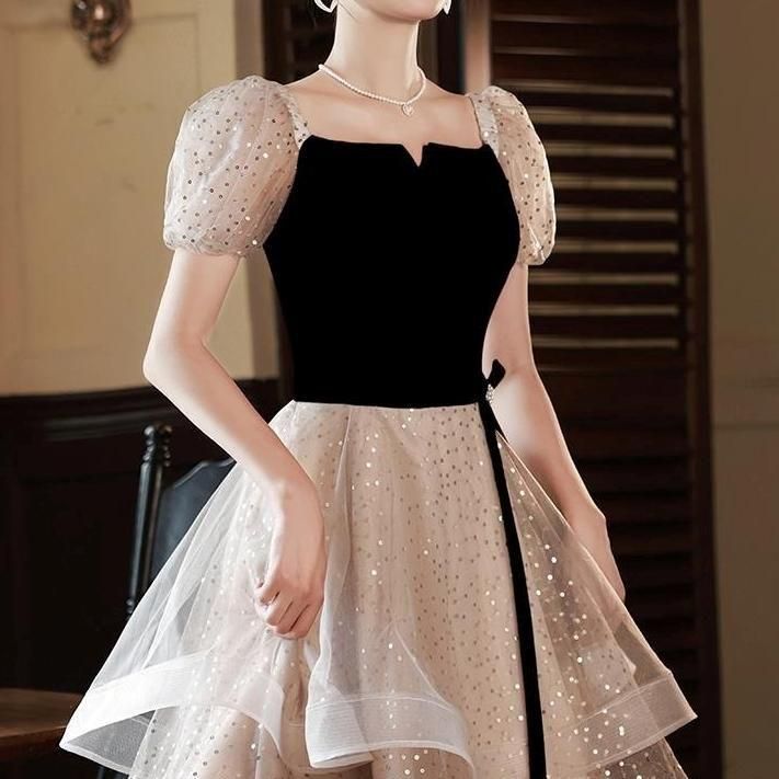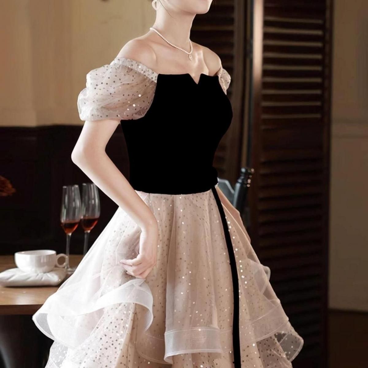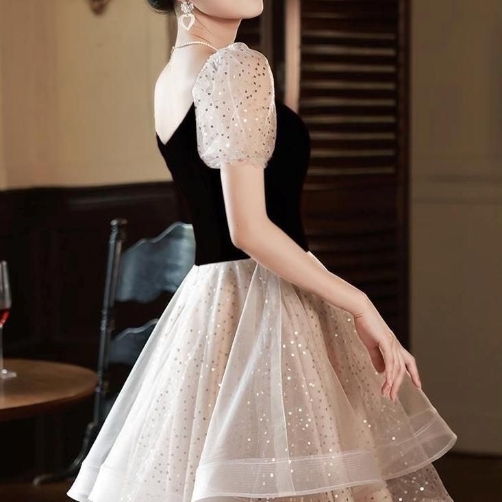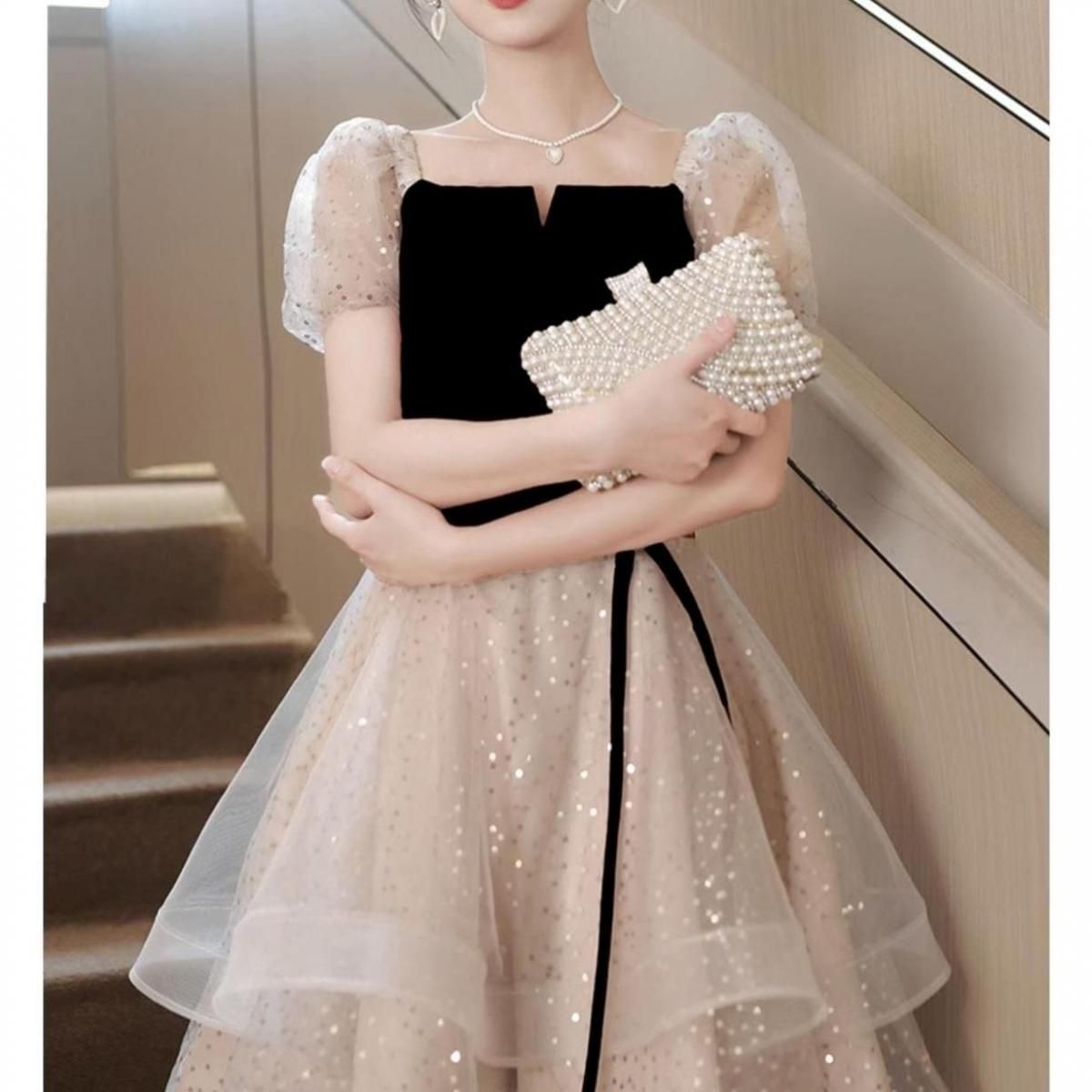 ドレス スパンコール フリル スクエアネック ティアード バイカラー Aライン ショート丈 ミディアム丈 華やか 結婚式 二次会 パーティー お呼ばれ 2種