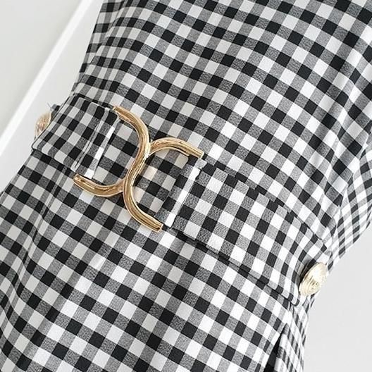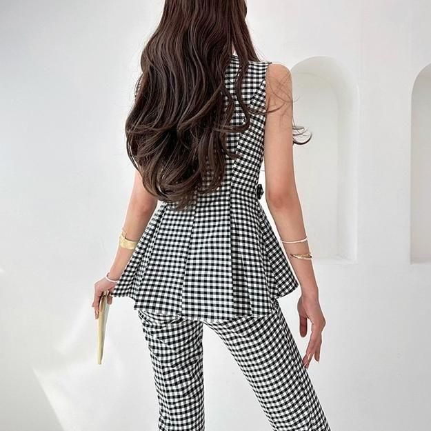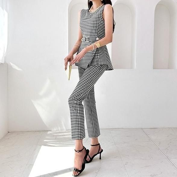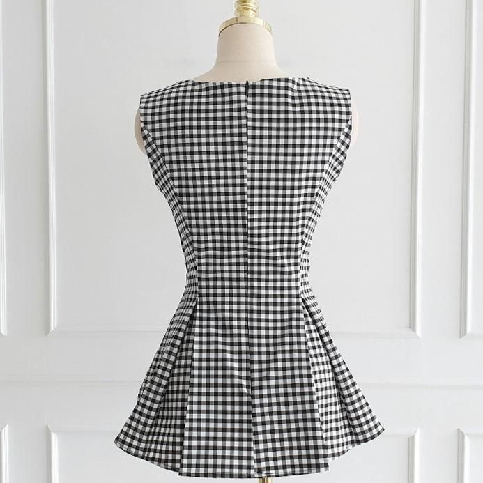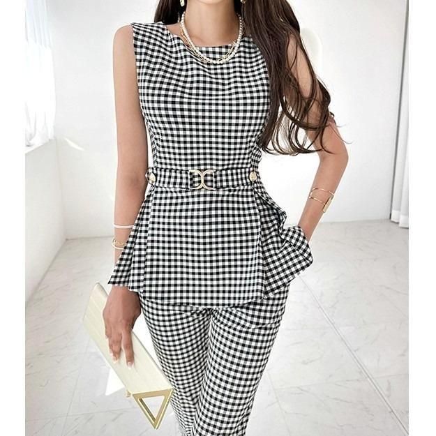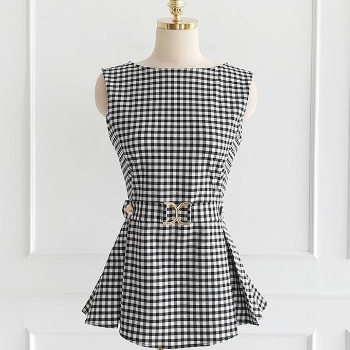ノースリーブトップスはウェストマーク付きでメリハリのある体型に。
