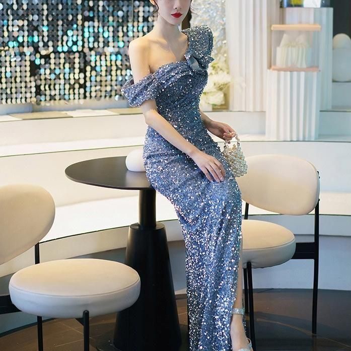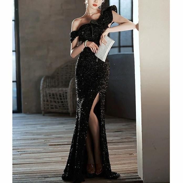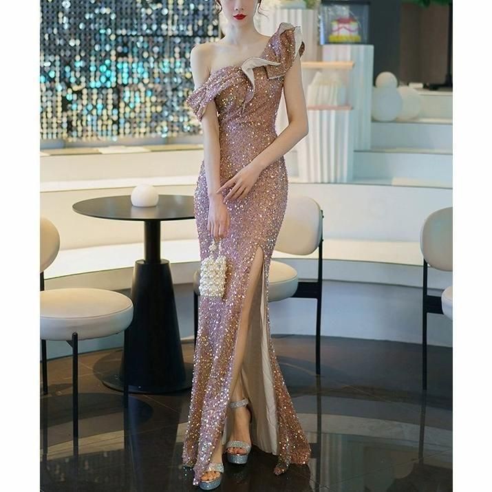 きれいなマーメイドラインに深めのスリットが大人なドレスです。