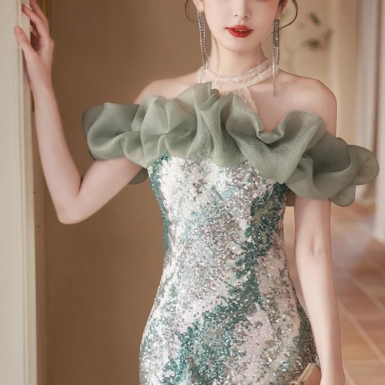スパンコールが輝き、度の角度から見ても美しいドレスです。