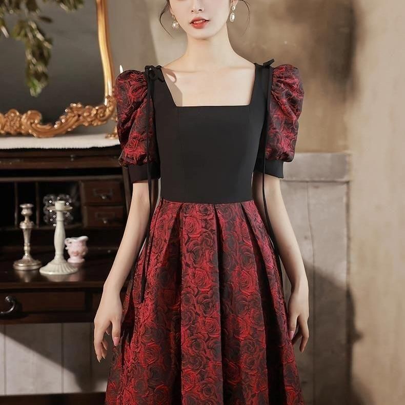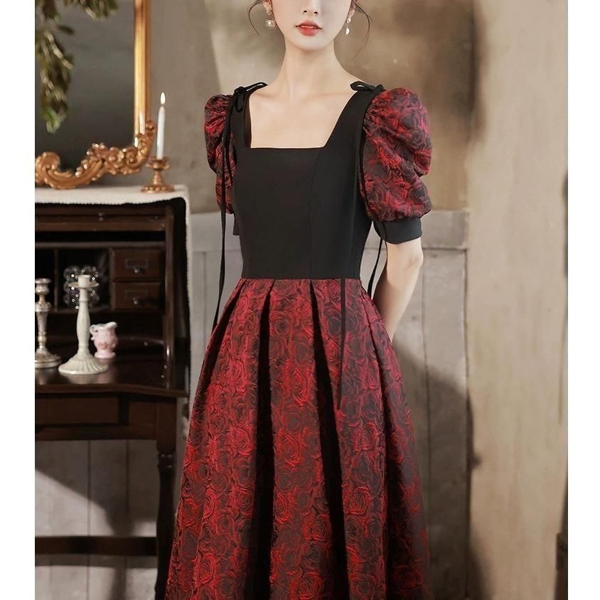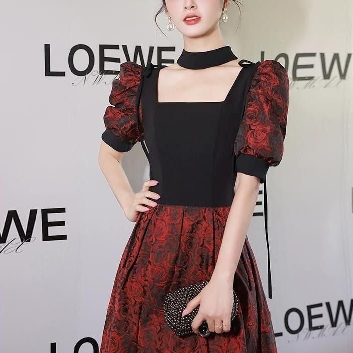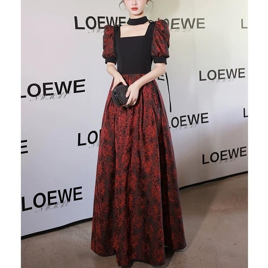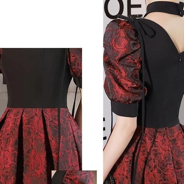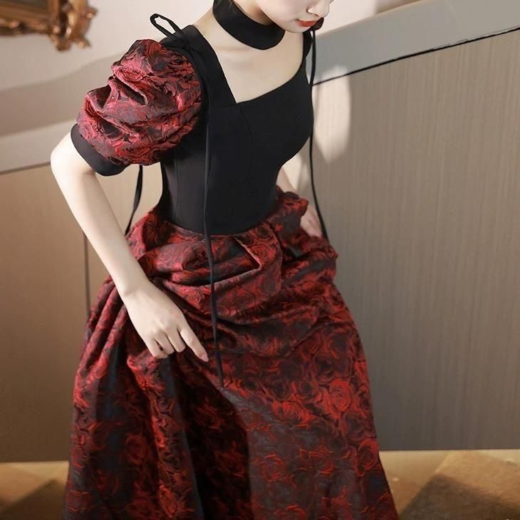 ボリュームスリーブや広がるスカートが体型をカバーしつつ、華やかに見せます。