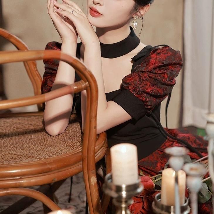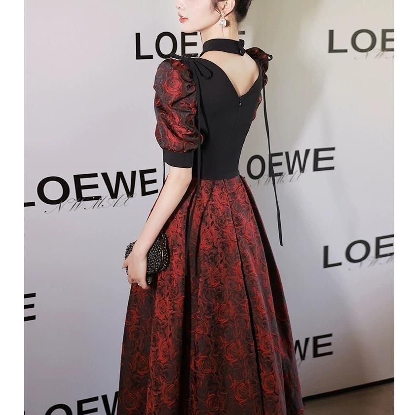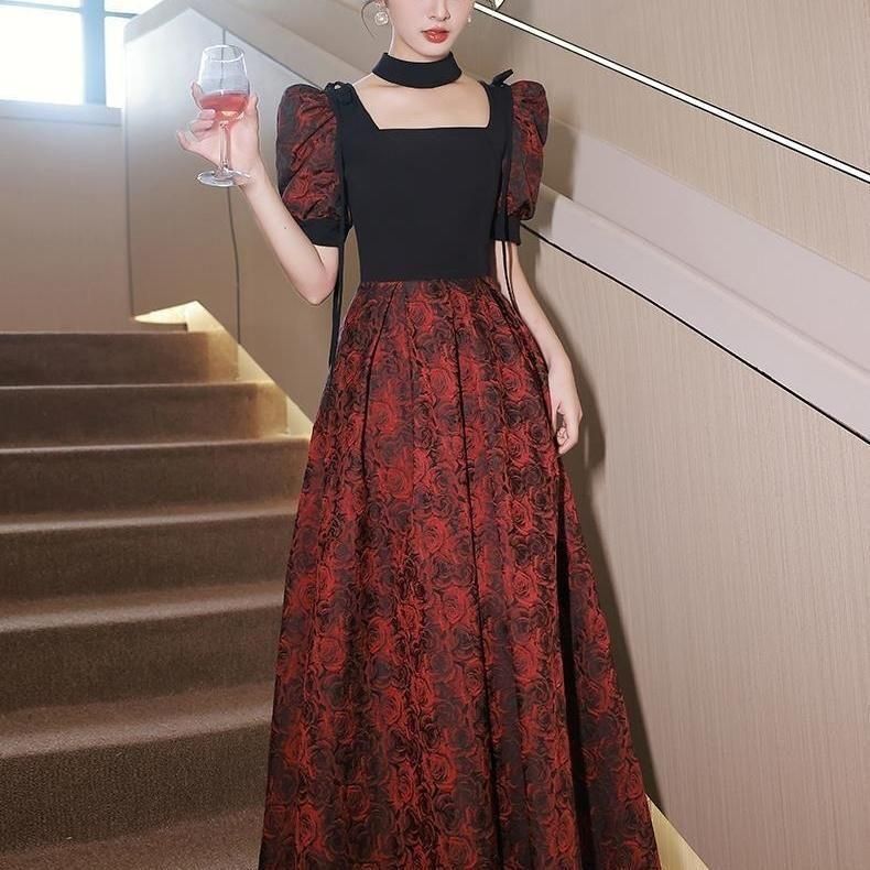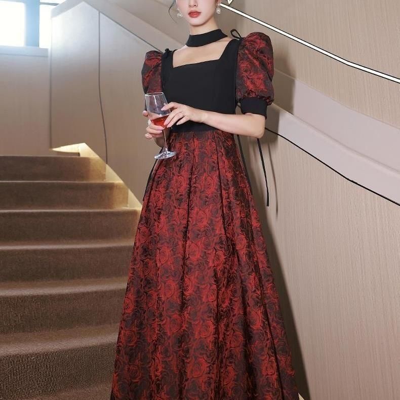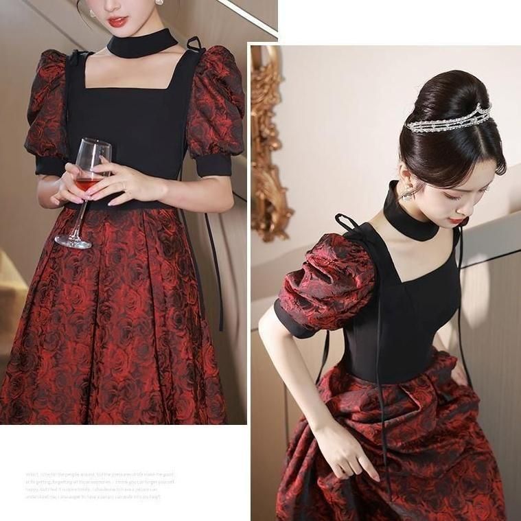 ボリュームスリーブや広がるスカートが体型をカバーしつつ、華やかに見せます。