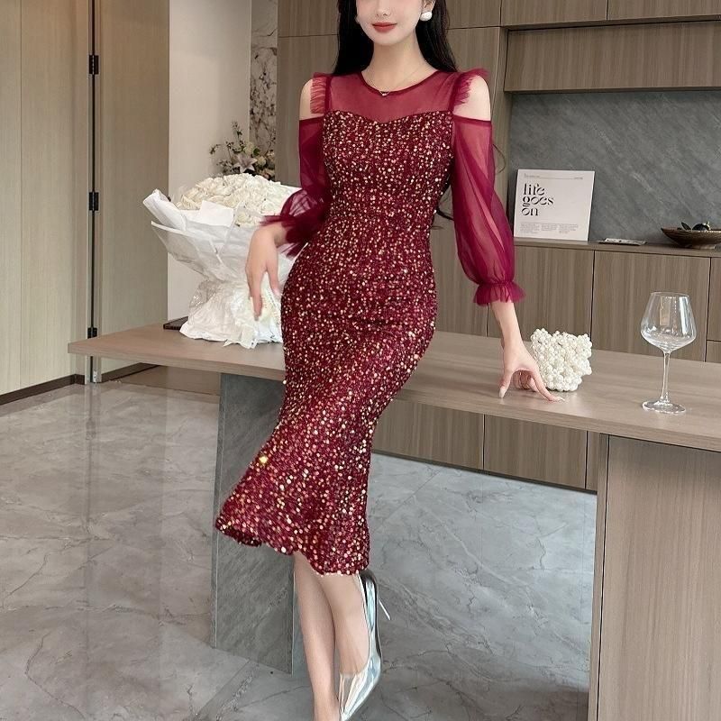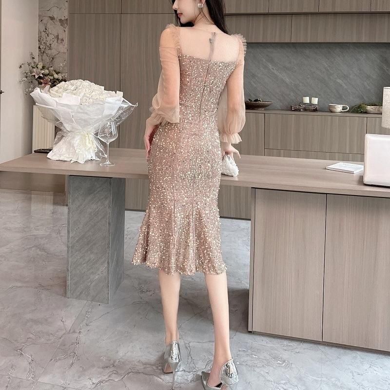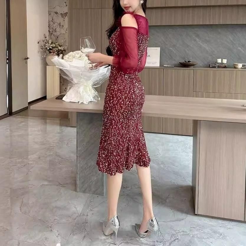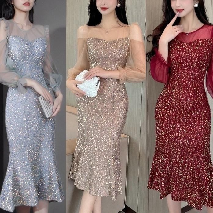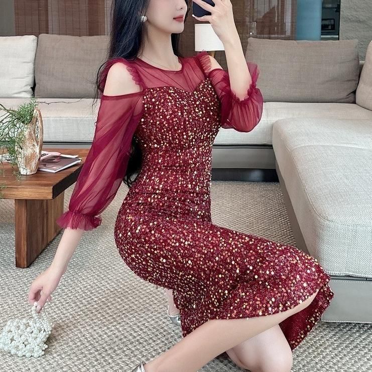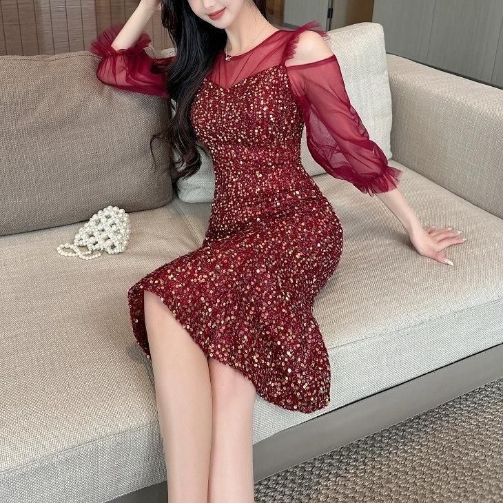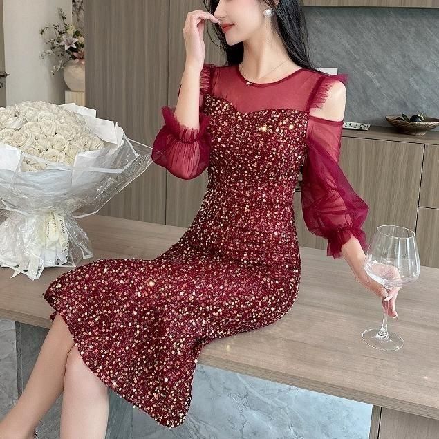 輝くスパンコールがパーティーにぴったりなミディアム丈ドレス。