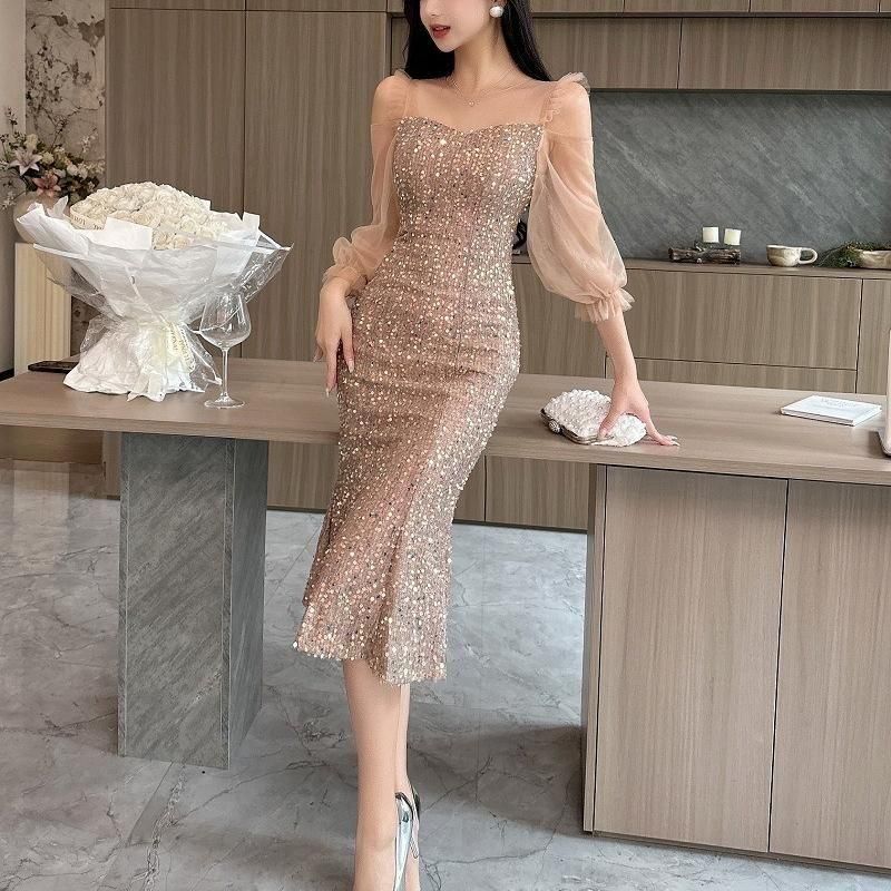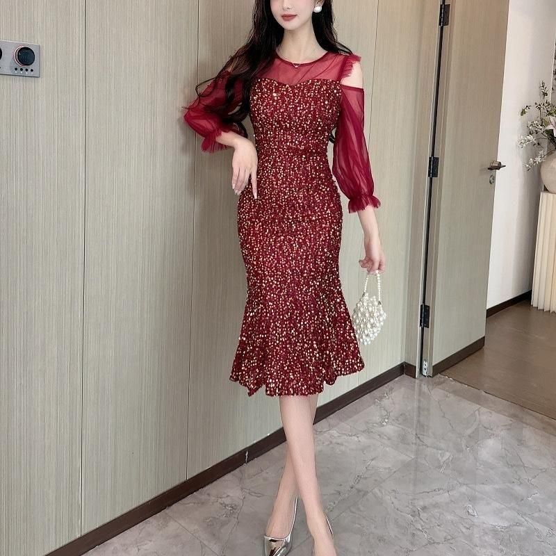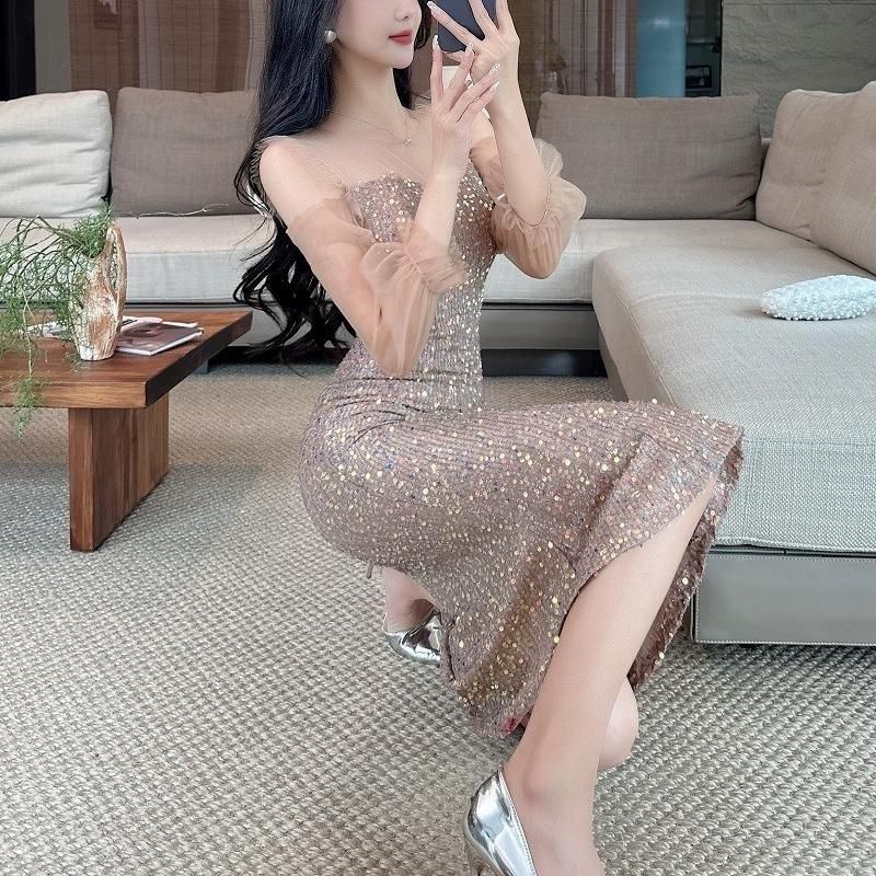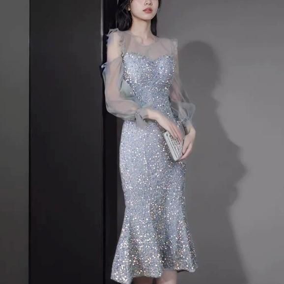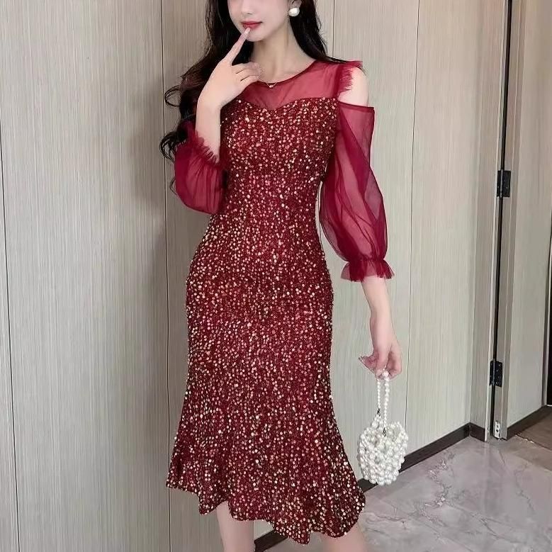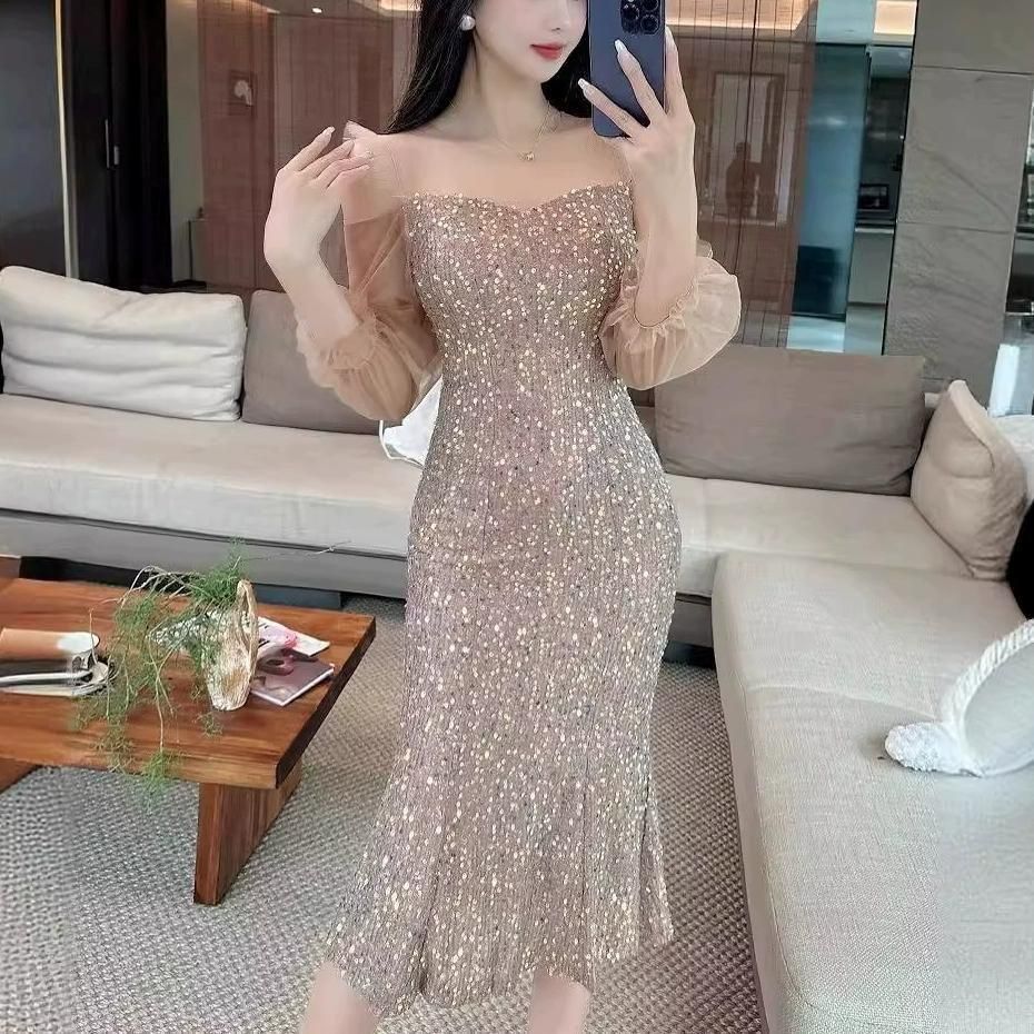 輝くスパンコールがパーティーにぴったりなミディアム丈ドレス。