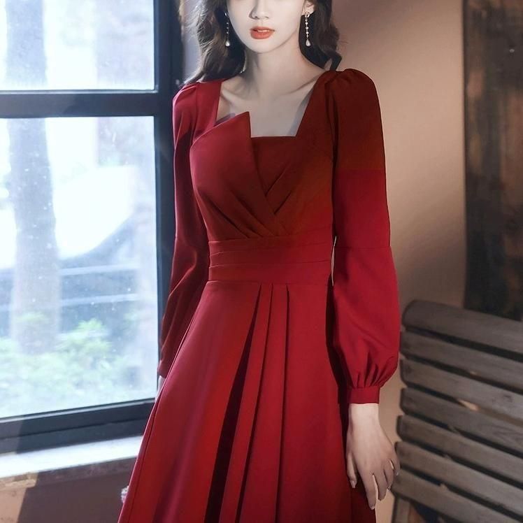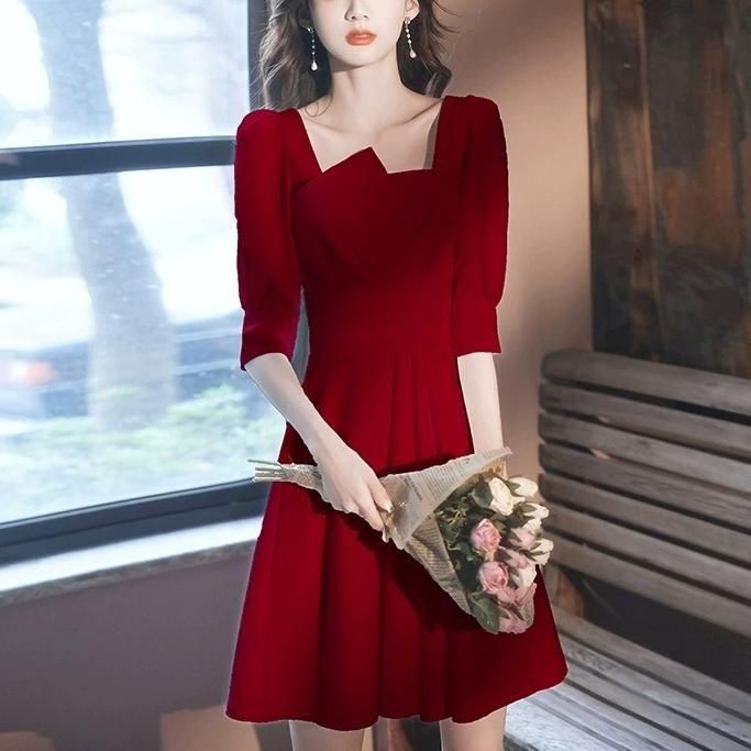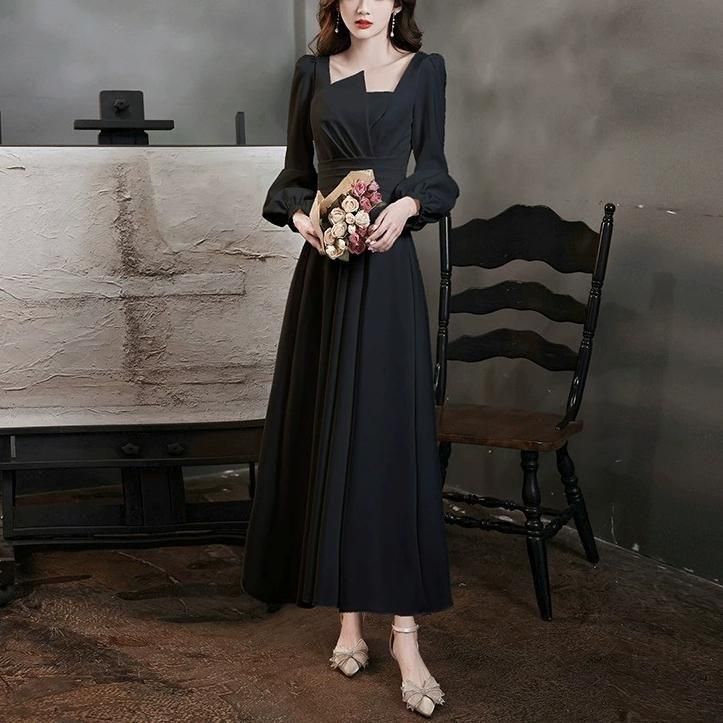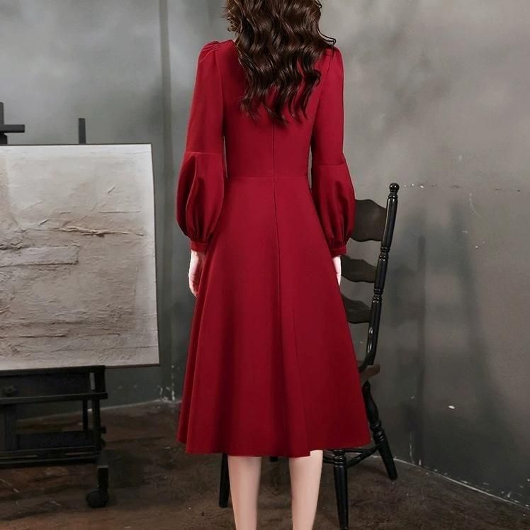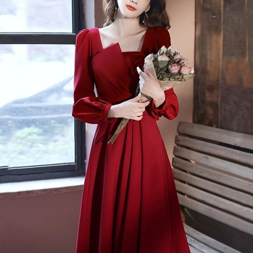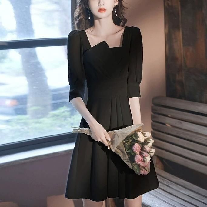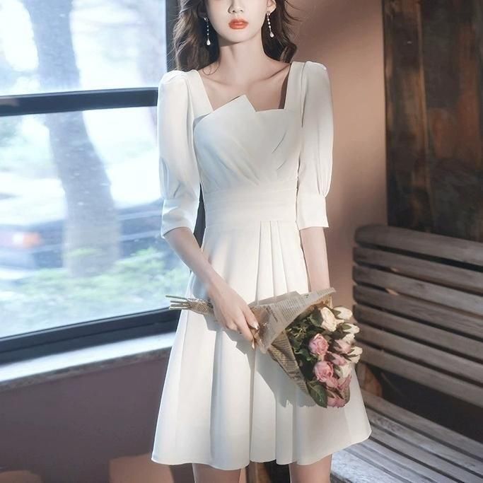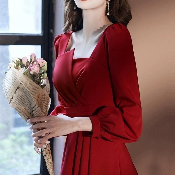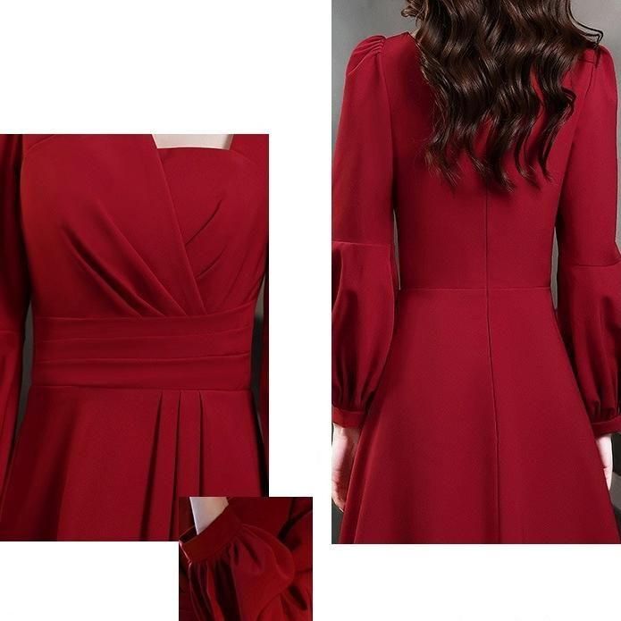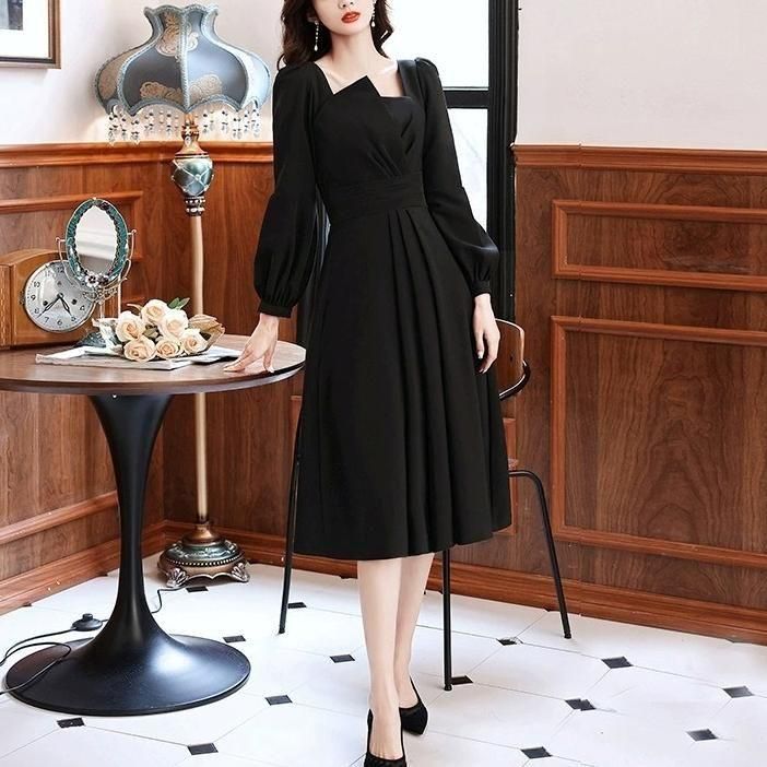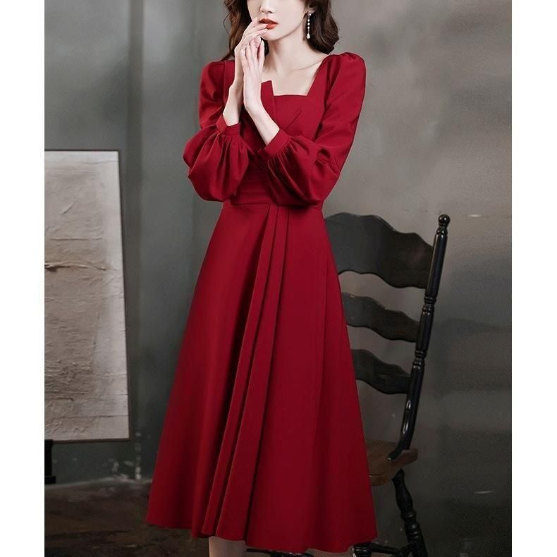 デコルテがきれいに出るスクエアネックに、肩のボリューム感がポイント。