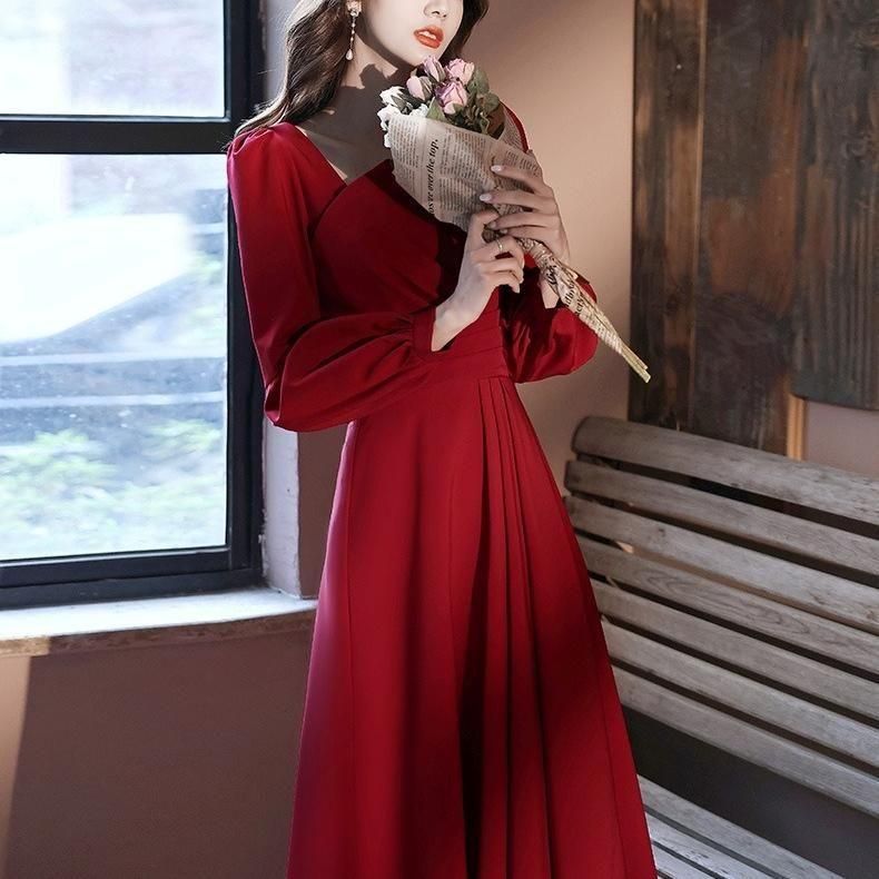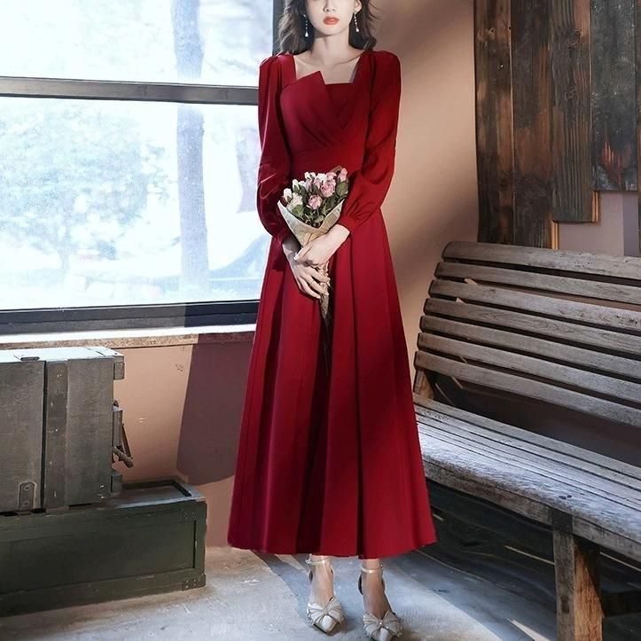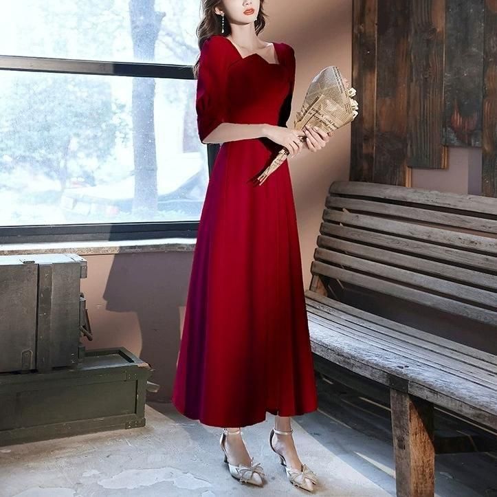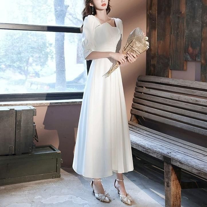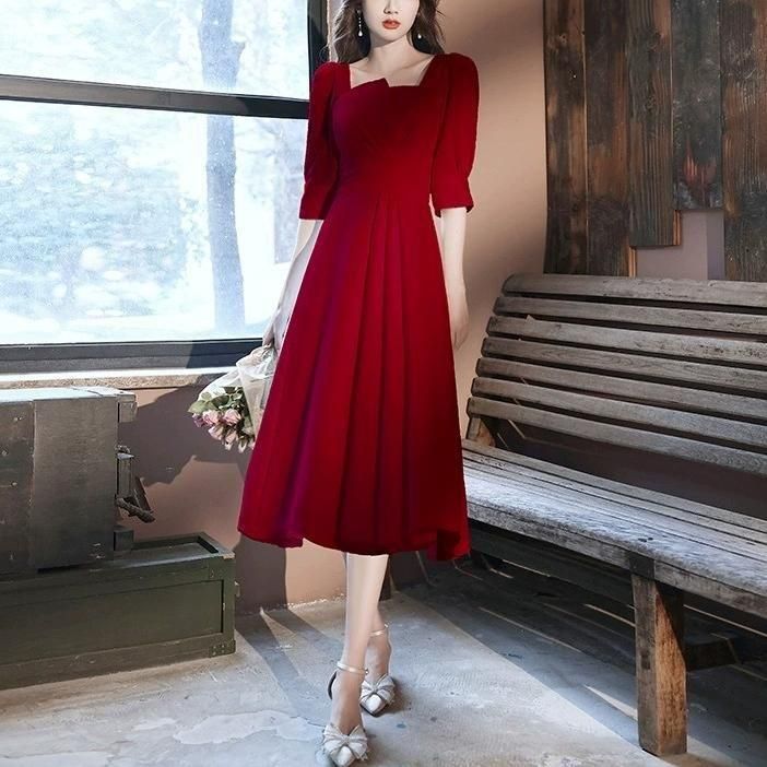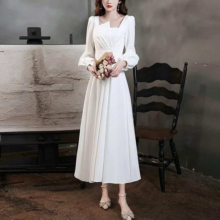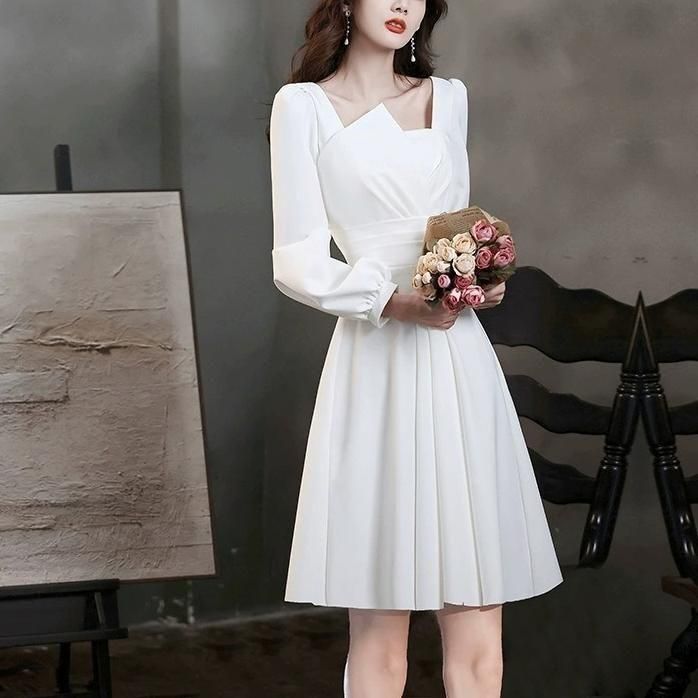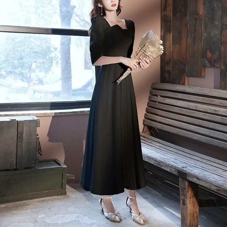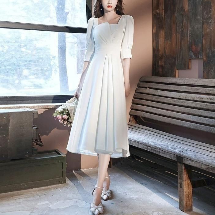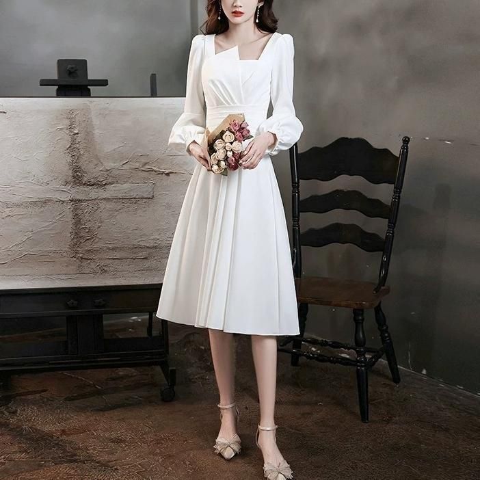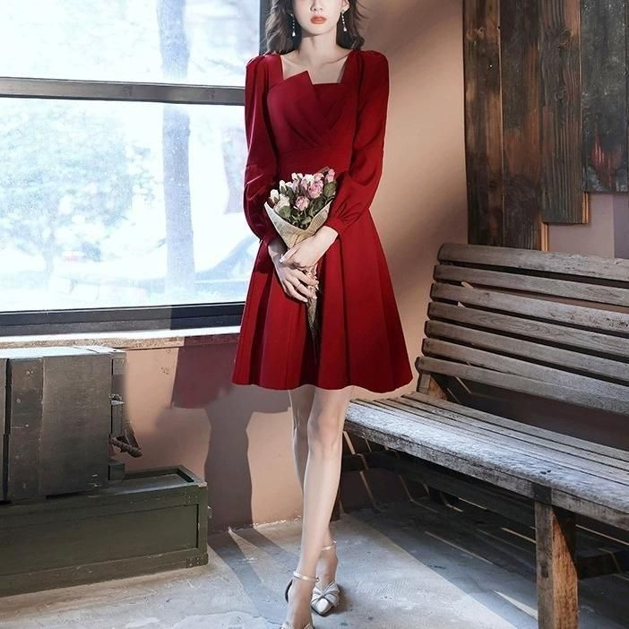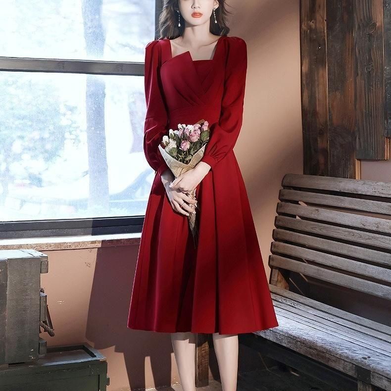 デコルテがきれいに出るスクエアネックに、肩のボリューム感がポイント。