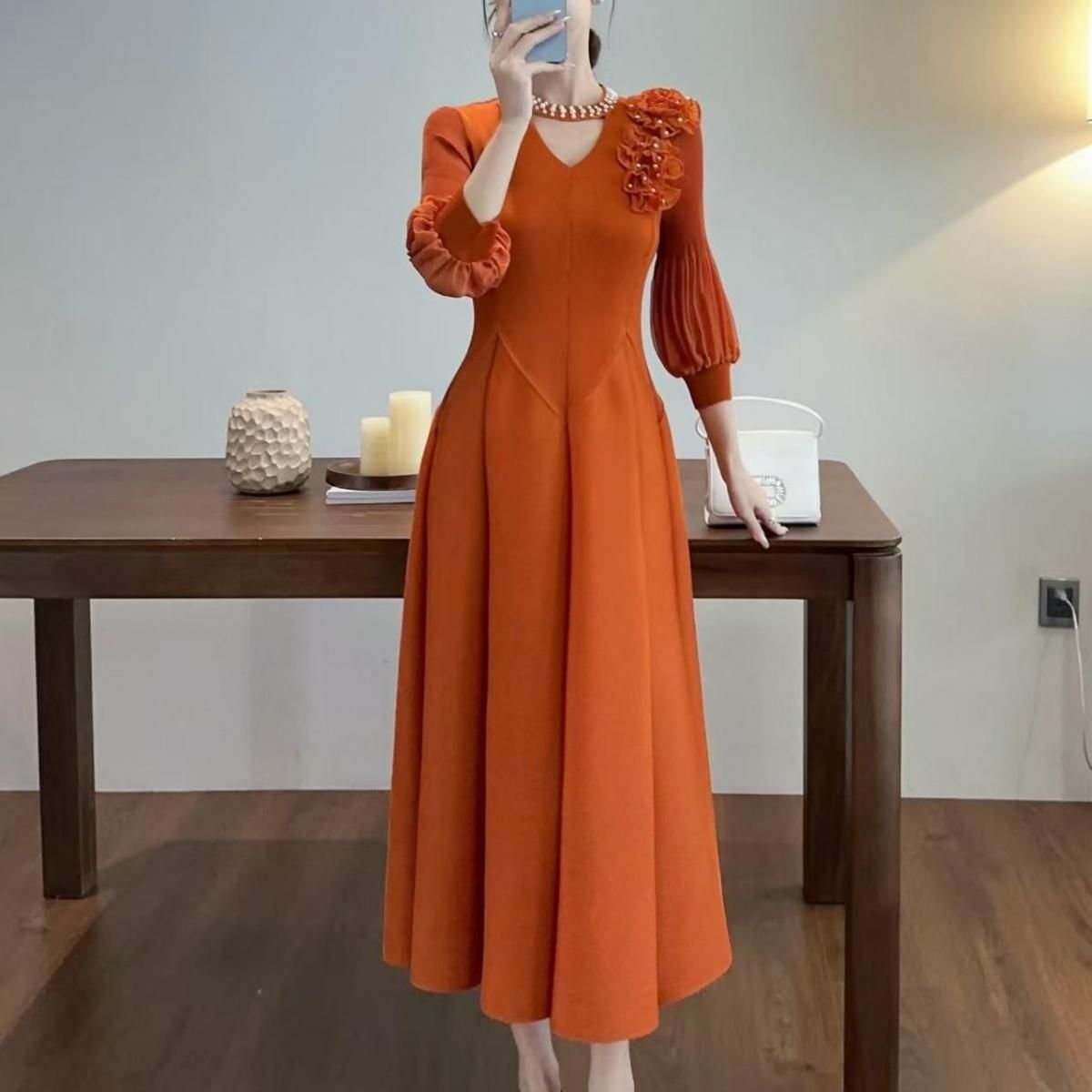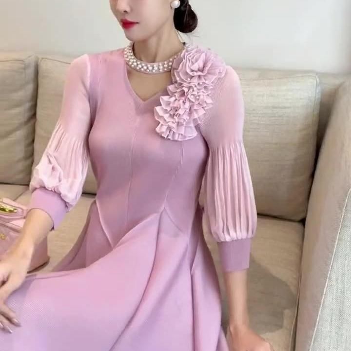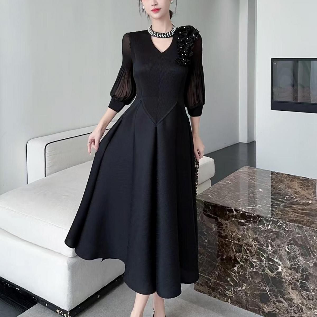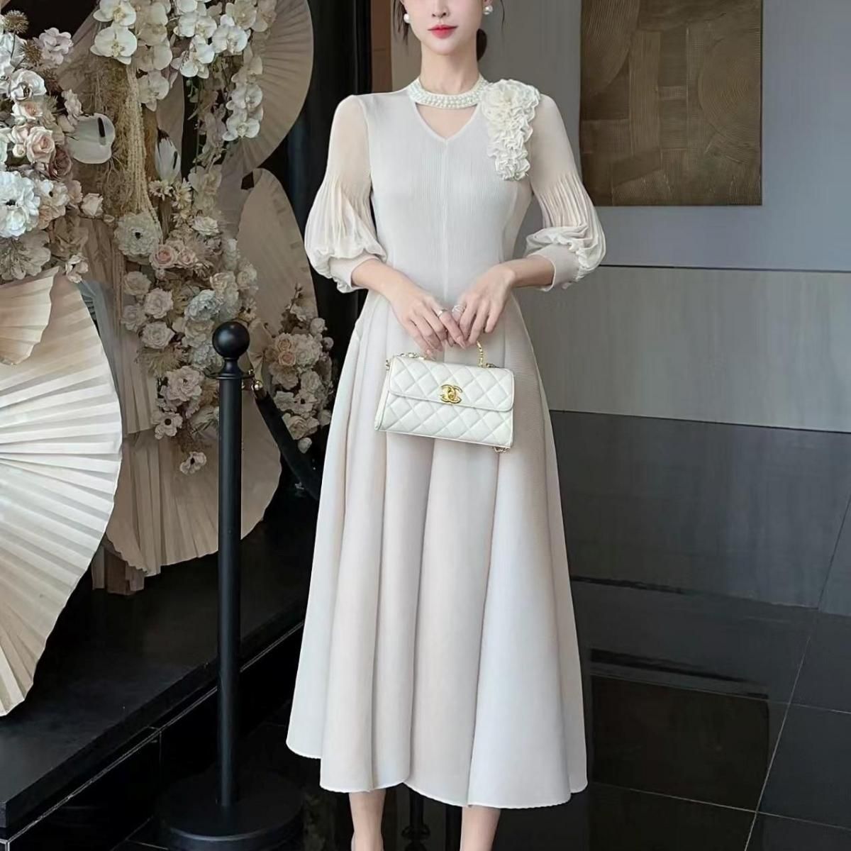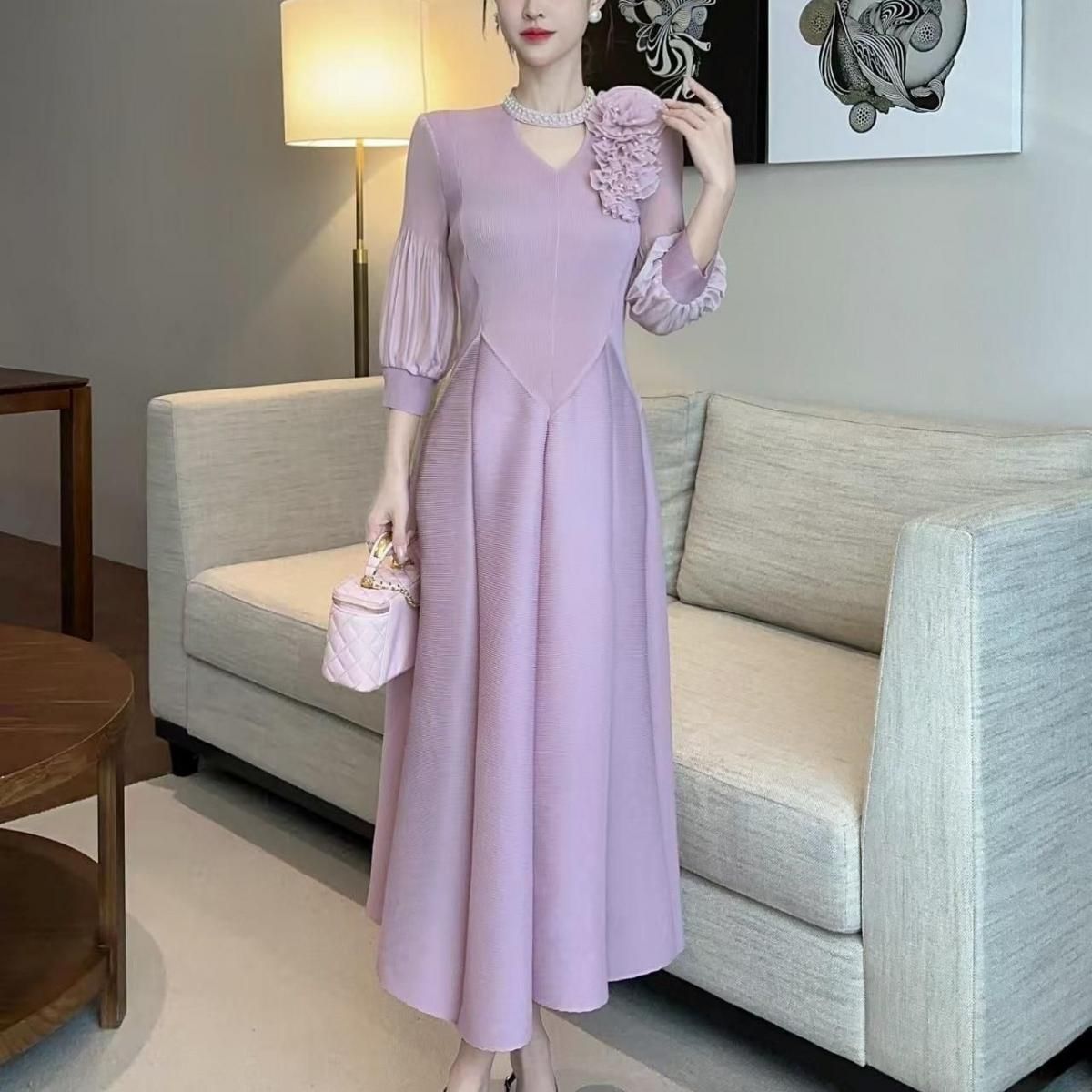 ドレス フラワー パール Vネック チョーカー Aライン ボリュームスリーブ ロング丈 5分袖 きれいめ 上品 結婚式 二次会 パーティー お呼ばれ 5色