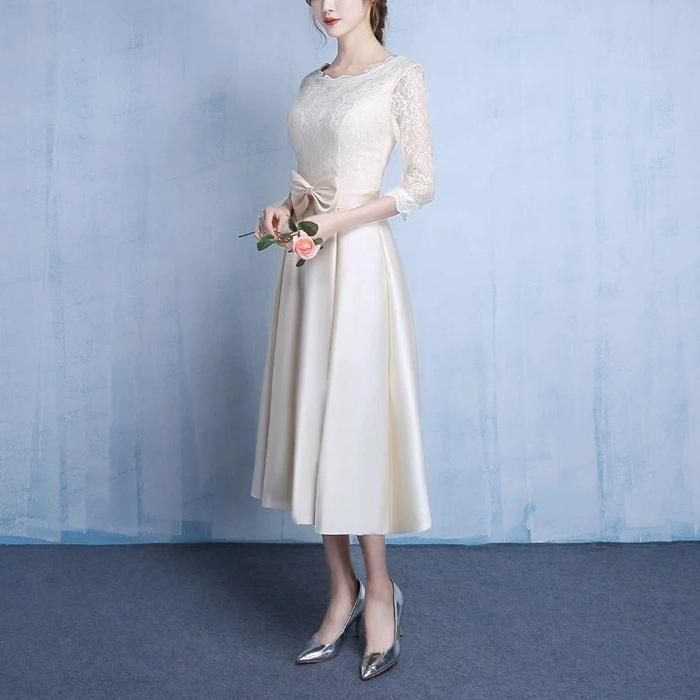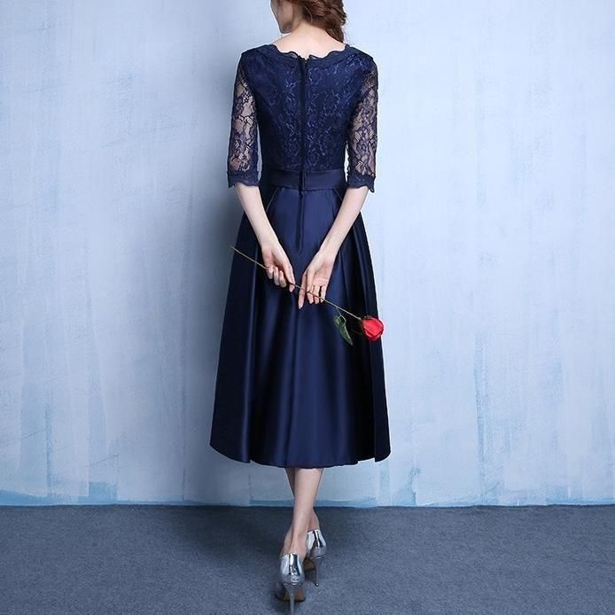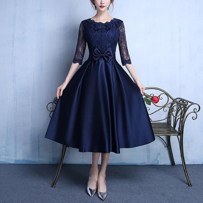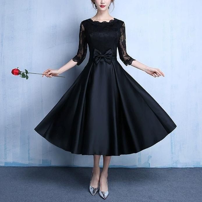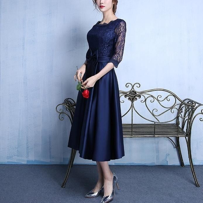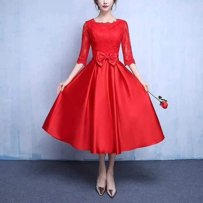 ドレス リボン レース 花柄 サテン ラウンドネック Aライン ロング丈 ミディアム丈 華やか きれいめ 結婚式 二次会 パーティー お呼ばれ 5色 2種