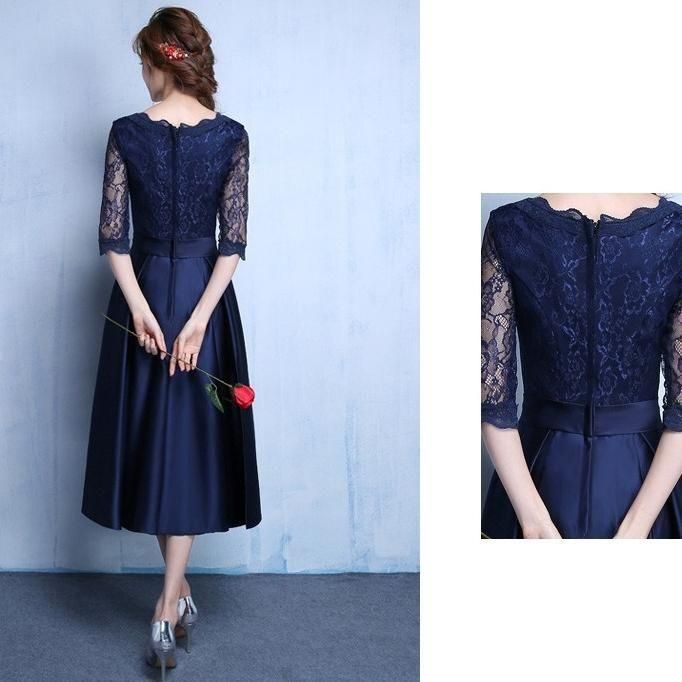 光沢のあるサテン生地にレースが高級感のあるAラインドレス。