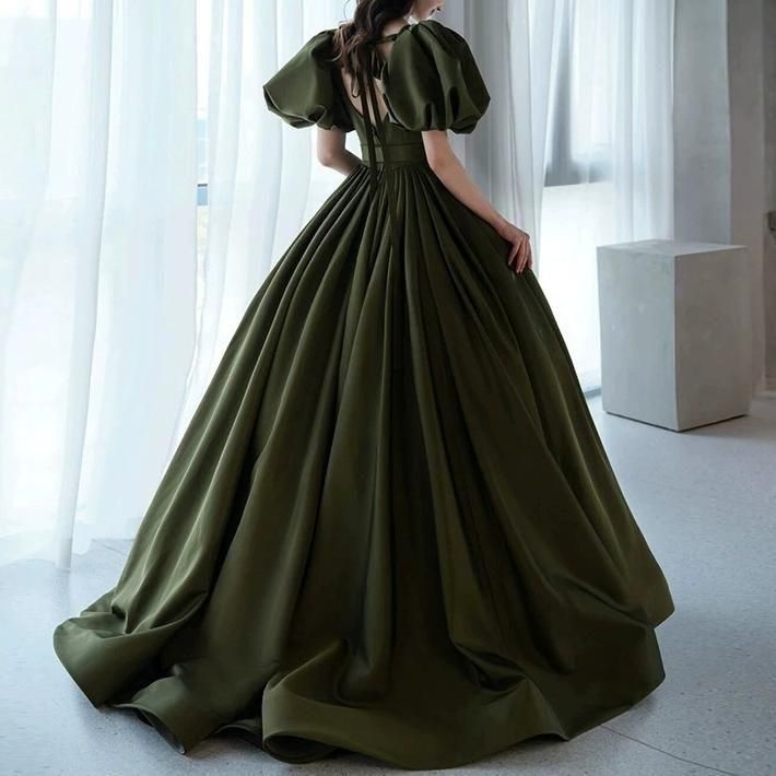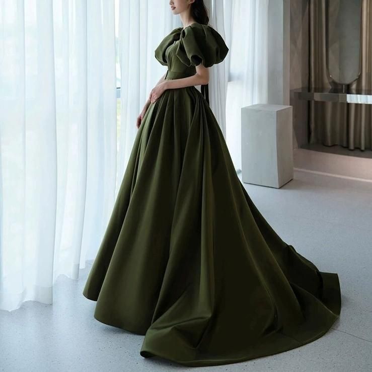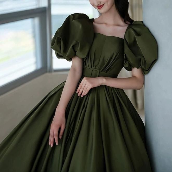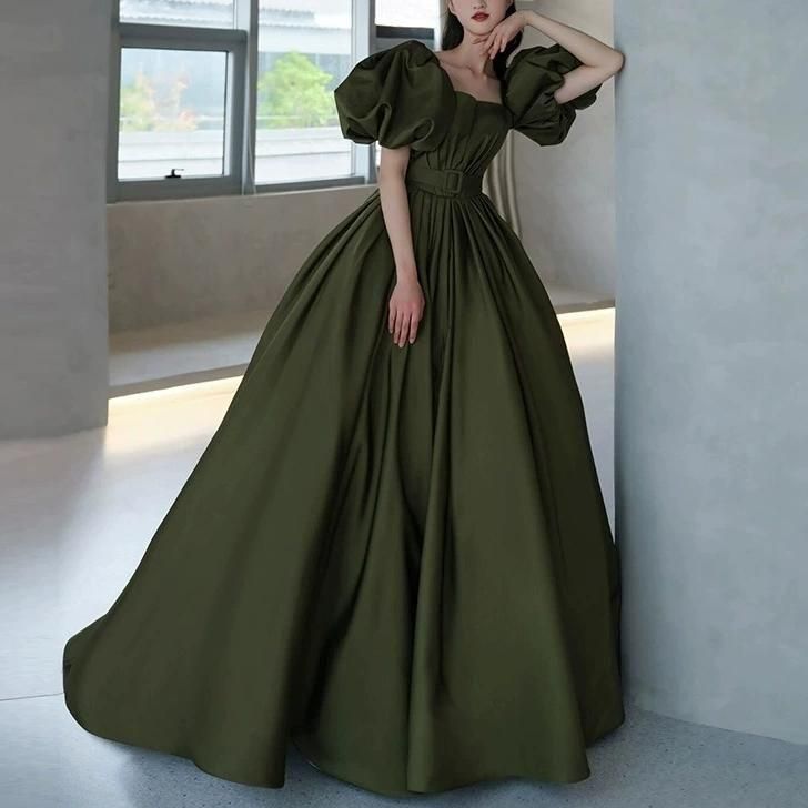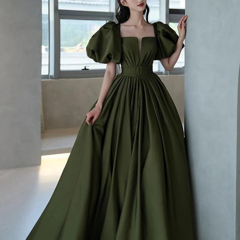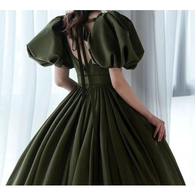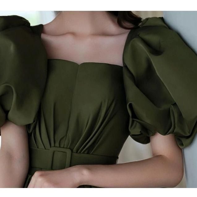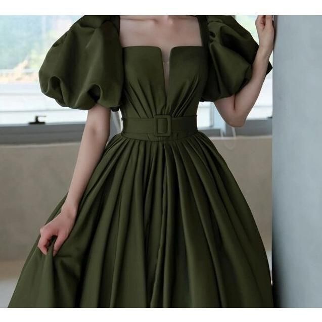 ドレス パフスリーブ スクエアネック ロング丈 Aライン リボン ハイウェスト ウェストマーク 体型カバー エレガント 大人 結婚式 二次会 パーティー お呼ばれ