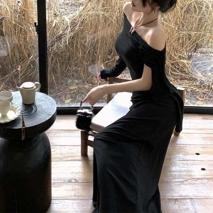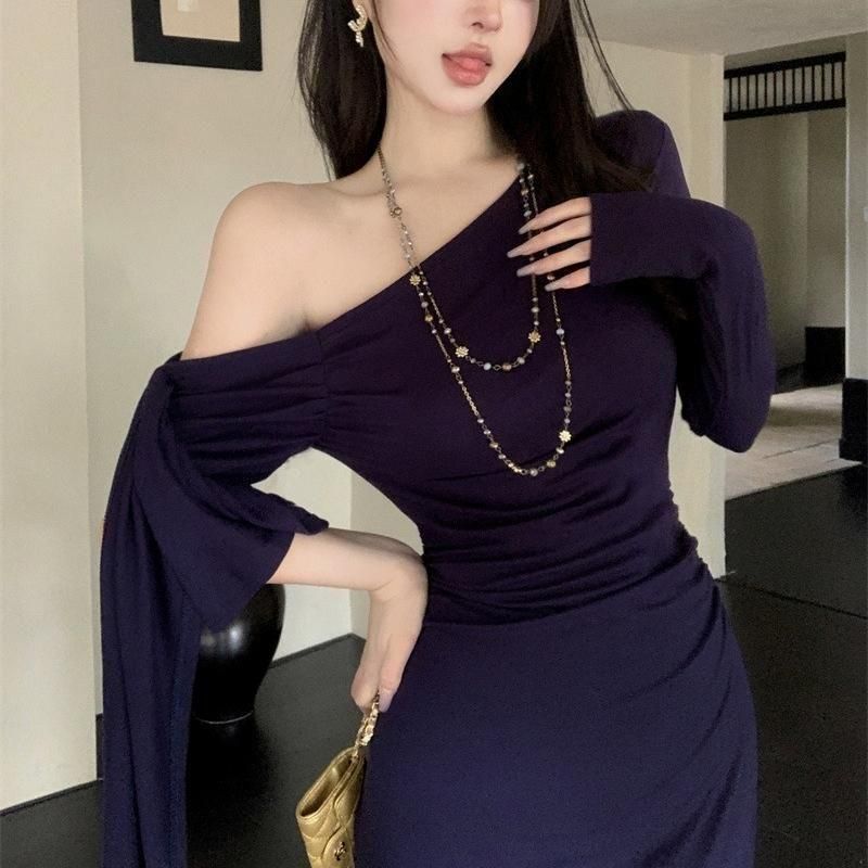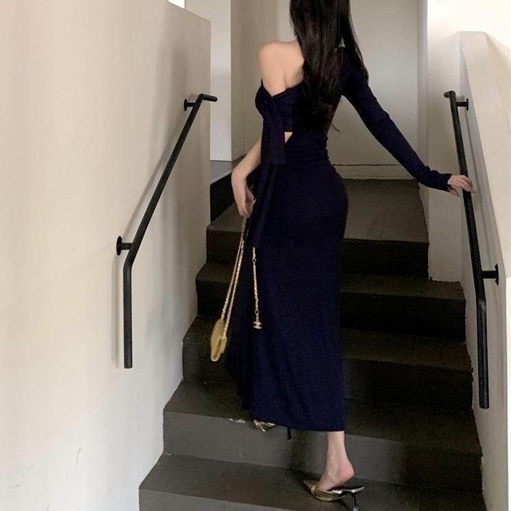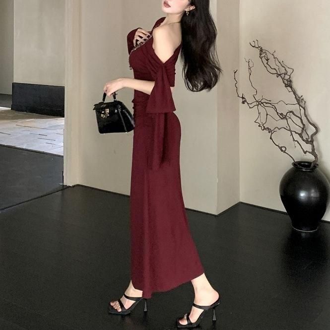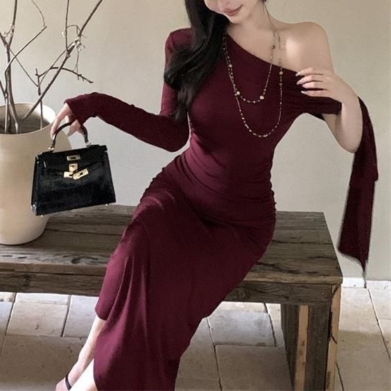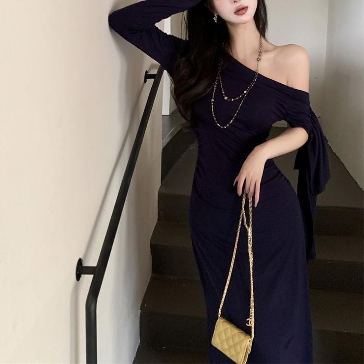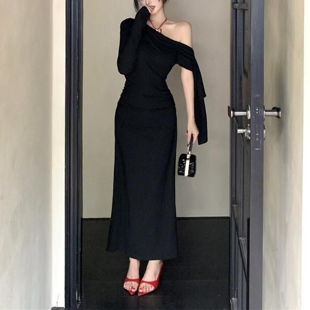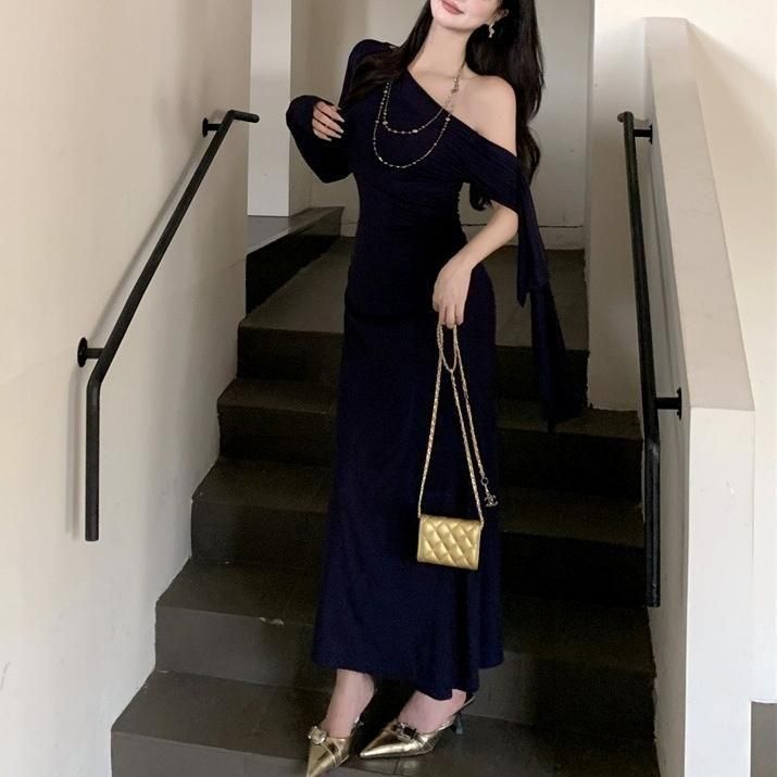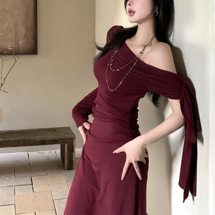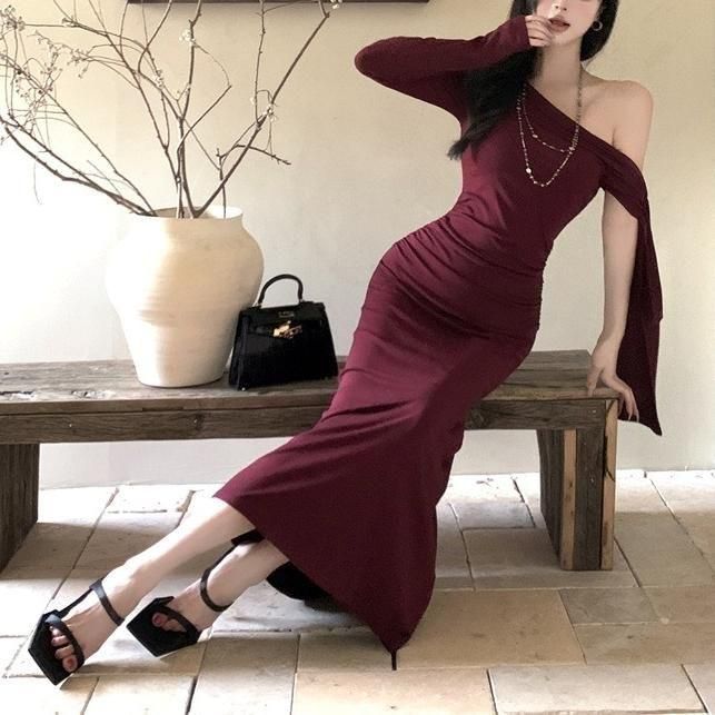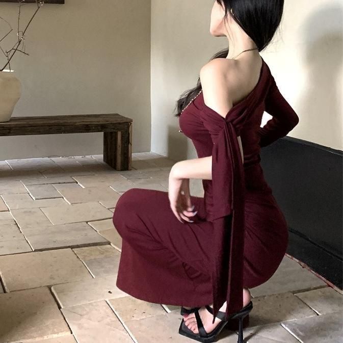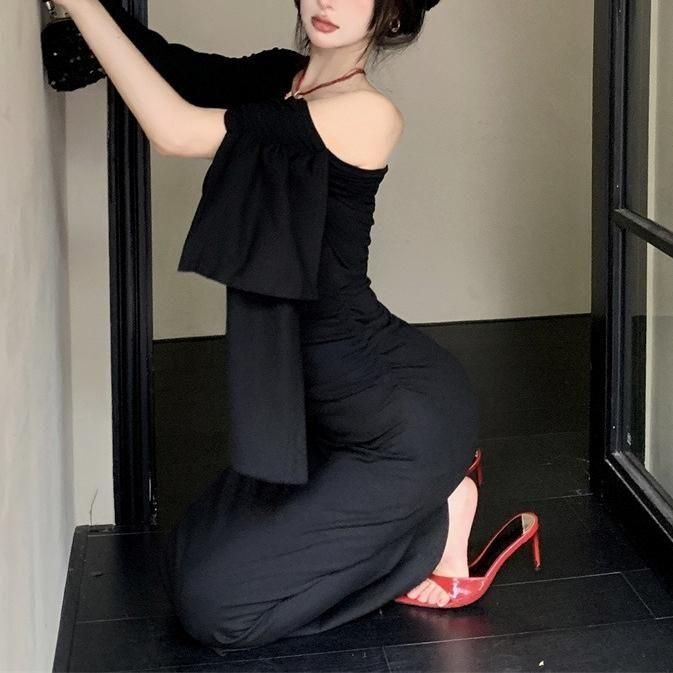 ドレス ワンショルダー タイト ロング丈 Iライン リボン 大人 セクシー エレガント 結婚式 二次会 パーティー ディナー お呼ばれ 3色