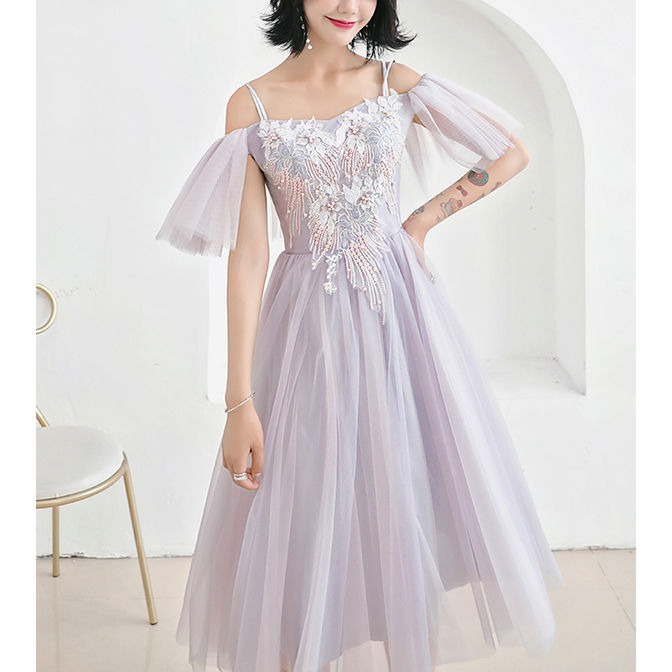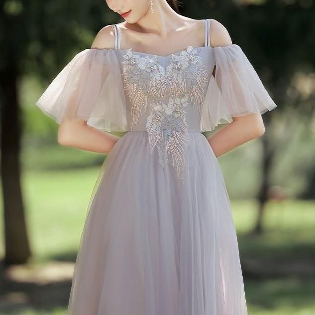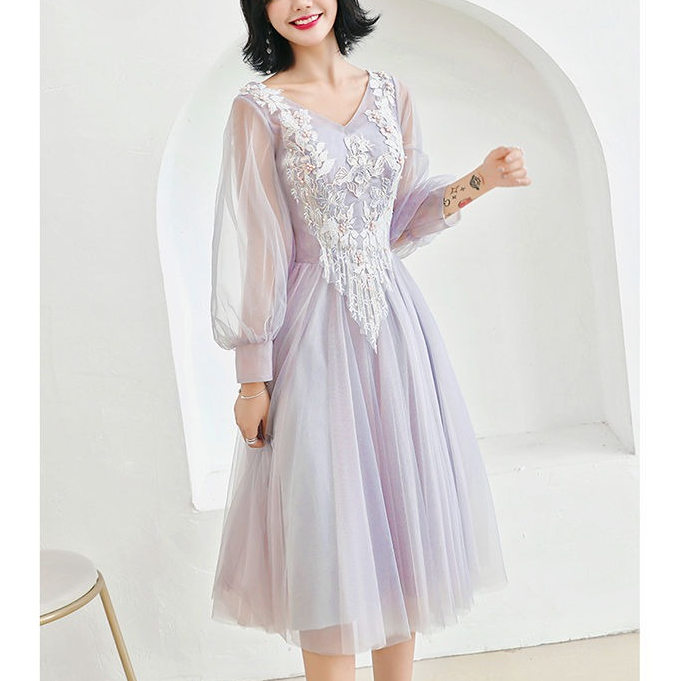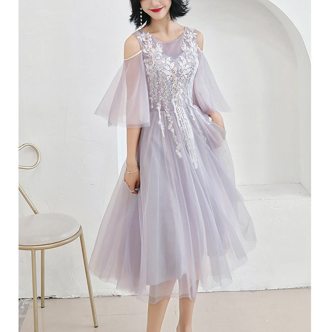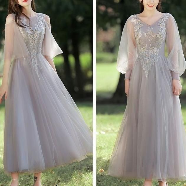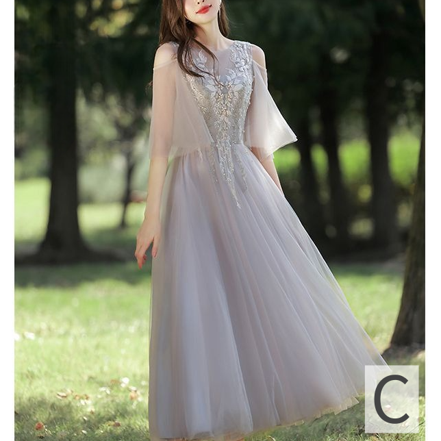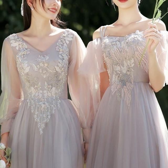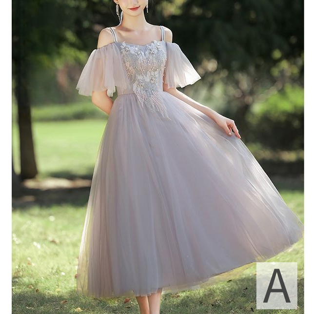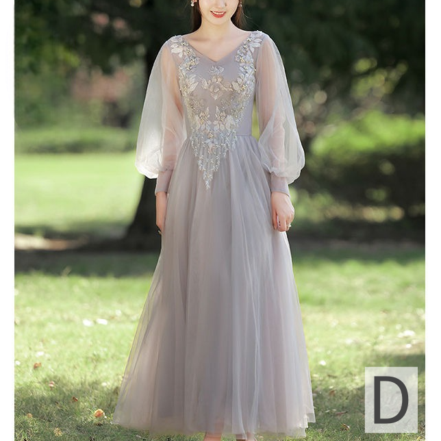 ドレス 花柄 刺繍 パール シアー チュール Aライン ミディアム丈 ロング丈 オフショルダー Vネック ハイウェスト レースアップ 華やか きれいめ 結婚式 二次会 パーティー お呼ばれ 8種