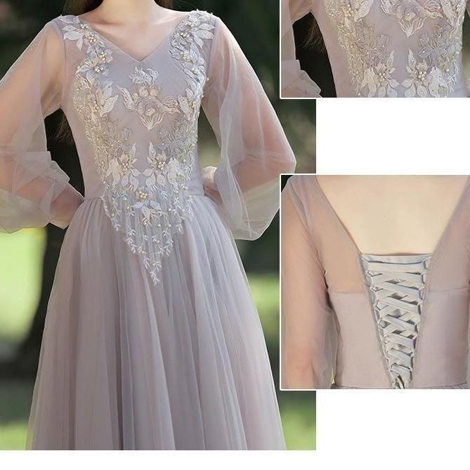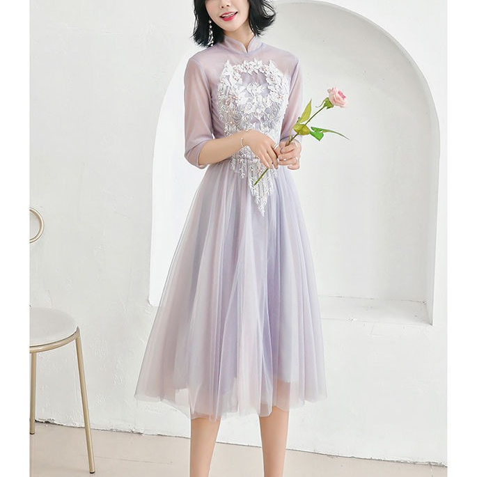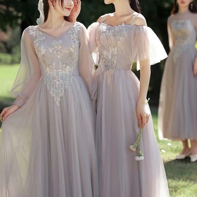 落ち着いたグレーに胸元の花柄刺繍やパールが華やかな印象。