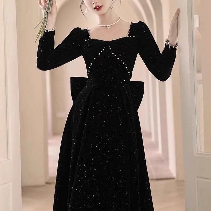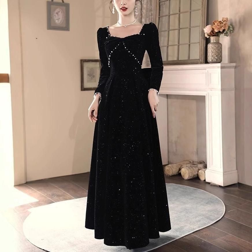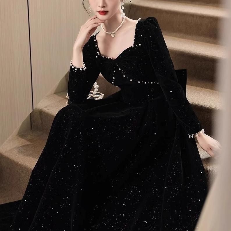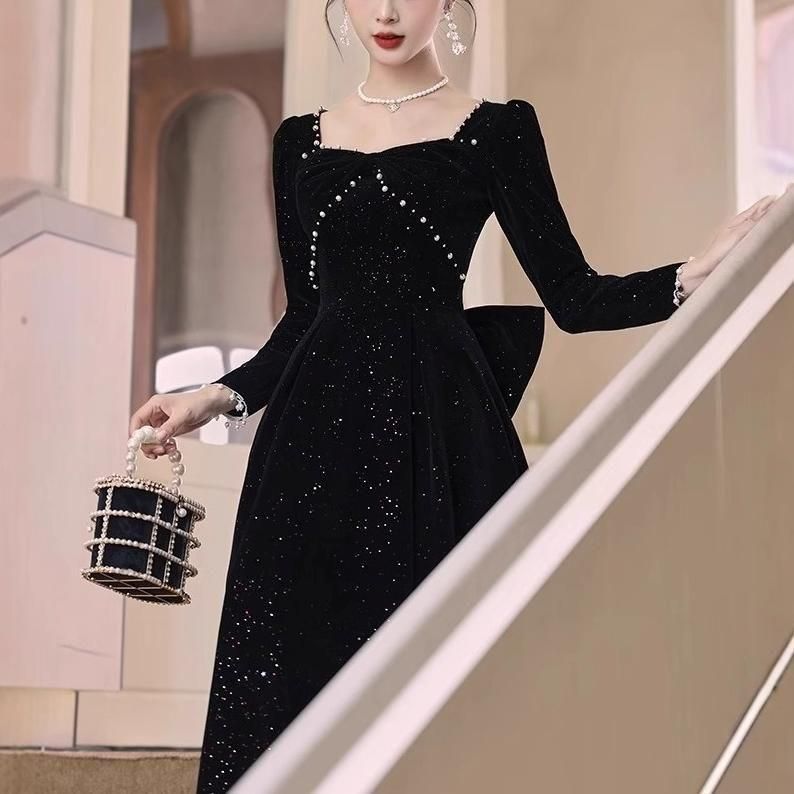 黒地にラメやパールが上品かつ華やかなロングドレス。