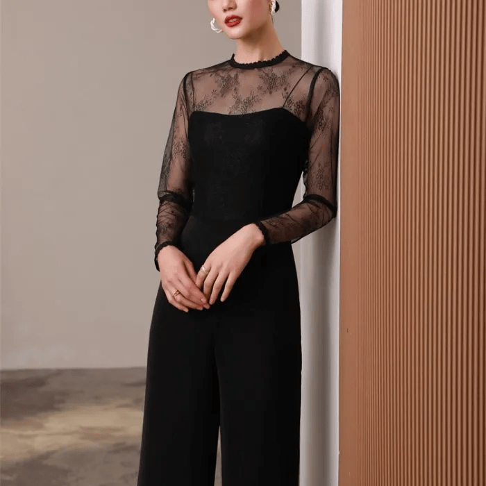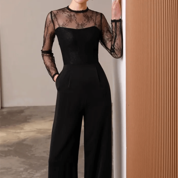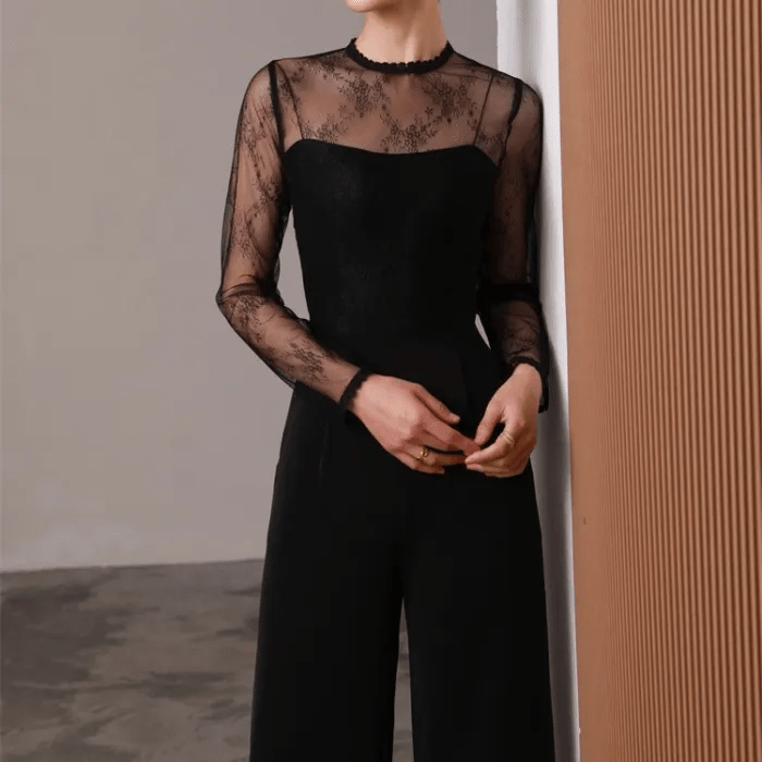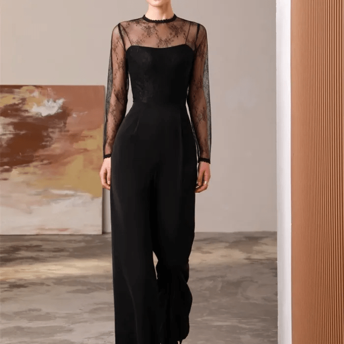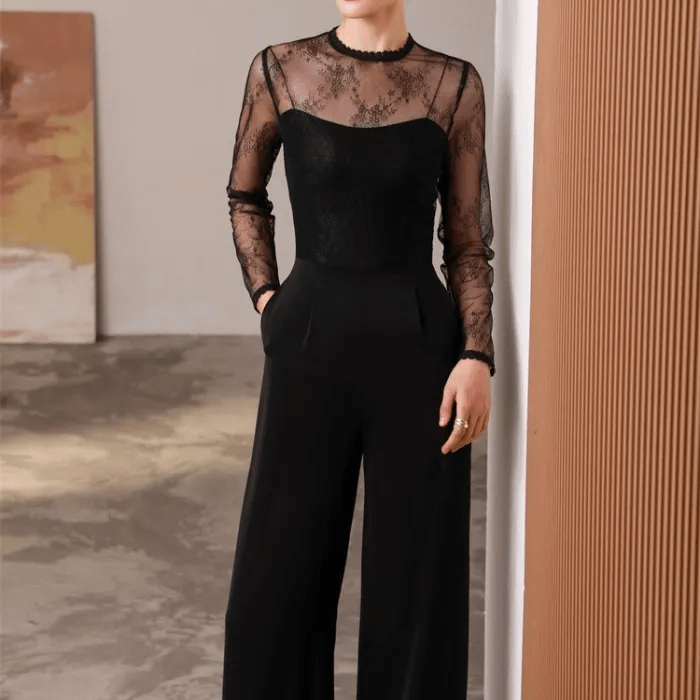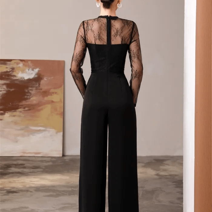 【即納商品】オールインワン シースルー レース クルーネック マーフレアパンツ コルセット ビスチェ ロング丈 大人 エレガント 二次会 お呼ばれ パーティー