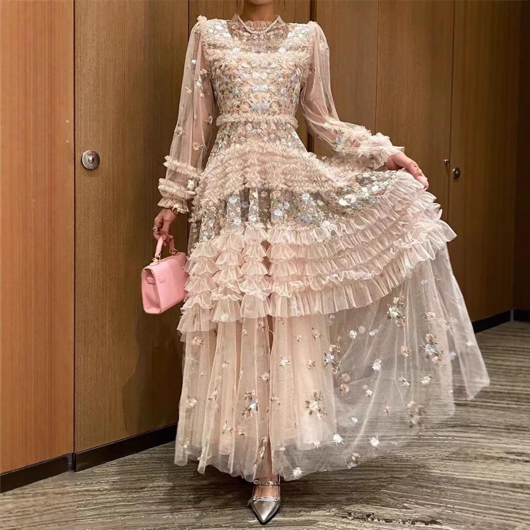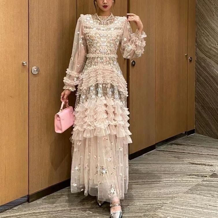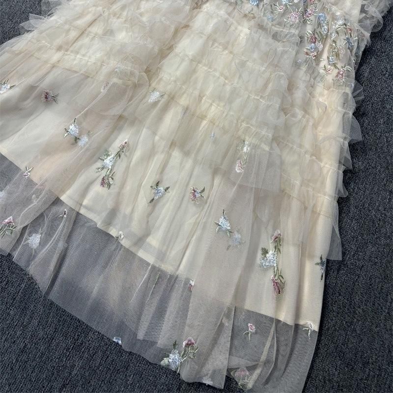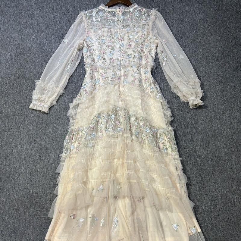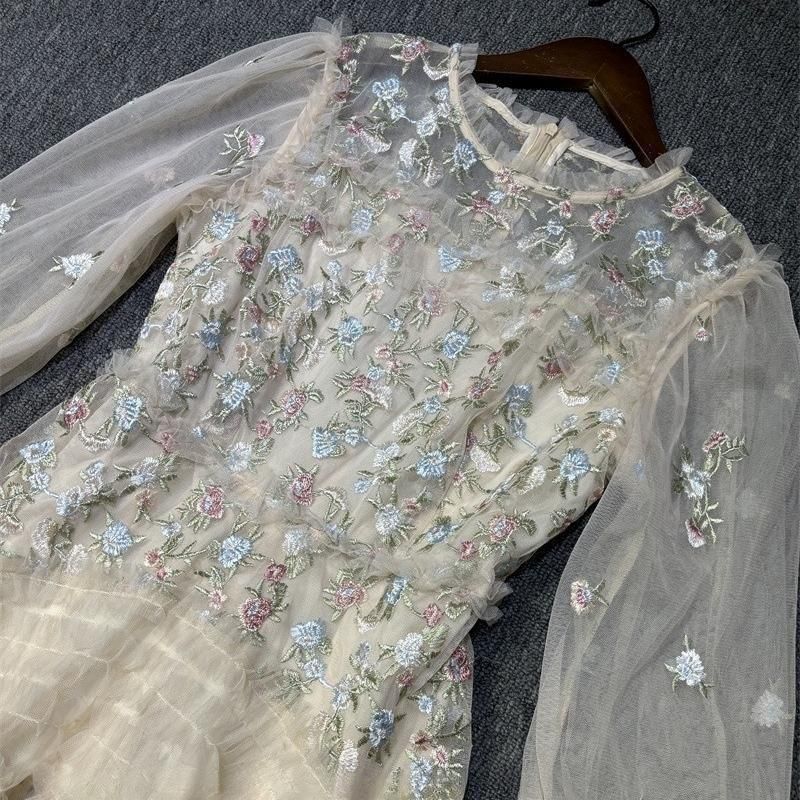 ふんだんにあしらわれた花柄刺繍やフリルが魅力。