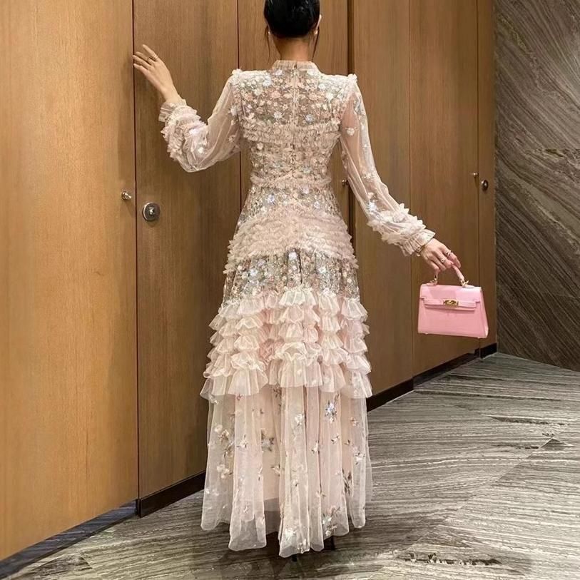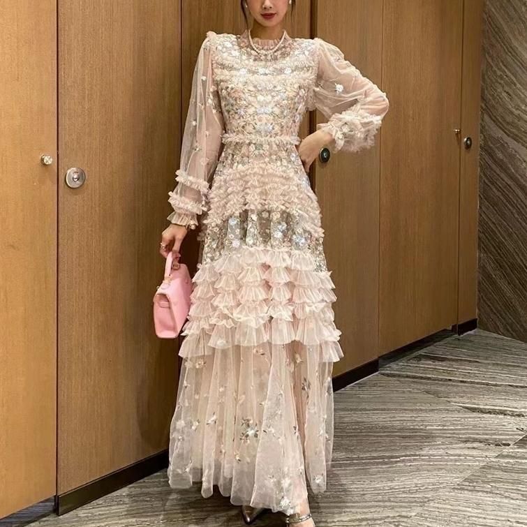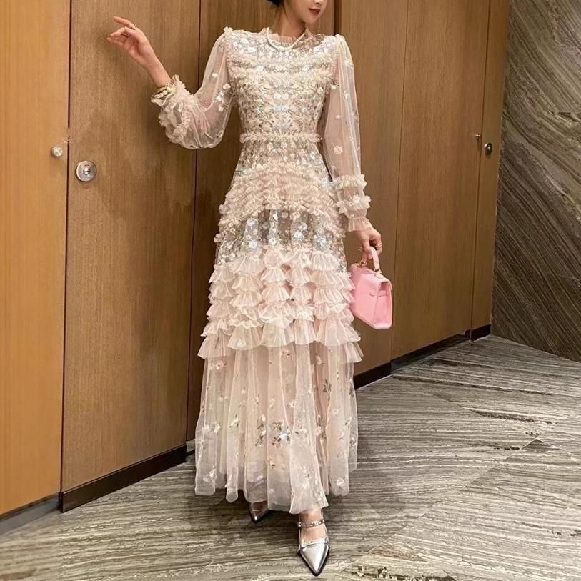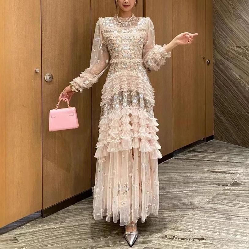 ふんだんにあしらわれた花柄刺繍やフリルが魅力。