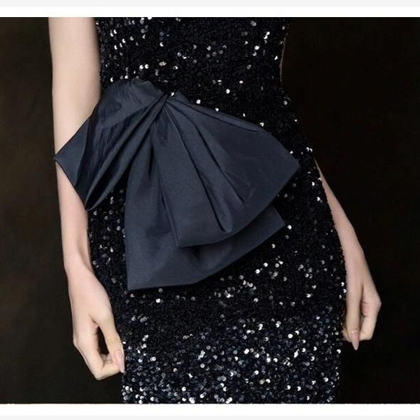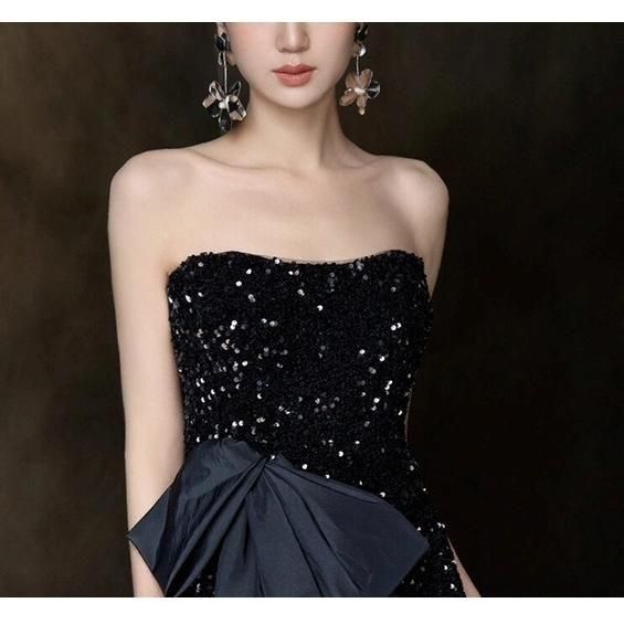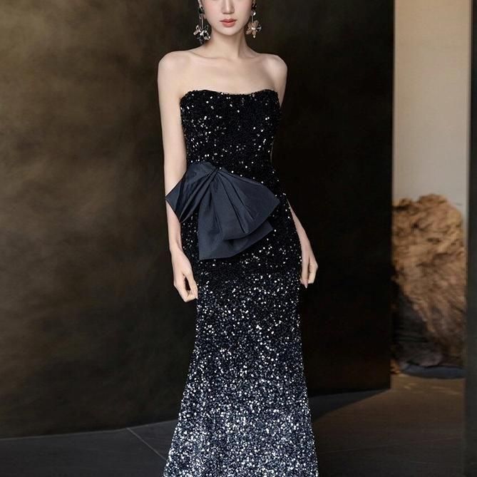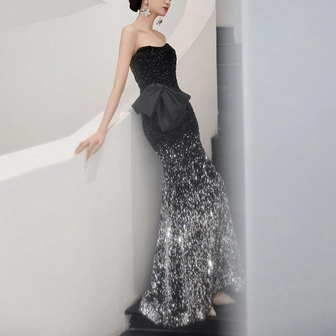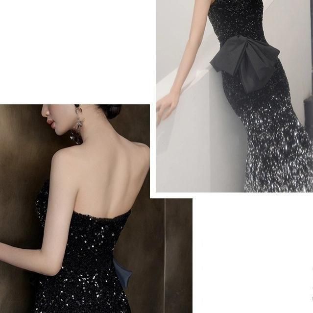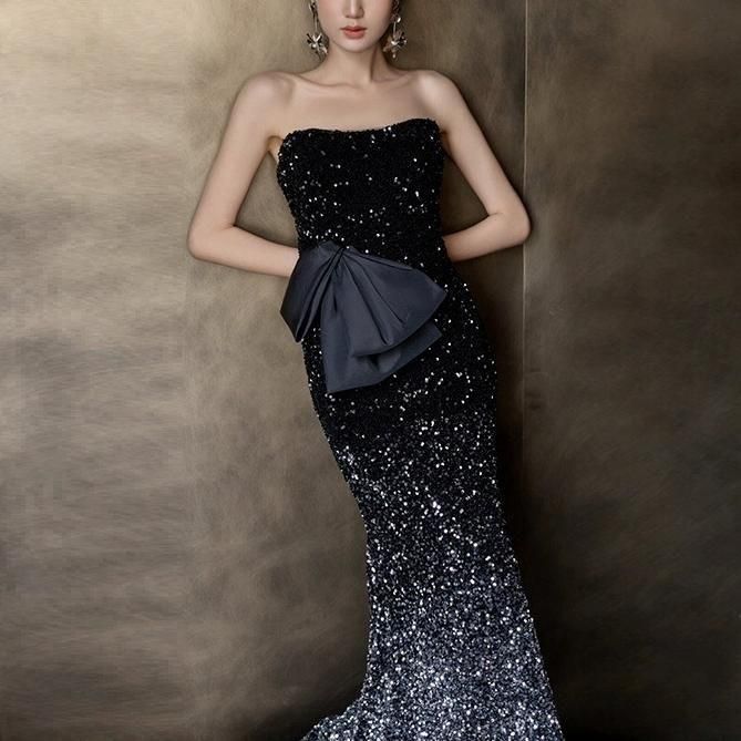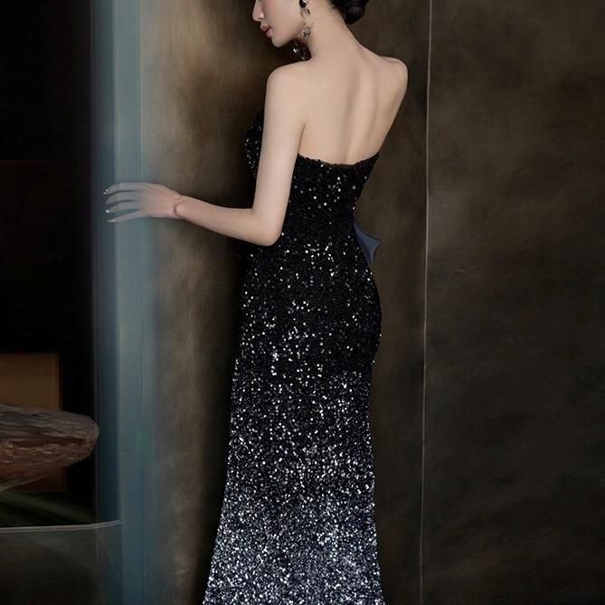 ドレス スパンコール グラデーション チューブトップ リボン Iライン ロング丈 エレガント ゴージャス 大人 二次会 発表会 お呼ばれ パーティー